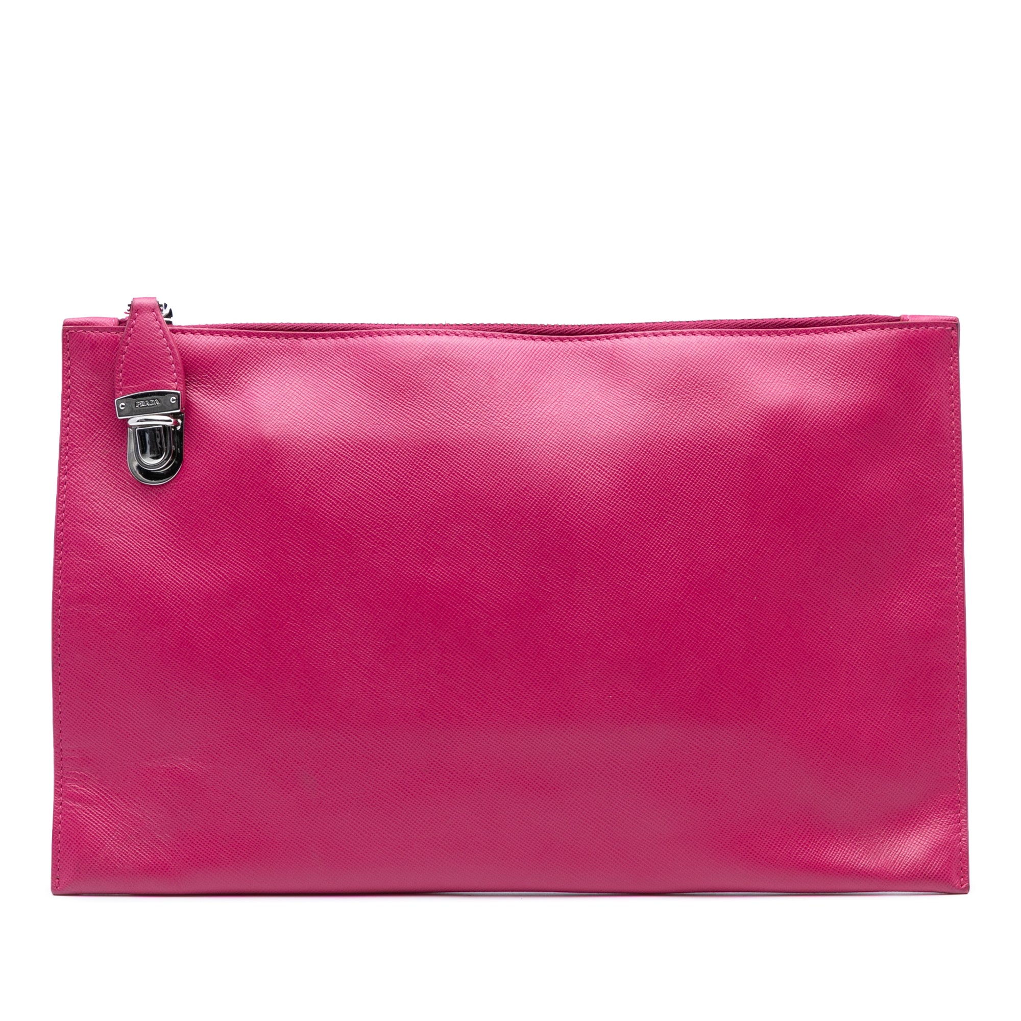 This clutch bag features a saffiano leather body, top zip closure with metal lock closure, and interior zip and slip pockets. Retail Price: 800.00
