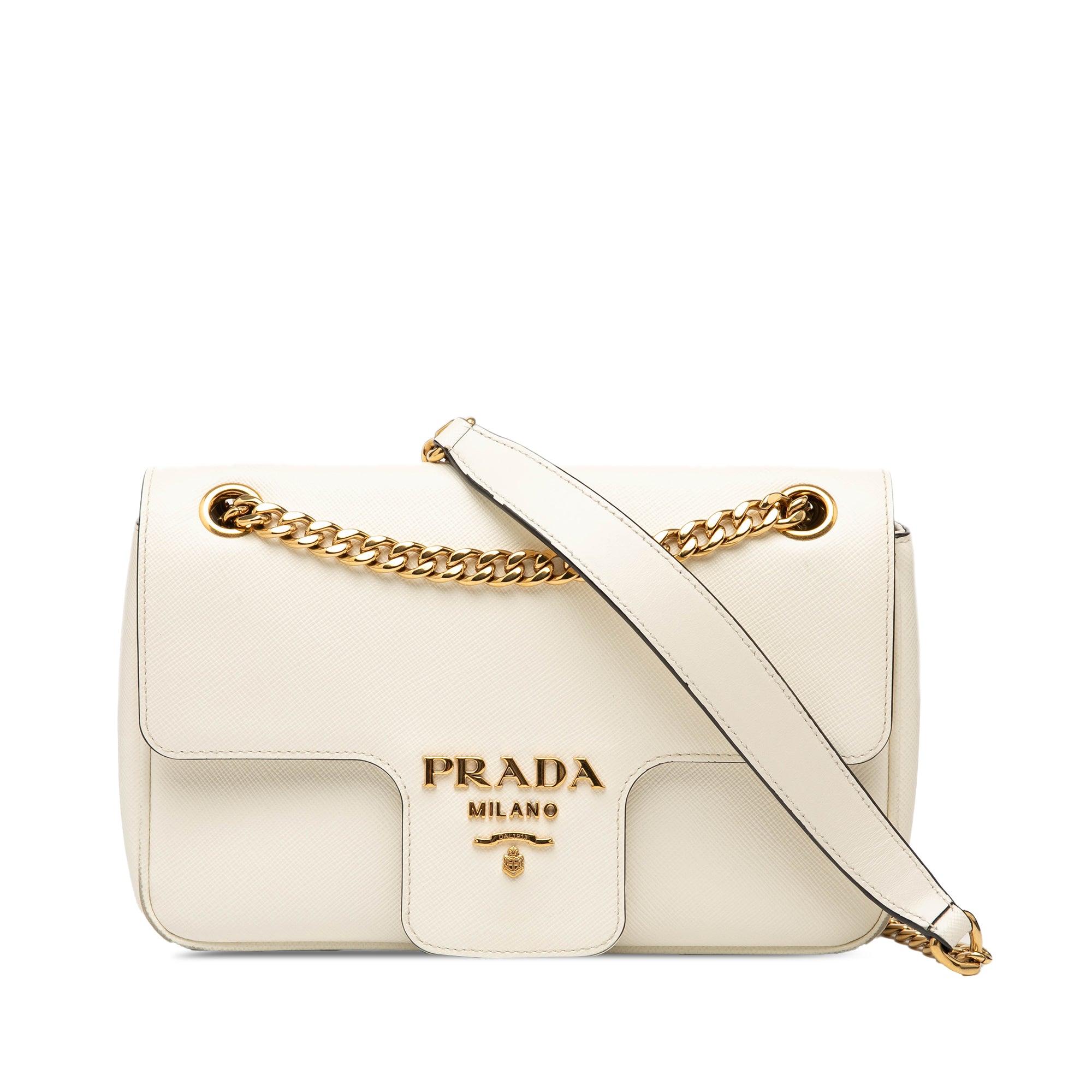 This crossbody bag features a saffiano leather body, a chain link strap with leather guard, a flap with magnetic snap closure, and interior zip and slip pockets. Inclusion: Dust bag. Retail Price: 2190.00