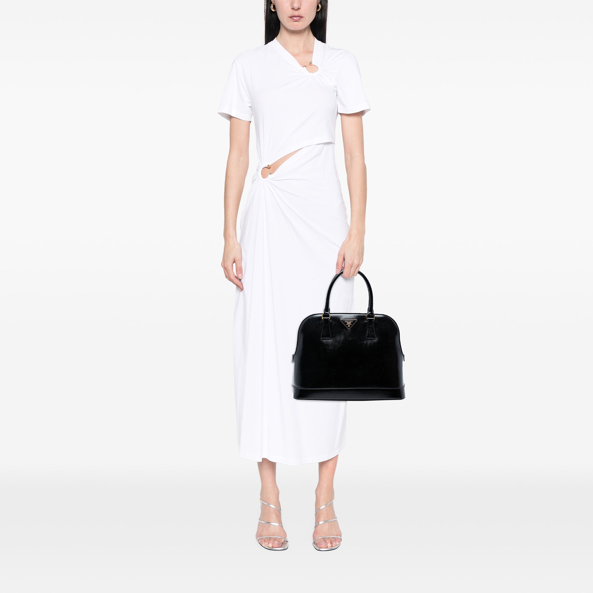 This satchel features a saffiano leather body, rolled leather handles, a top zip closure, and interior zip and slip pockets. Retail Price: 2200.00