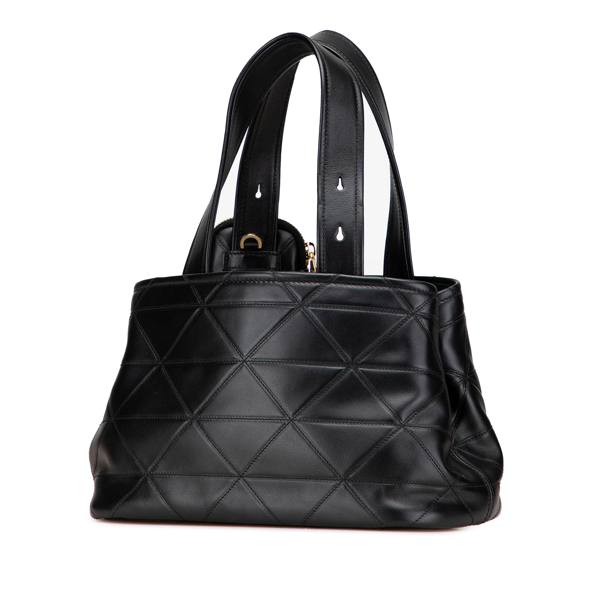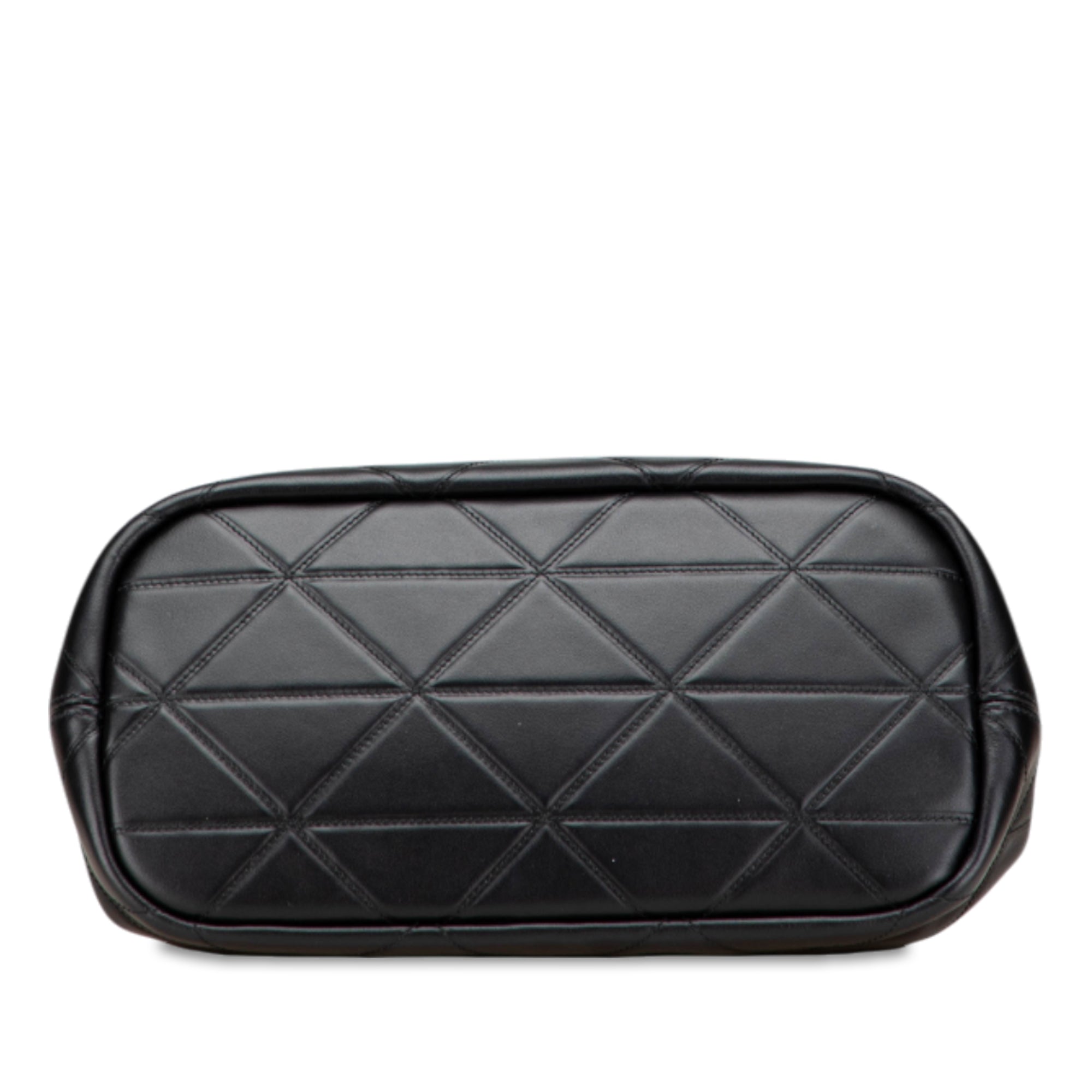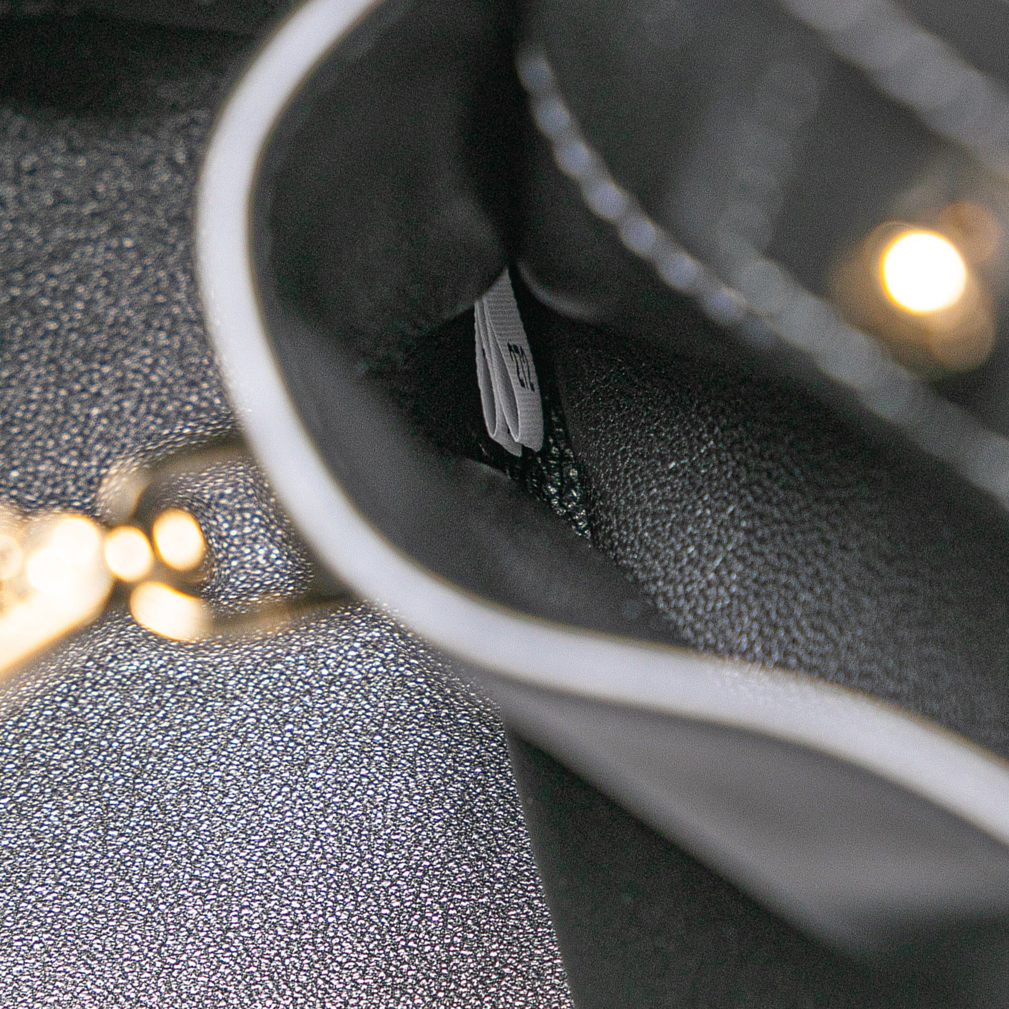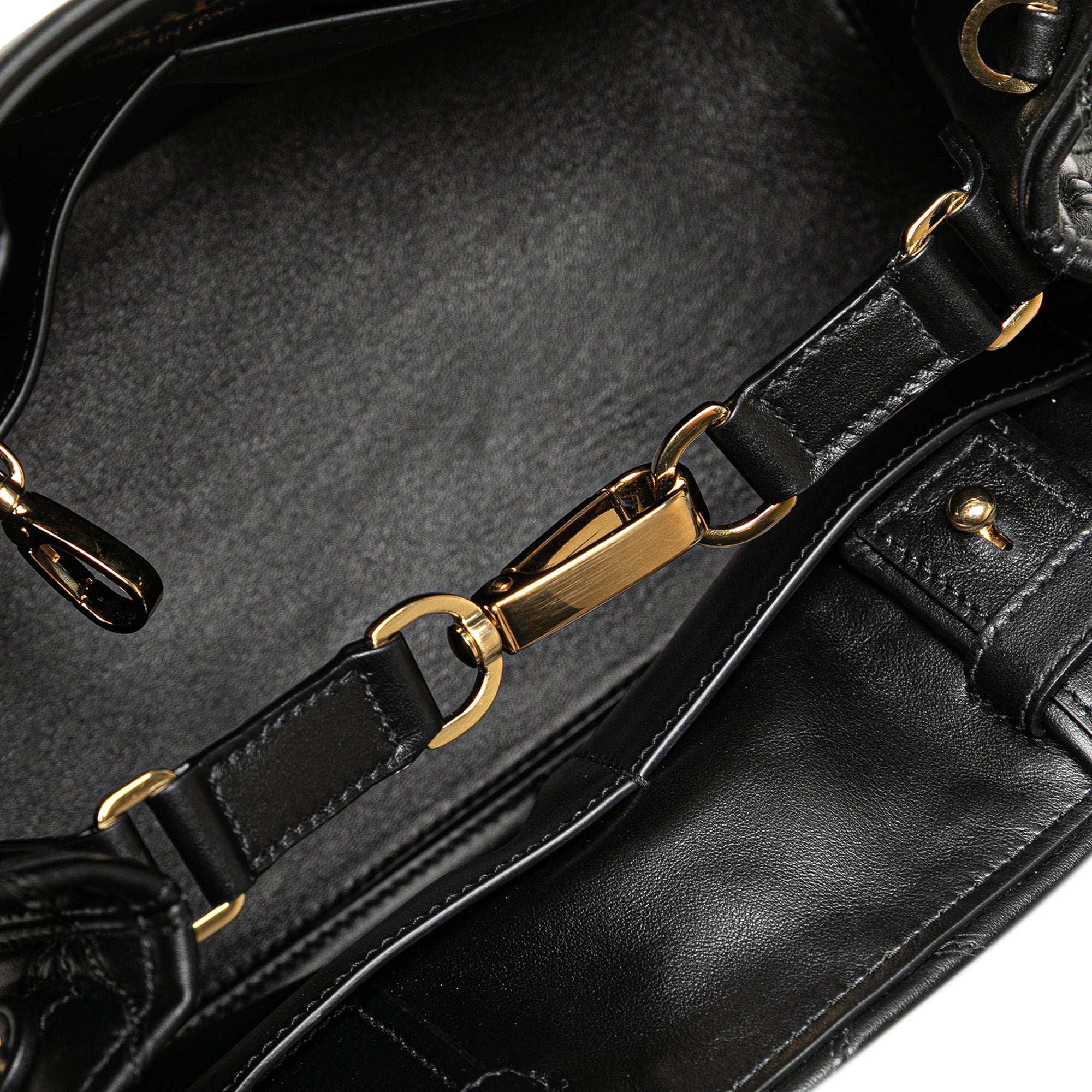 This satchel features a quilted lambskin body, flat handles, a detachable flat leather strap, an open top with lobster hook closure, interior slip pockets, and a detachable zip pouch. Inclusion: Dust bag. Retail Price: 3909.00