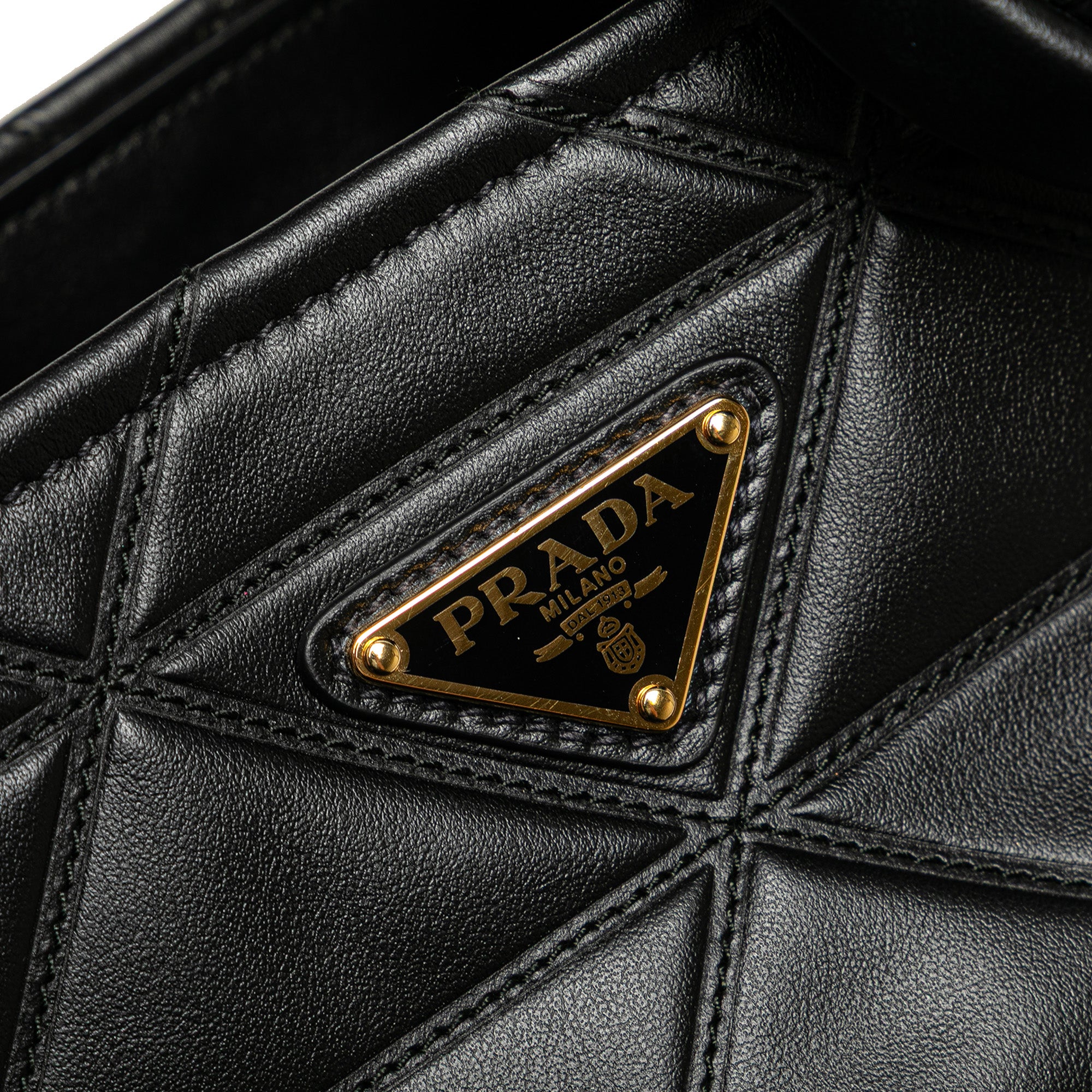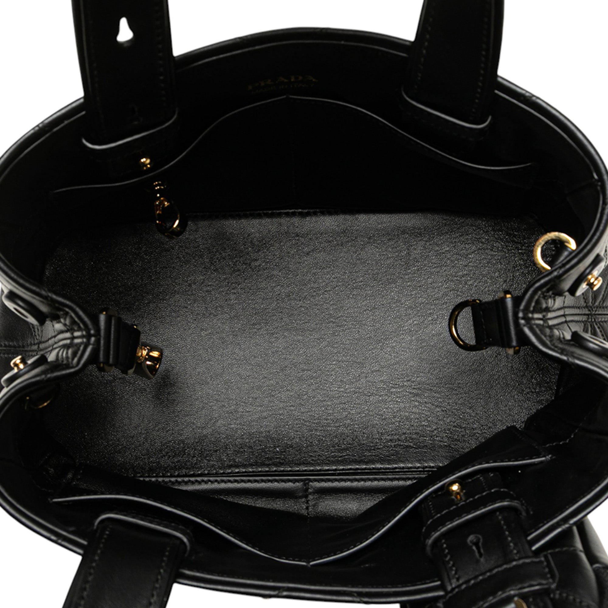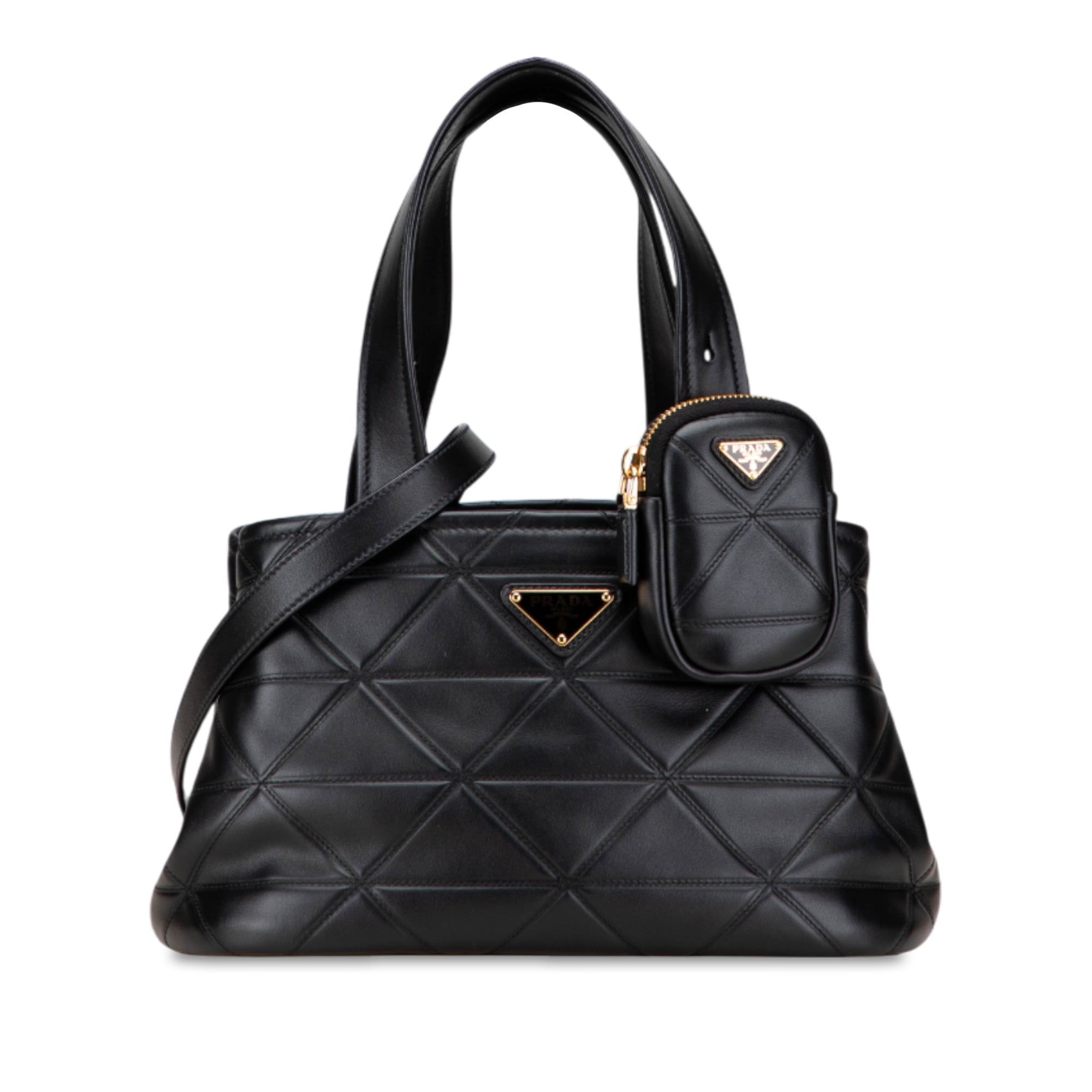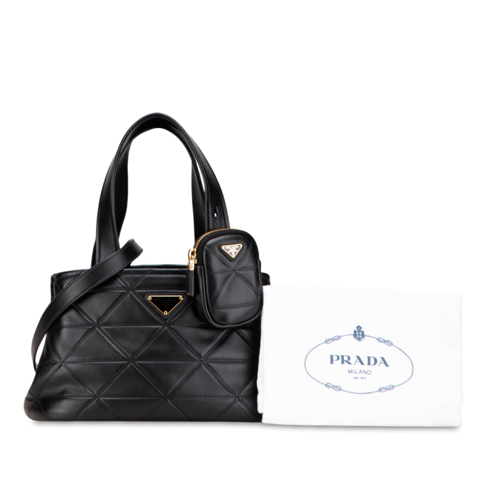 This satchel features a quilted lambskin body, flat handles, a detachable flat leather strap, an open top with lobster hook closure, interior slip pockets, and a detachable zip pouch. Inclusion: Dust bag. Retail Price: 3909.00