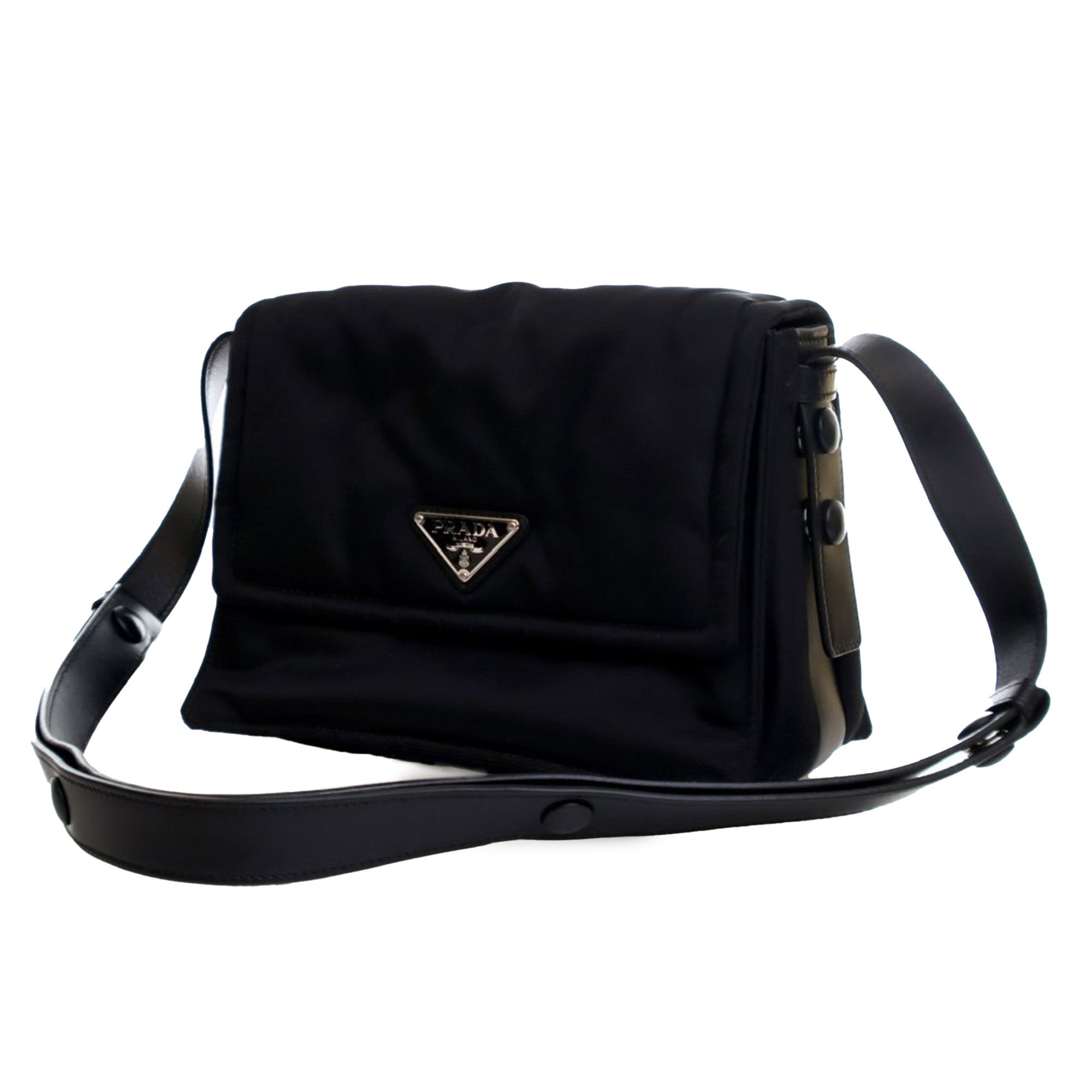 This shoulder bag features a nylon body with leather trim, a flat leather shoulder strap, a front flap with snap closure, an exterior back zip pocket, and an interior zip pocket. Inclusion: Dust bag, authenticity card. Retail Price: 2600.00