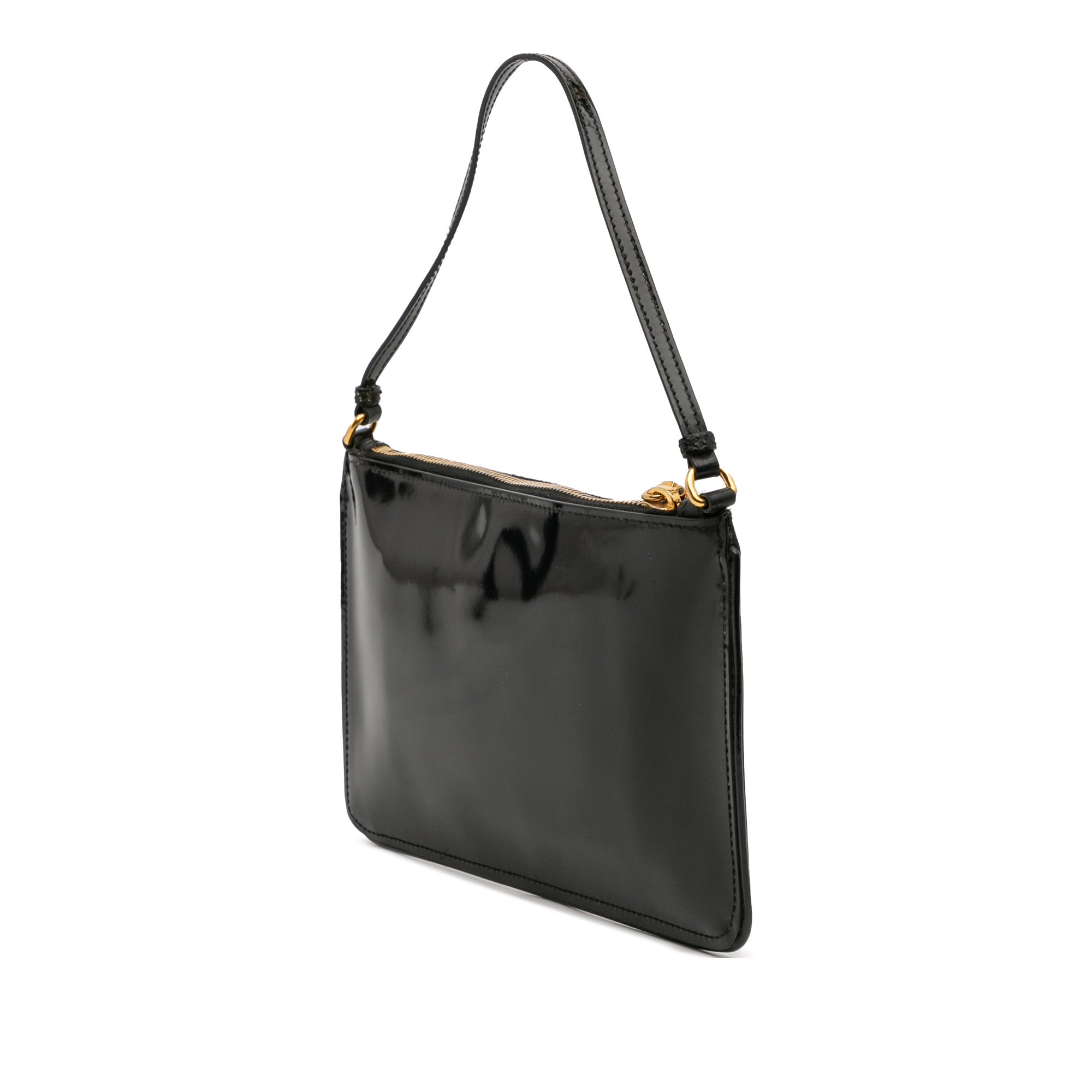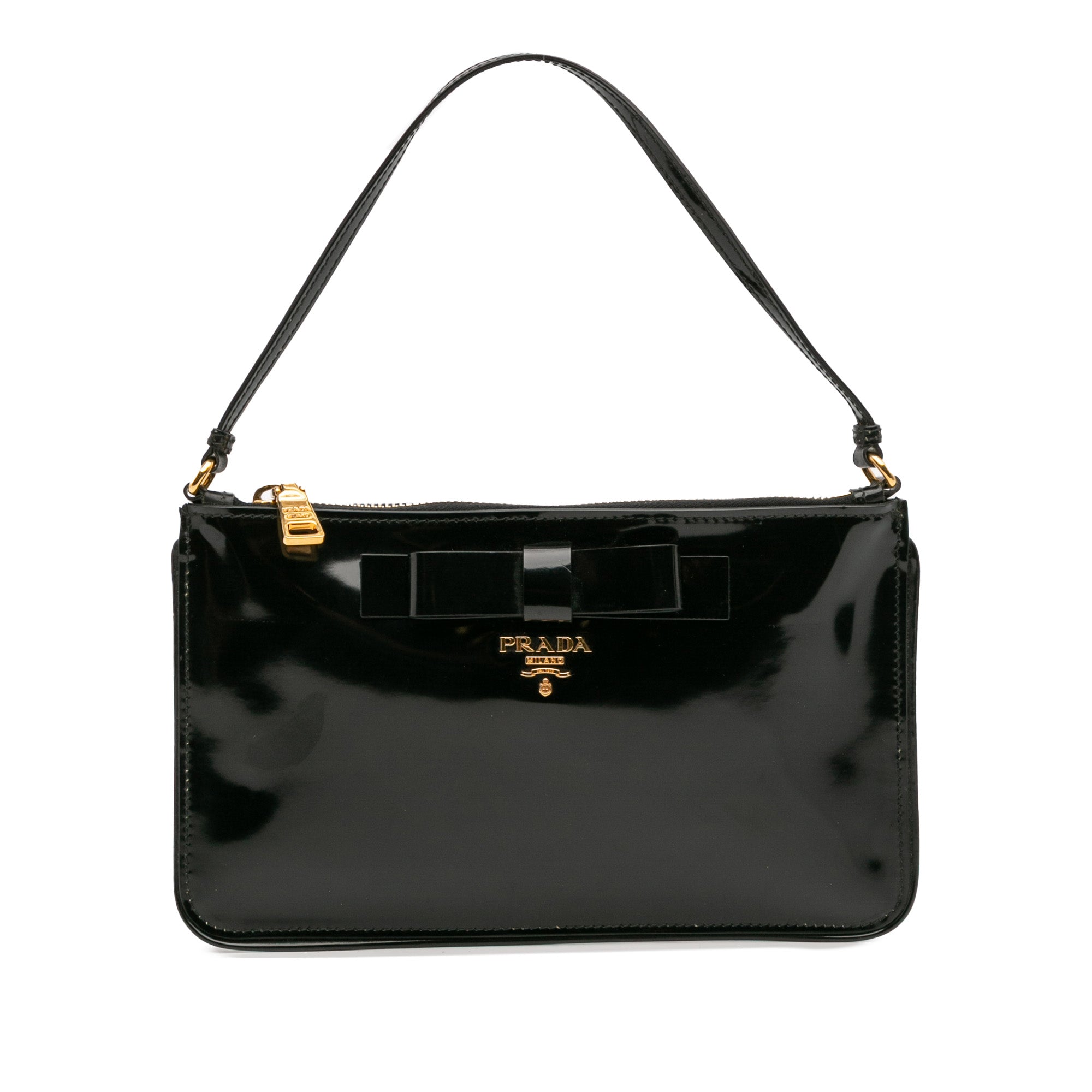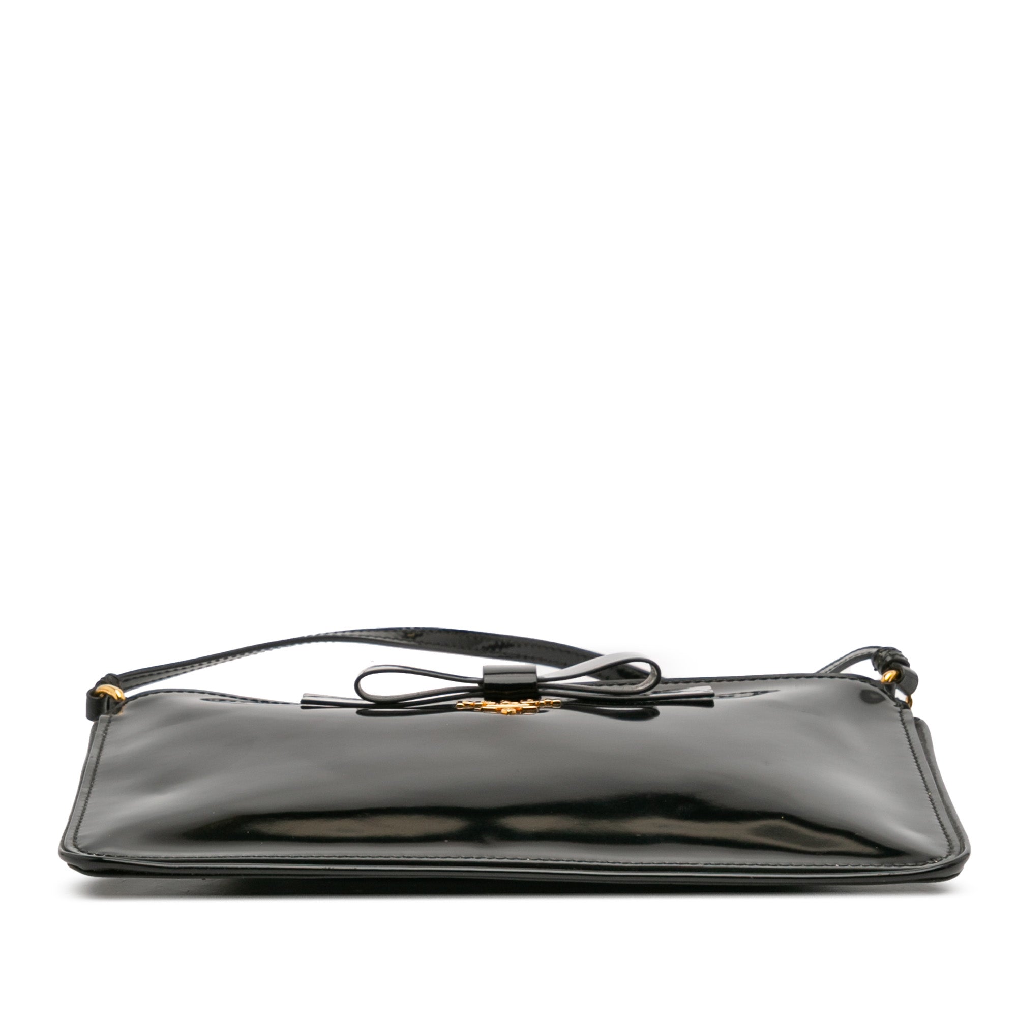 This shoulder bag features a patent leather body with bow detail, a flat leather strap, and a top zip closure. Retail Price: 2520.00