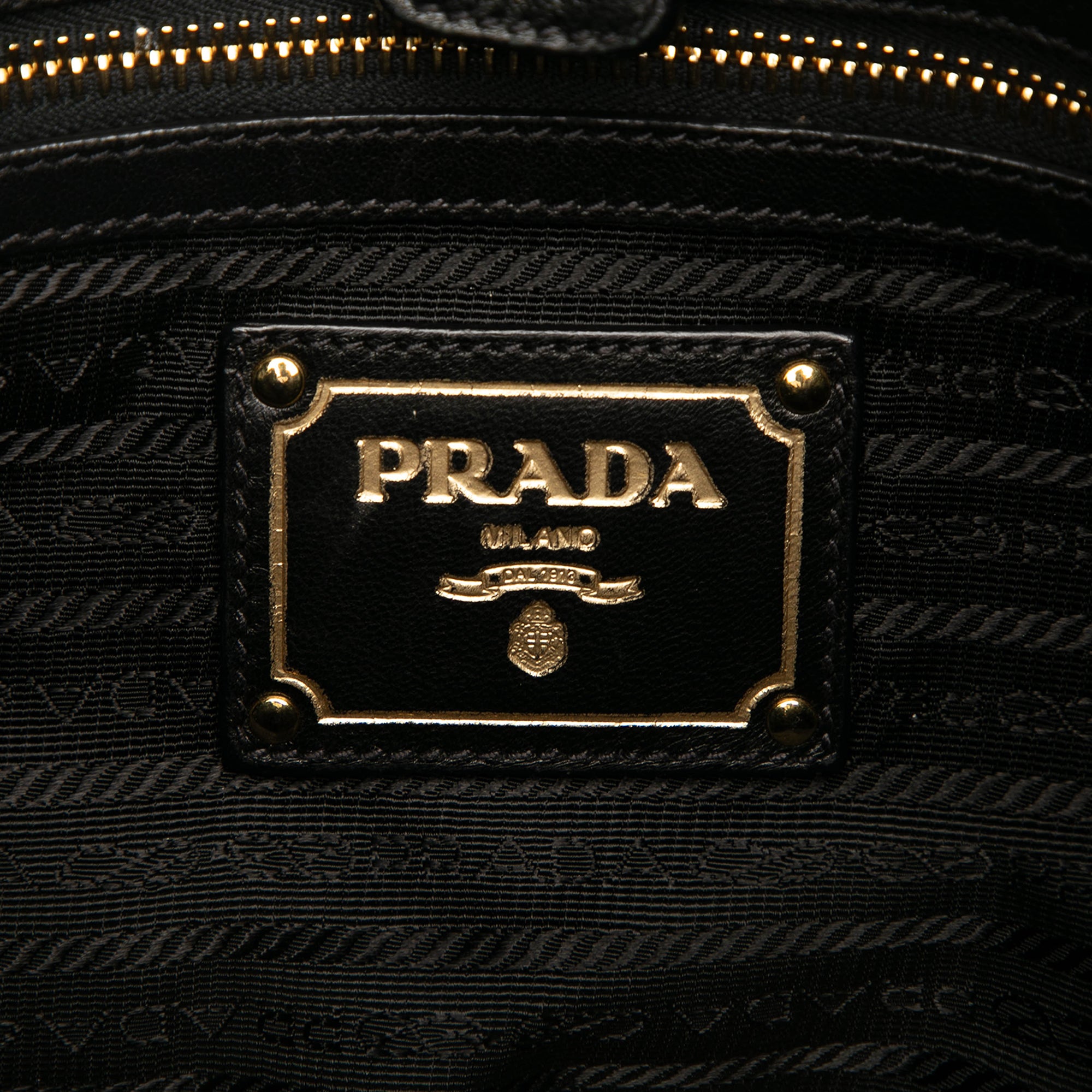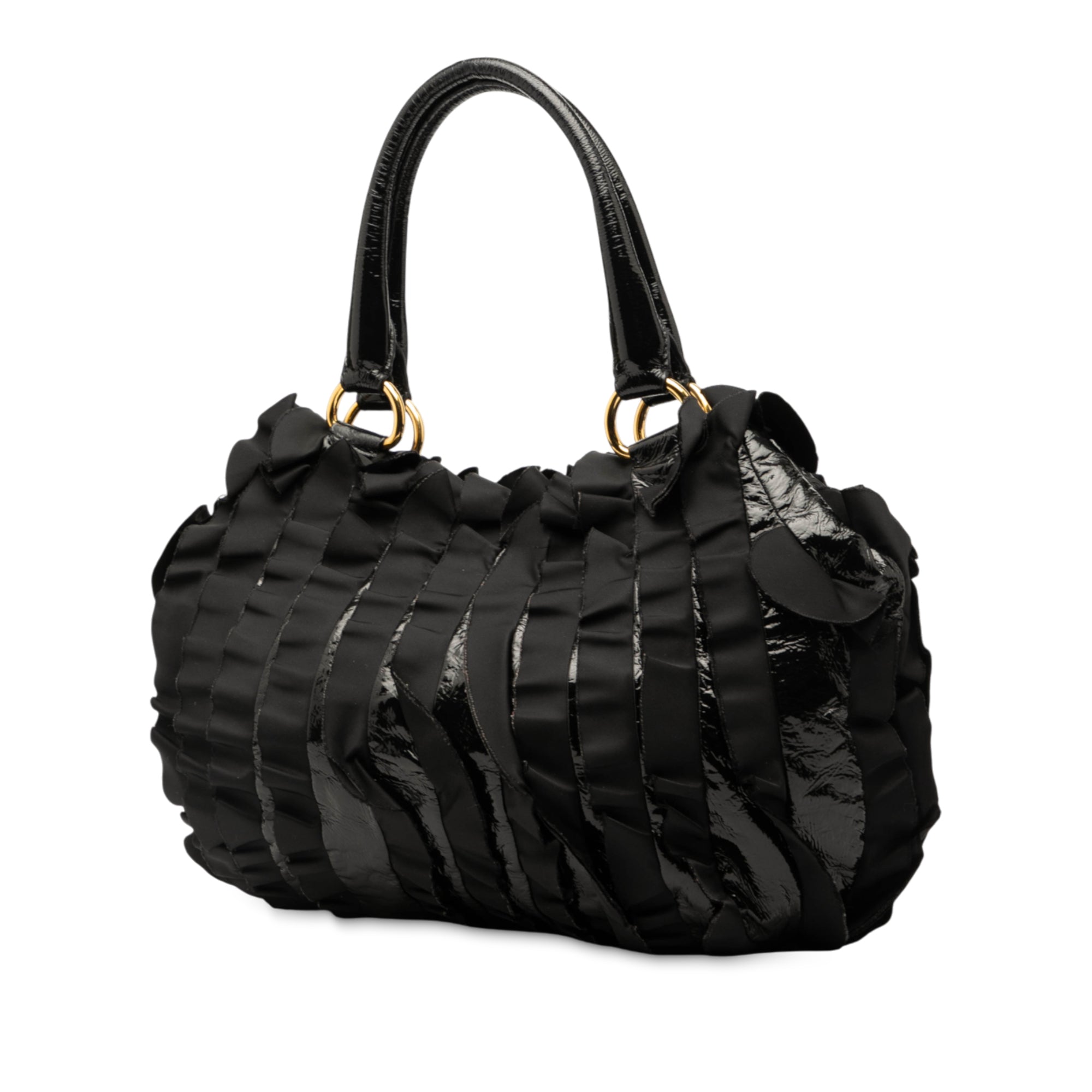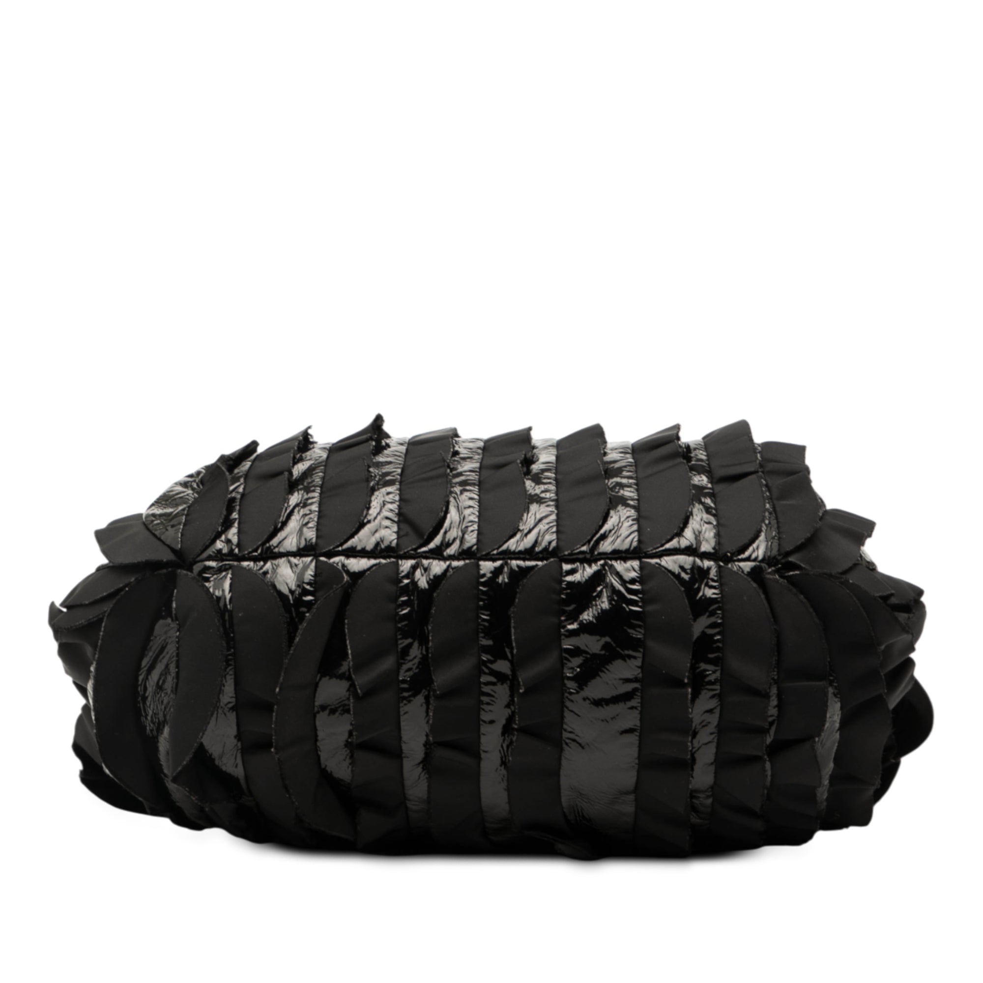 This tote features a patent leather body with nylon ruffle details, rolled patent leather handles, a top snap button closure, and interior zip pockets. Retail Price: 1150.00
