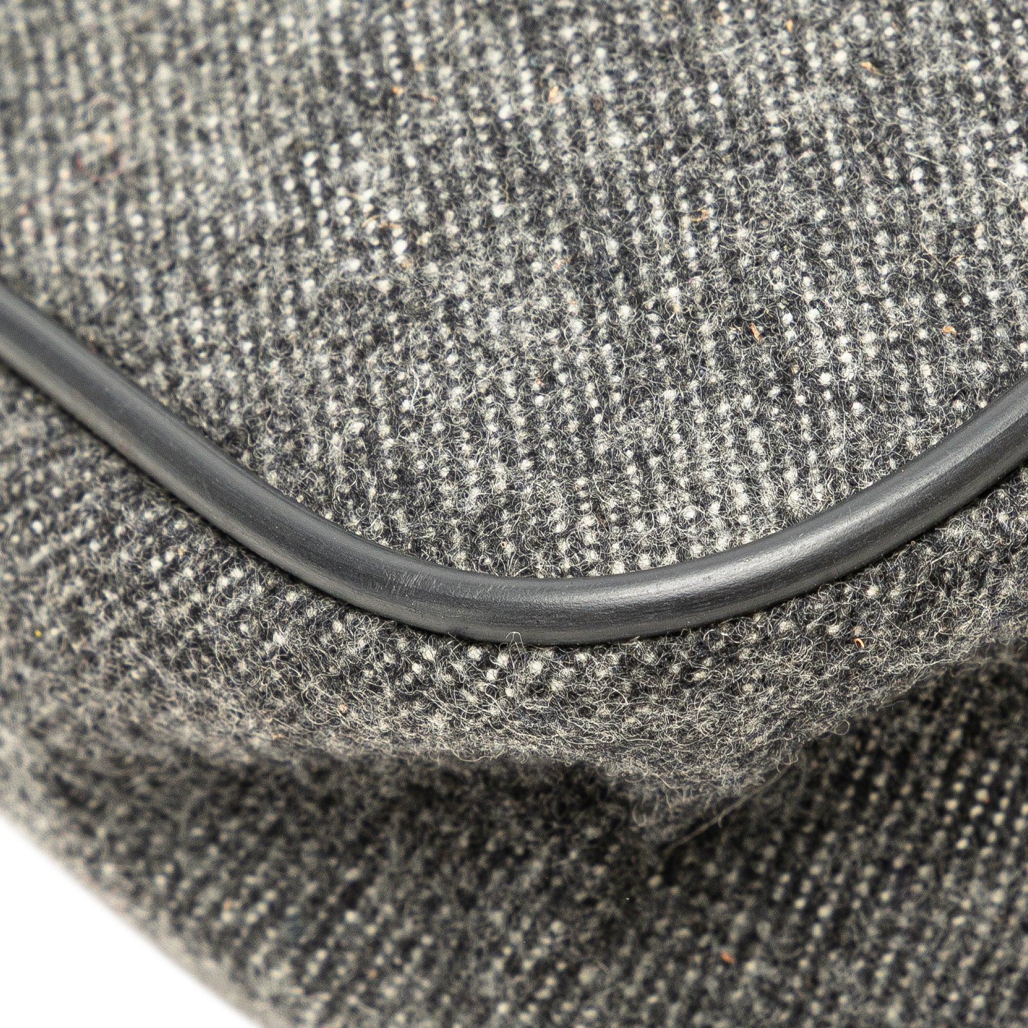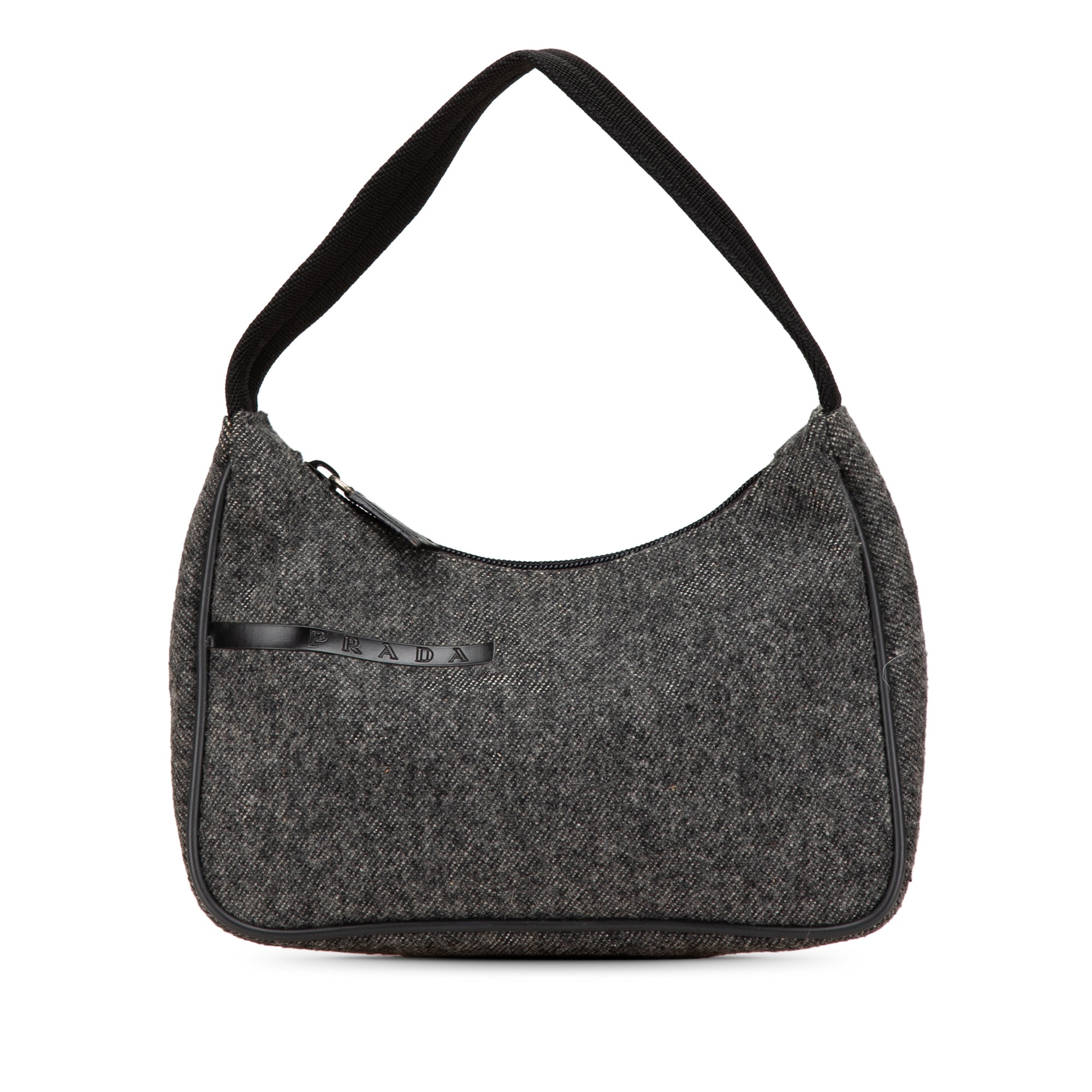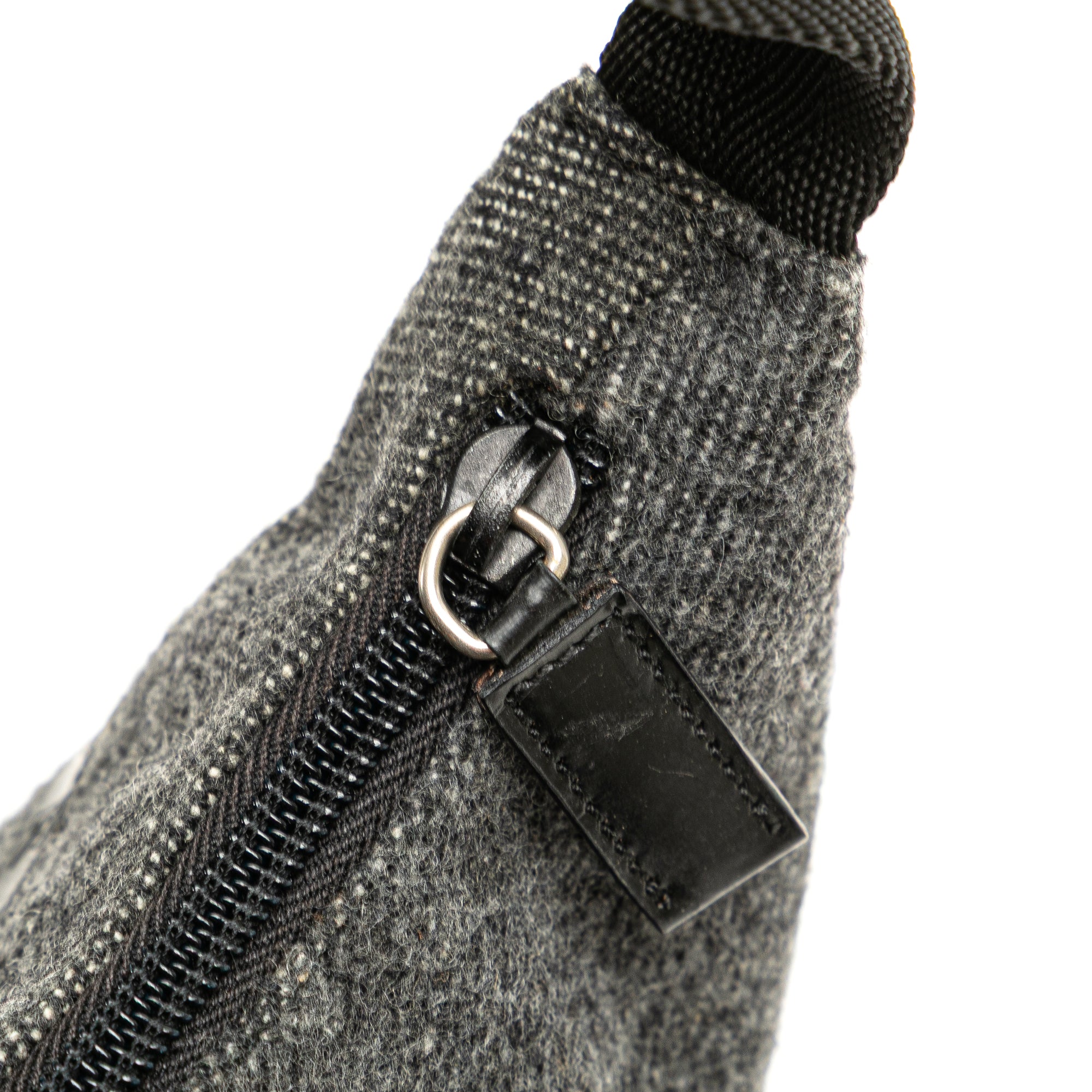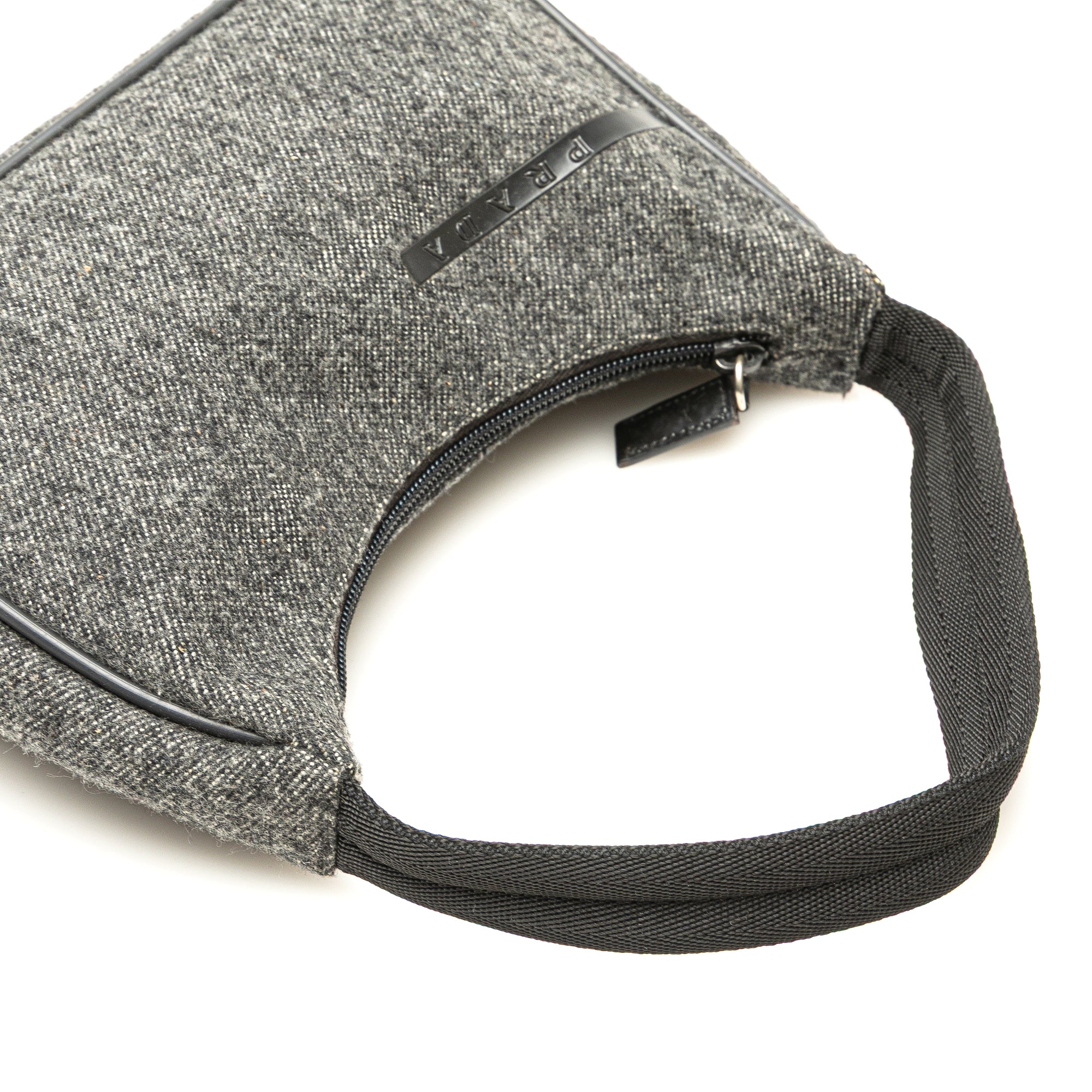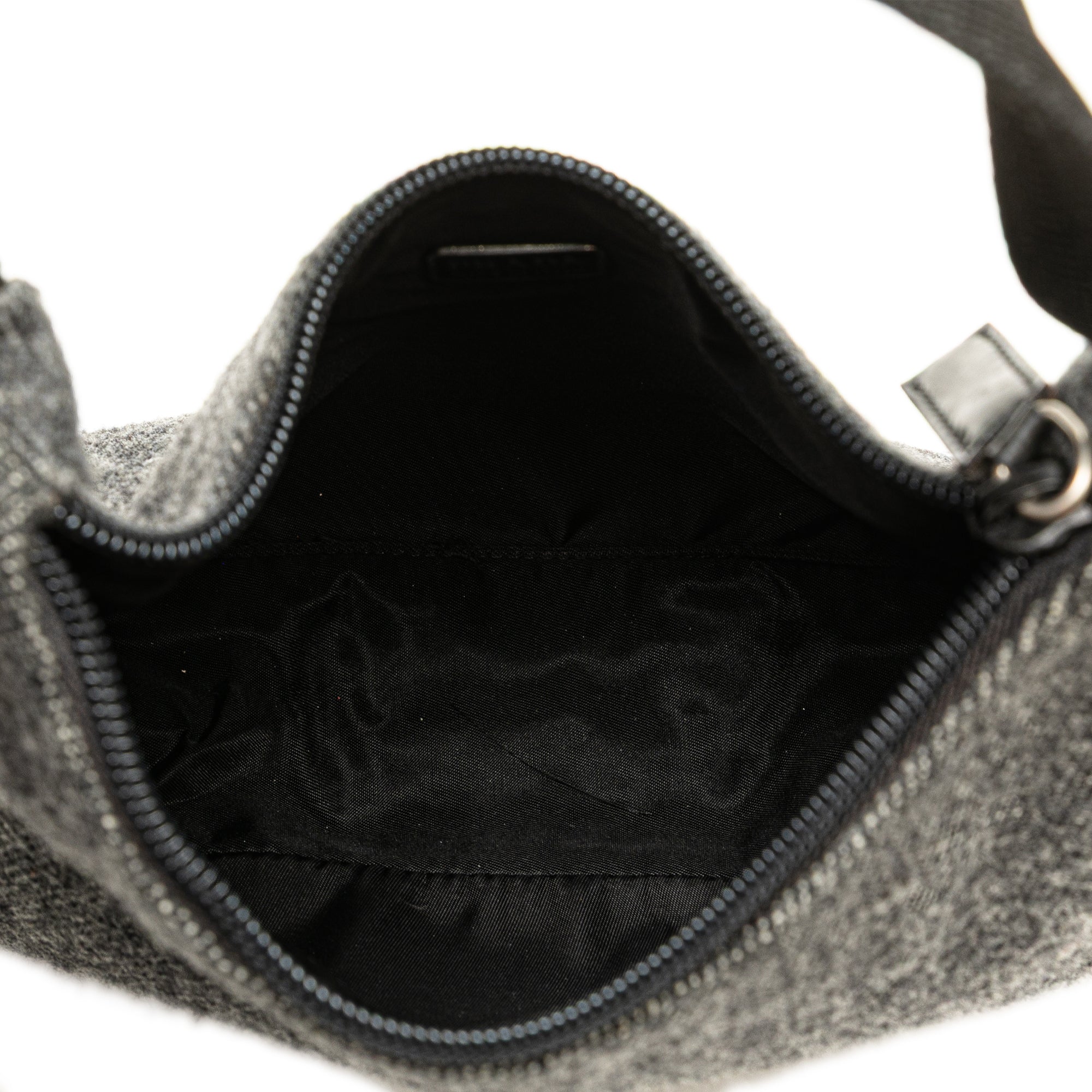 This shoulder bag features a wool body with leather trim, a flat strap, and a top zip closure. Retail Price: 995.00