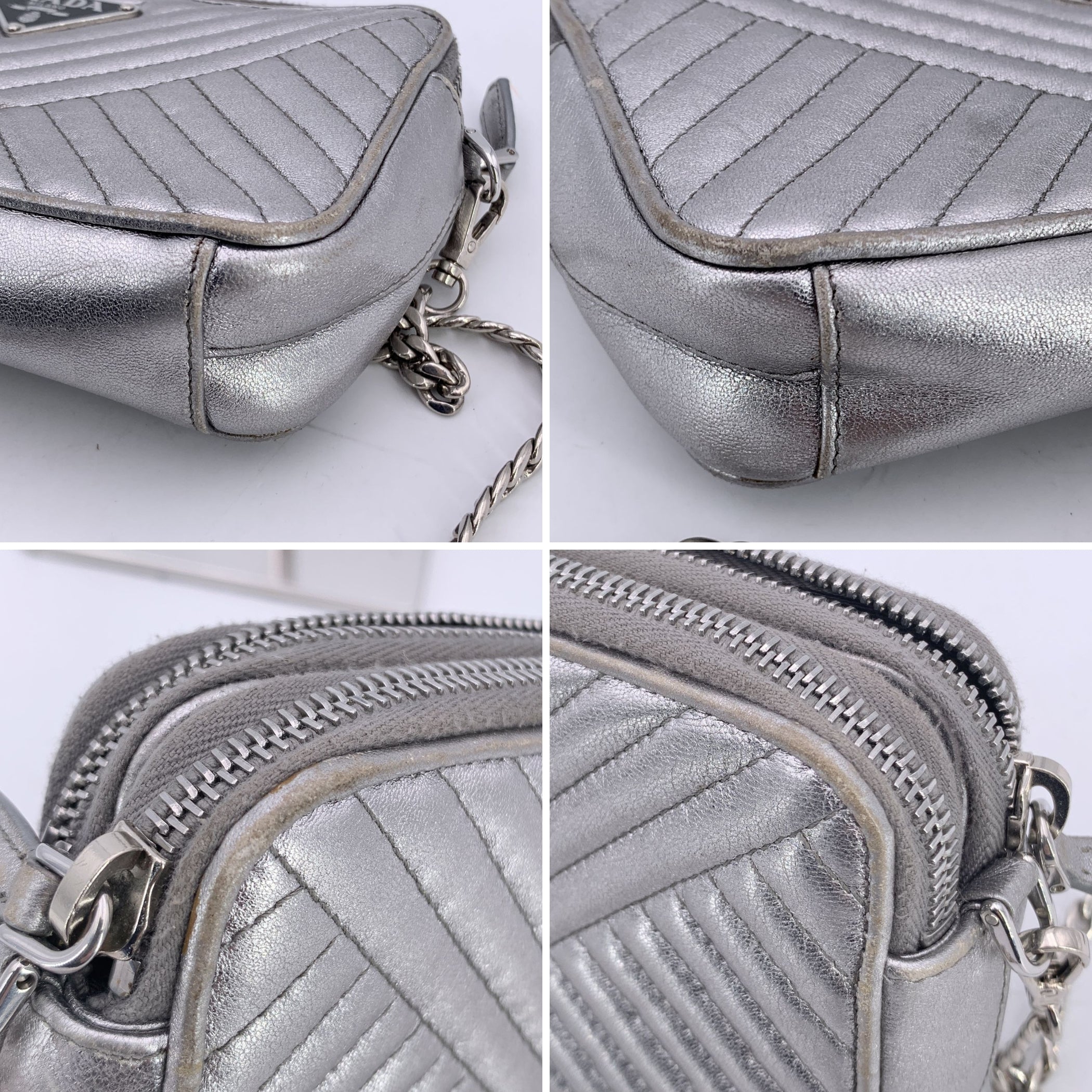 This Beautiful Bag Will Come With a Certificate Of Authenticity Provided By Entrupy. The Certificate Will Be Provided At No Further Cost The Prada Black Diagramme Leather Double Zip Shoulder Bag Is The Epitome Of Refined Elegance And Modern Sophistication. Crafted In Sleek Silver Metal Leather With Stitched Quilting, This Bag Shines With Timeless Luxury. The Iconic Enamelled Prada Triangle Logo On The Front Adds a Bold, Signature Touch, While The Silver-tone Hardware Complements The Bag's Polished, Futuristic Design. The Bag Features Two Zipped Compartments, Each Lined With a Combination Of Textile And Leather, Offering Ample Space For Your Essentials. Inside, You'll Find Three Card Slots In Each Compartment, Allowing You To Stay Organized In Style. The Central Slip Pocket Offers Additional Storage For Items You Want To Keep Separate. With a Removable Chain Shoulder Strap, This Versatile Piece Can Be Worn Over The Shoulder Or Carried As a Chic Clutch. Engraved With 'Prada - Made In Italy' Inside, This Bag Is a Testament To The Brand's Craftsmanship And Timeless Appeal. Perfect For Any Occasion, The Prada Diagramme Woc Wallet On Chain Is As Practical As It Is Beautiful-an Instant Classic.