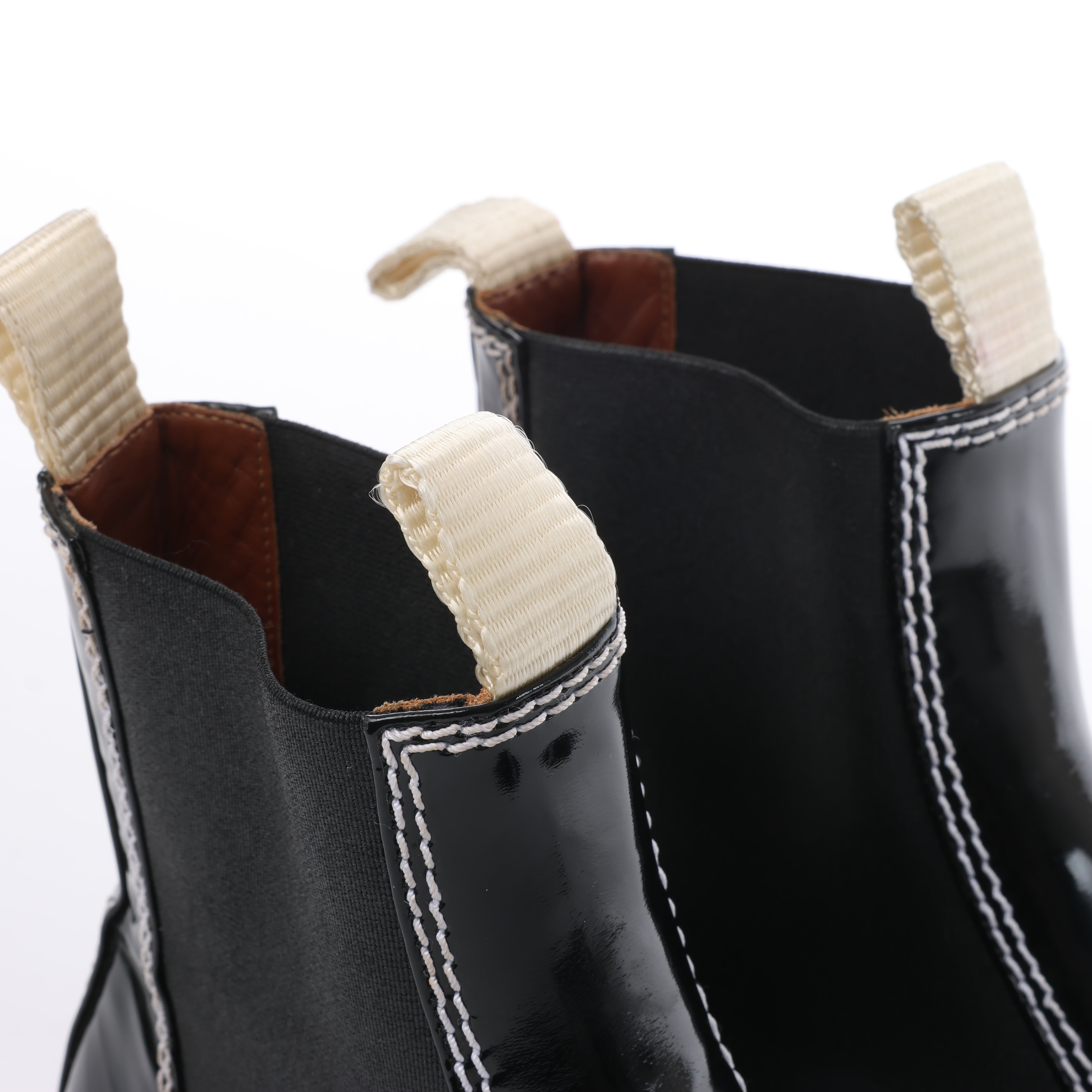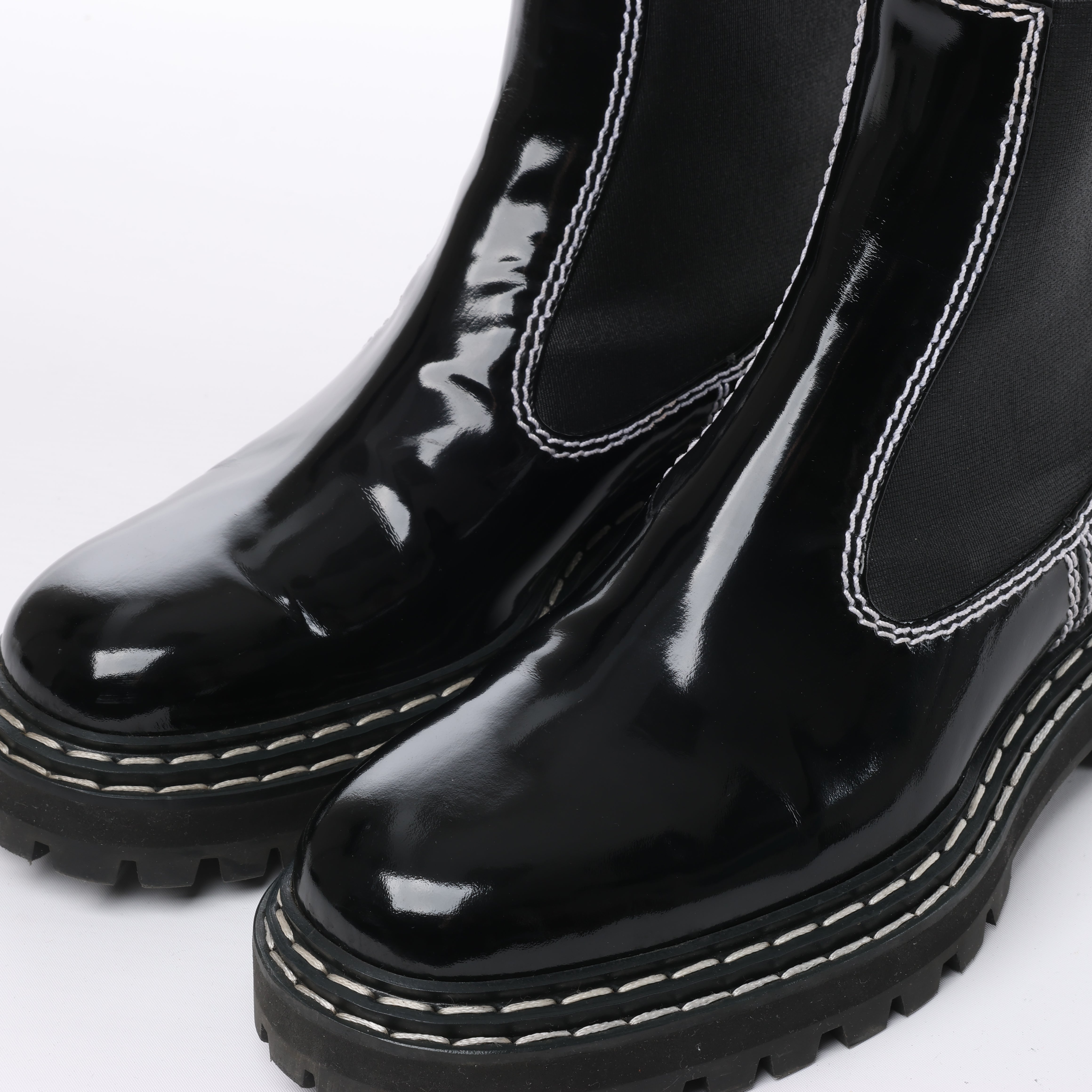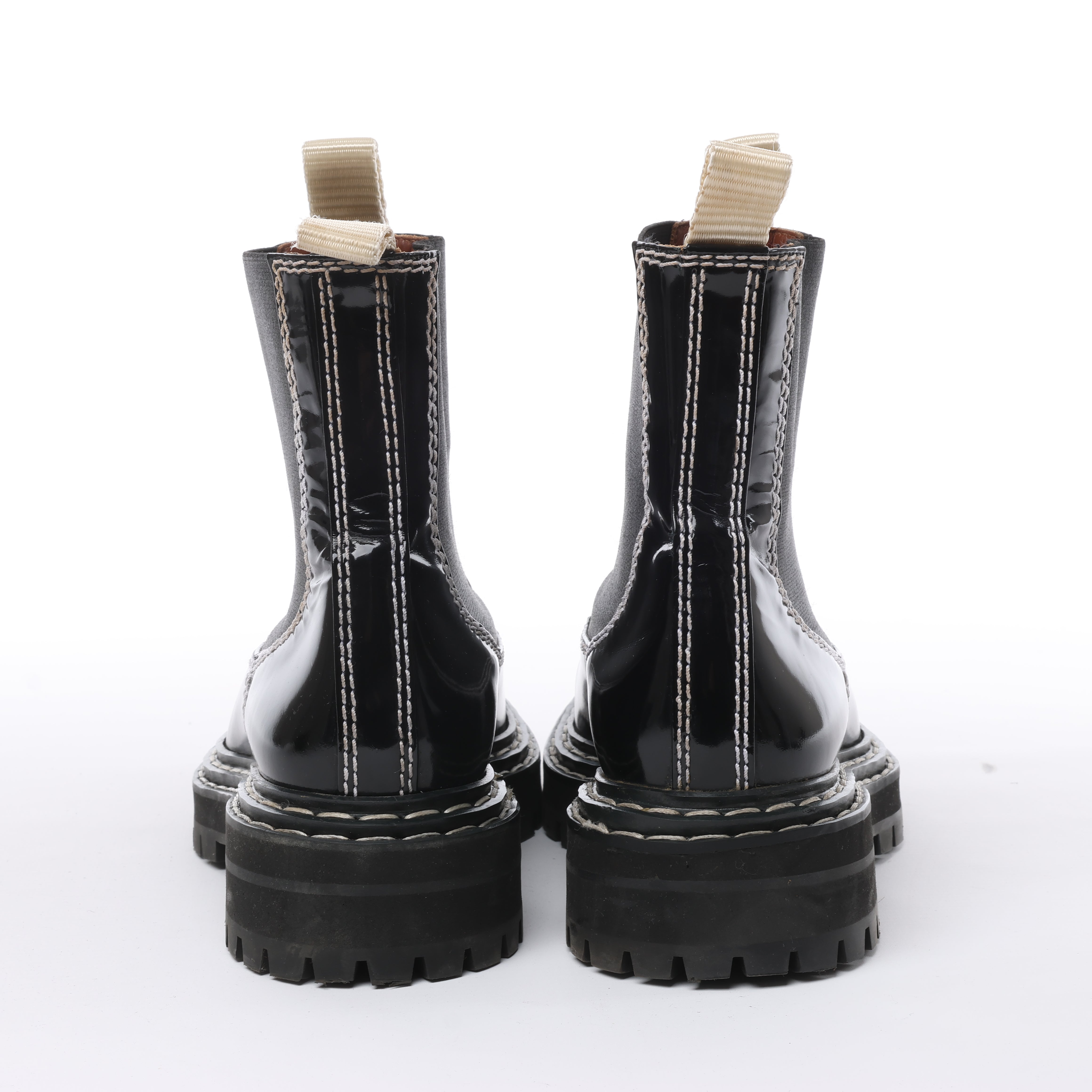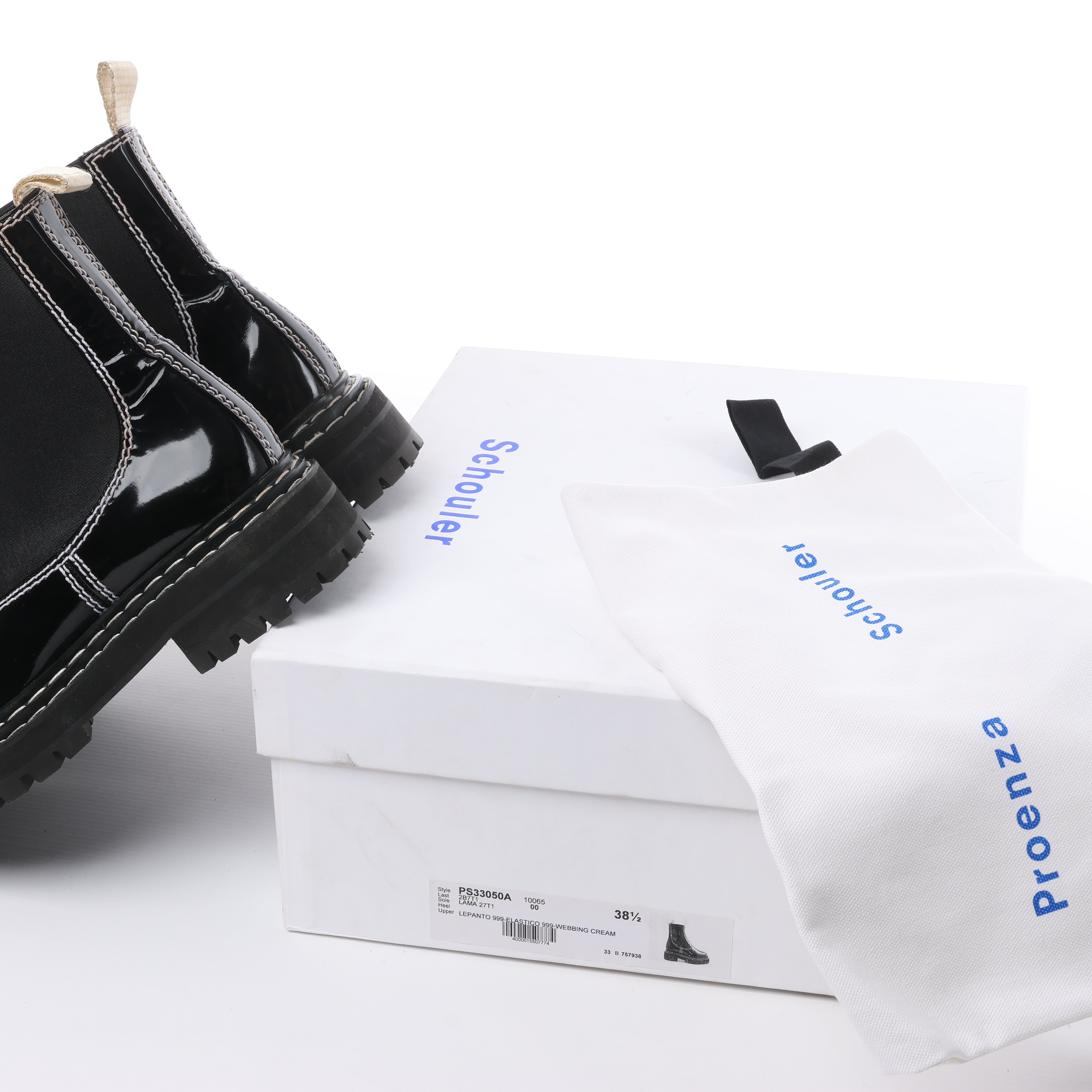 Proenza Schouler Chelsea boots in black leather with contrast topstitching, size 38.5 EU. Featuring elastic side panels and a chunky lug sole, these boots embody the brand’s downtown-cool edge—polished with a subversive twist.