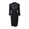 Midi length dress in black wool features satin lapel collars, one-button closure, front pockets, and structured shoulders for a sleek, tailored look.