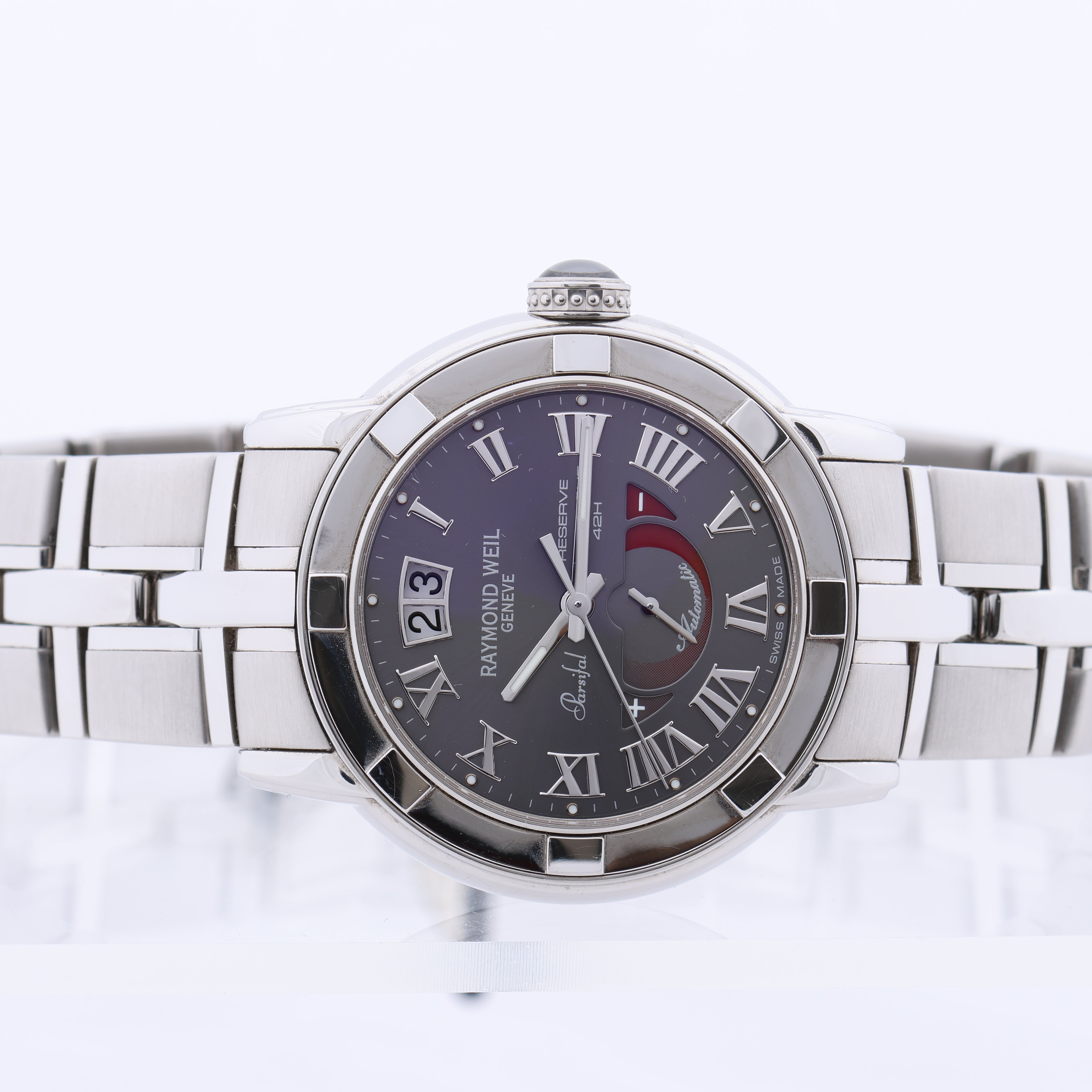 The Raymond Weil Parsifal 2843-ST-00608 Watch, with a 39 mm stainless steel case and elegant grey dial, showcases Roman numeral markers and a power reserve indicator. This sophisticated timepiece blends classic design with practical functionality, perfect for any occasion.