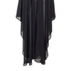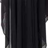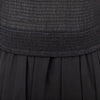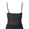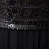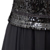 Ritmo di Perla black dress featuring a sequin-strewn bodice over stretch fabric, delicate thin straps, and a flowing asymmetric hem with added lining.
