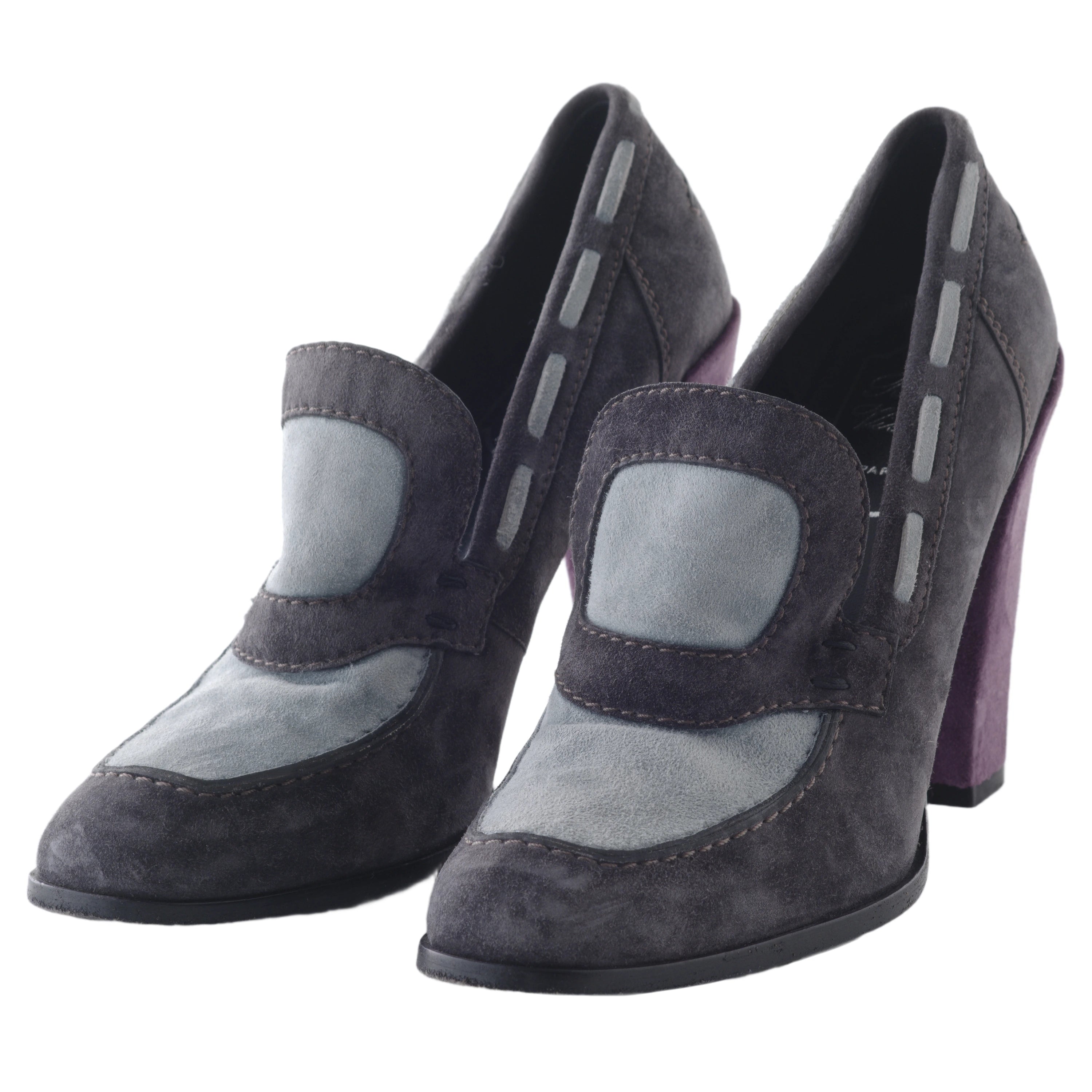Vintage Roger Vivier suede pumps in dark grey, featuring a contrasting ribbon and a block heel. A refined creation, designed for those who appreciate iconic luxury and timeless style.