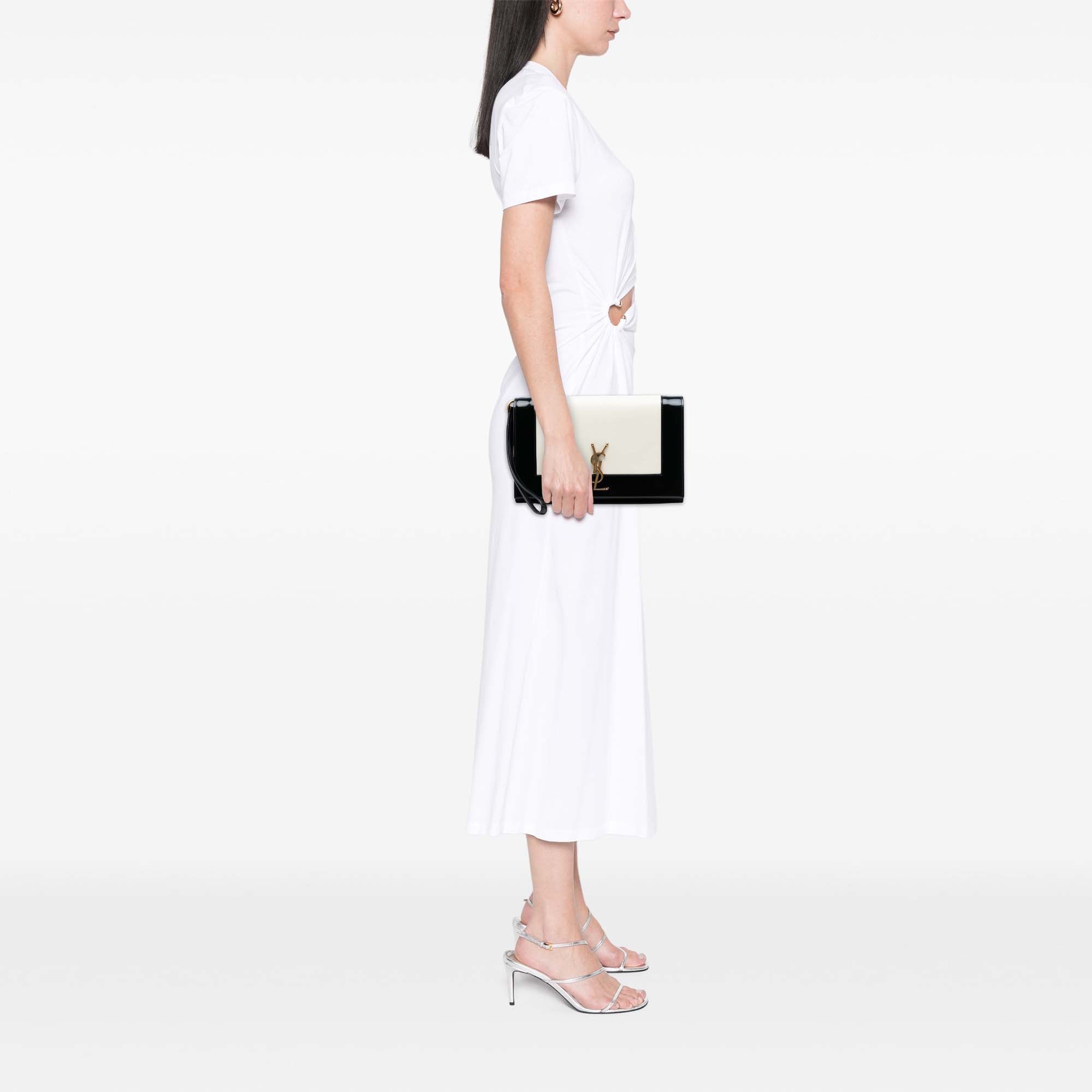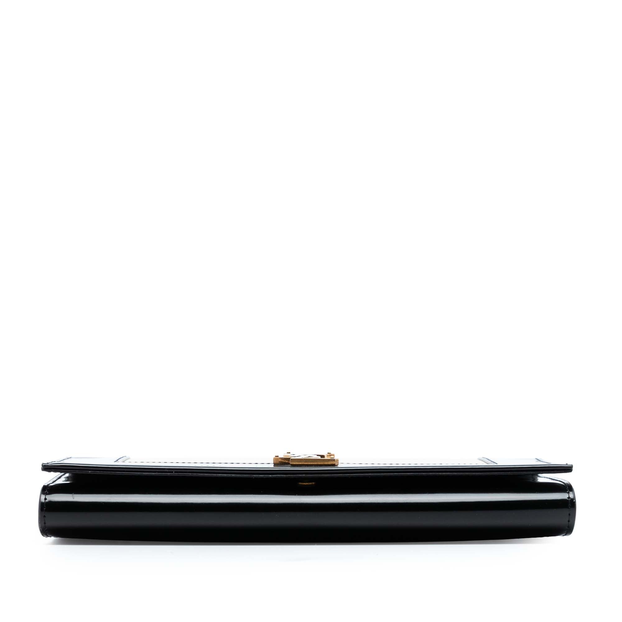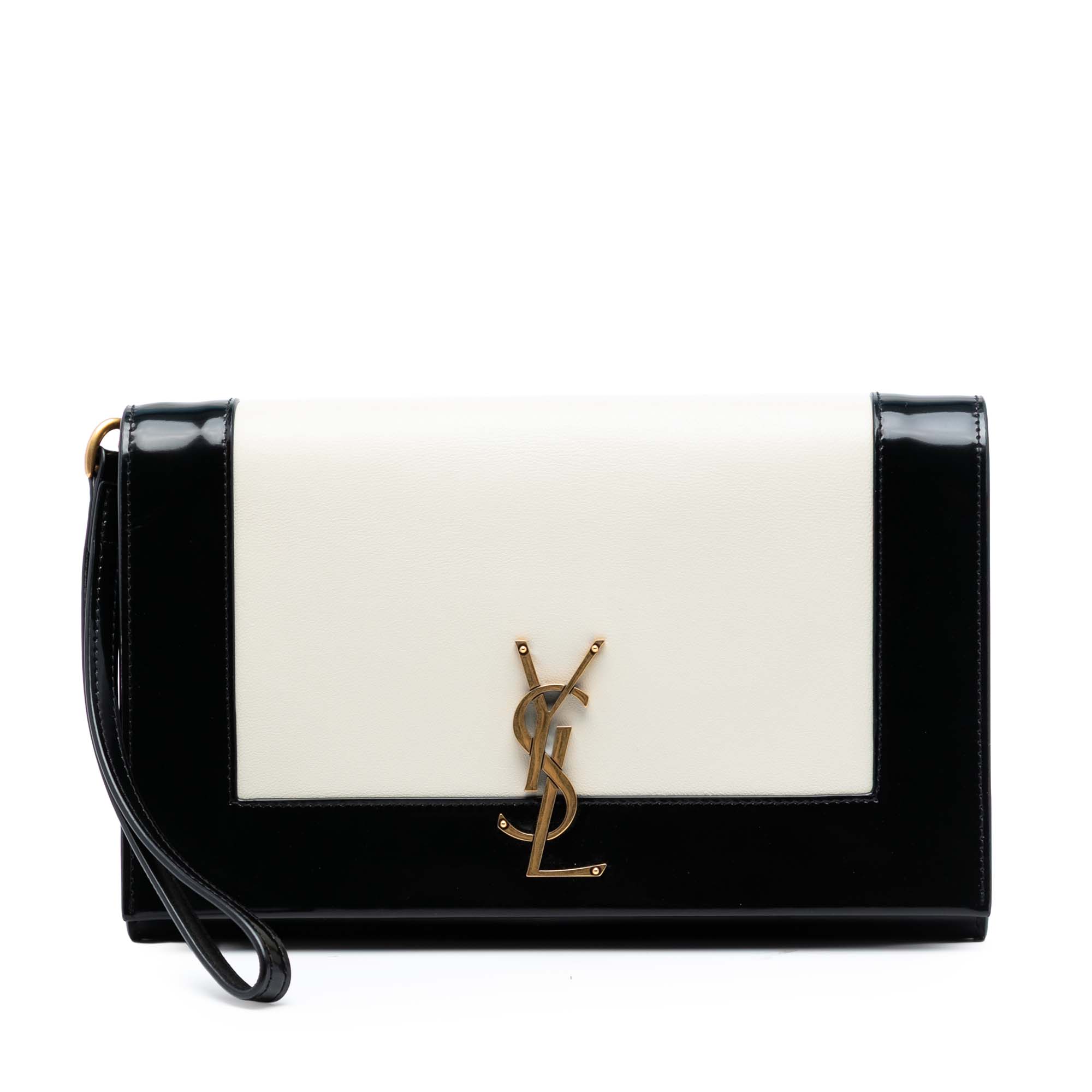 This clutch features a lambskin leather body with brushed leather trim, a flat leather wrist strap, a front flap with a snap button closure, and an interior slip pocket. Inclusion: Dust bag, box. Retail Price: 995.00