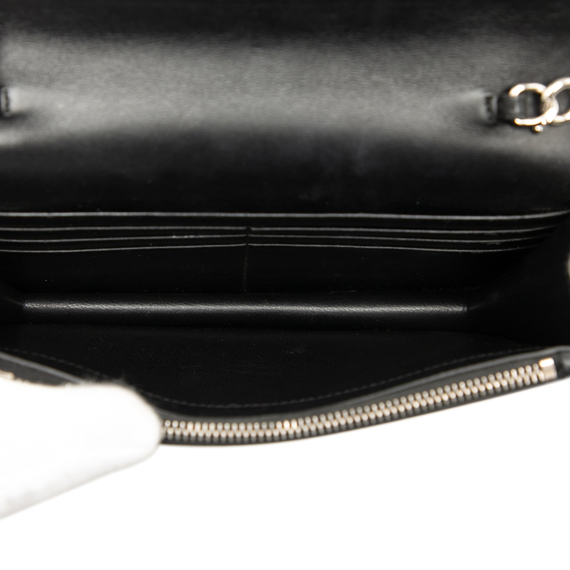 The Kate wallet on chain features a leather body with a tassel, a silver-tone curb chain-link shoulder strap with leather guard, a front flap with magnetic snap closure, and interior zip and slip compartments. Retail Price: 2100.00