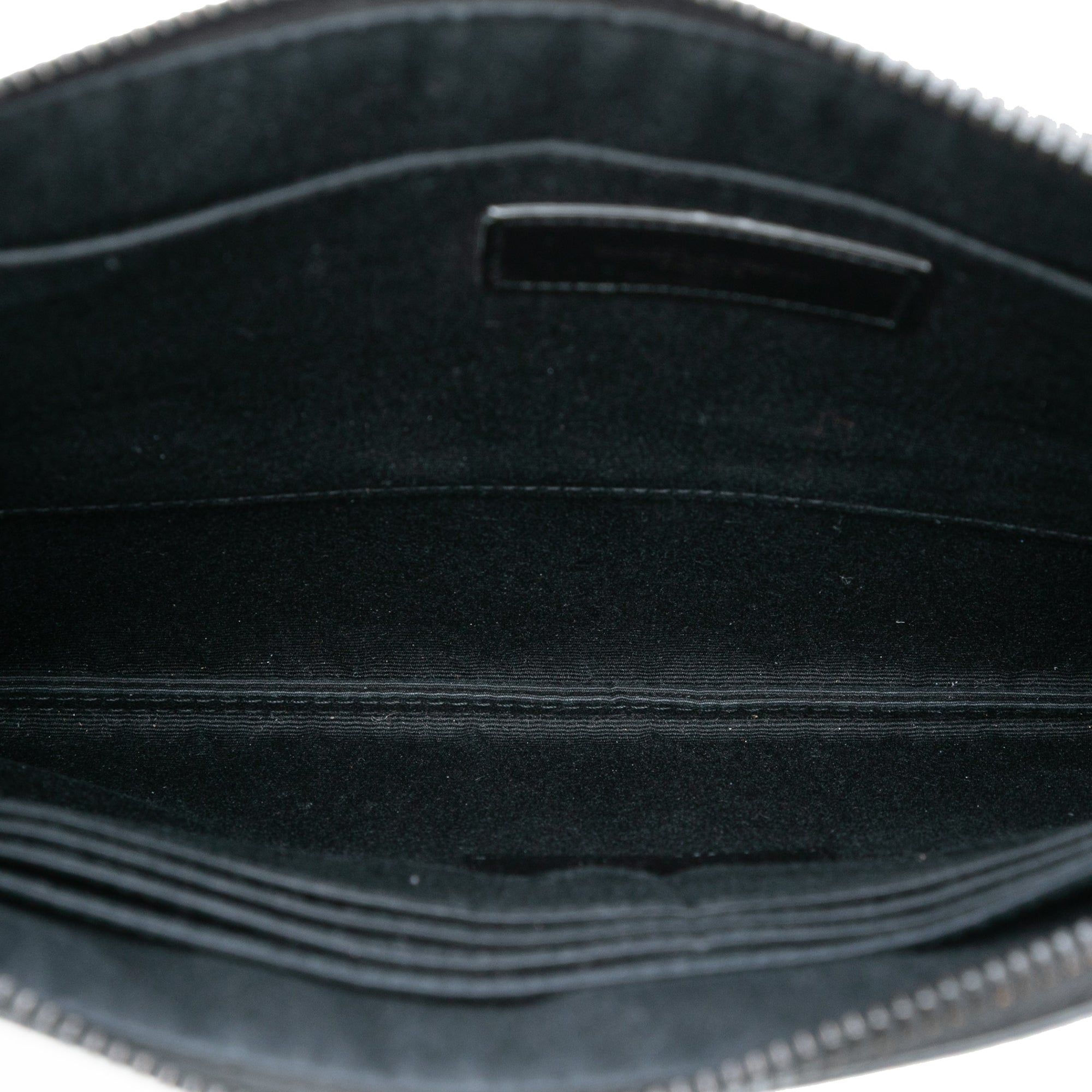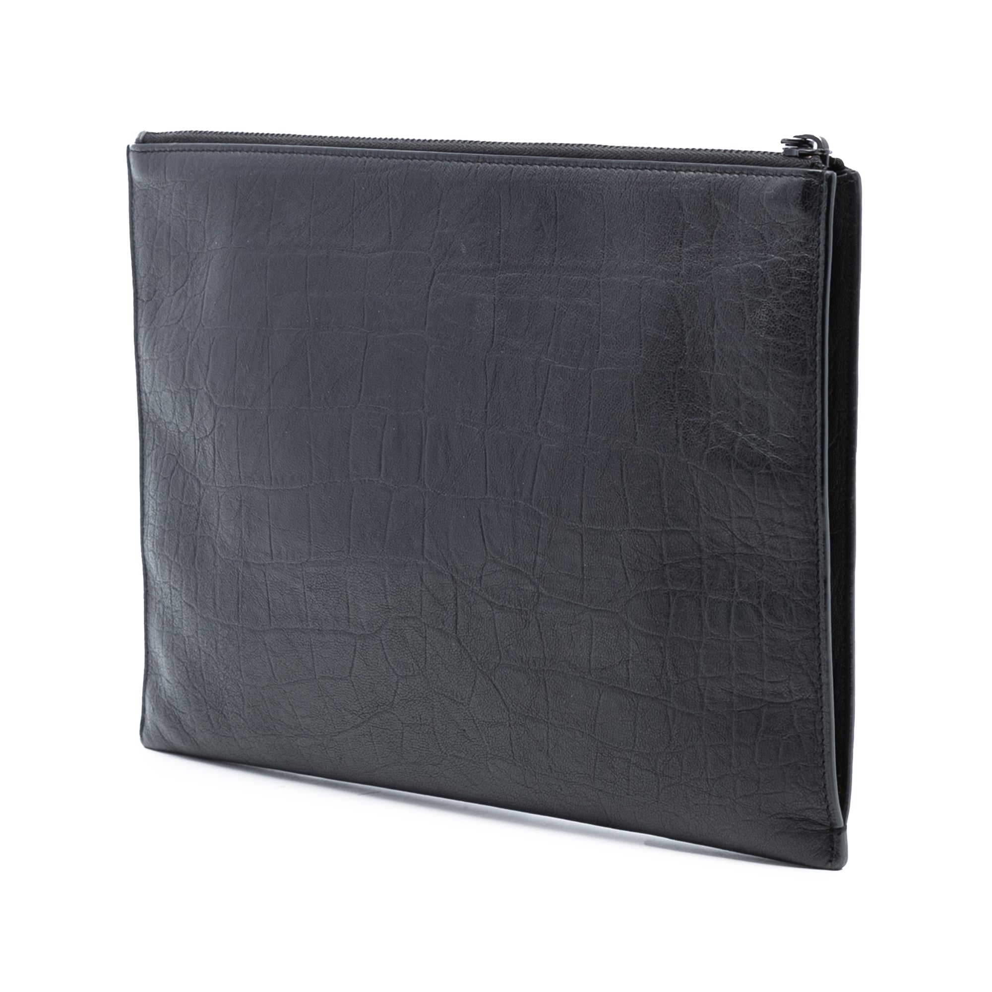 This clutch features an embossed leather body, a top zip closure, and interior slip pockets. Retail Price: 950.00
