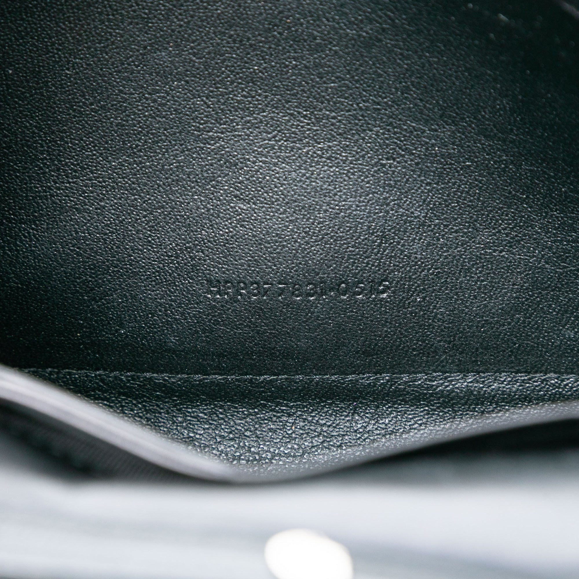 This wallet on chain features an embossed leather body, a chain link strap, a flap with magnetic snap closure, and interior zip and slip compartments. Retail Price: 1790.00