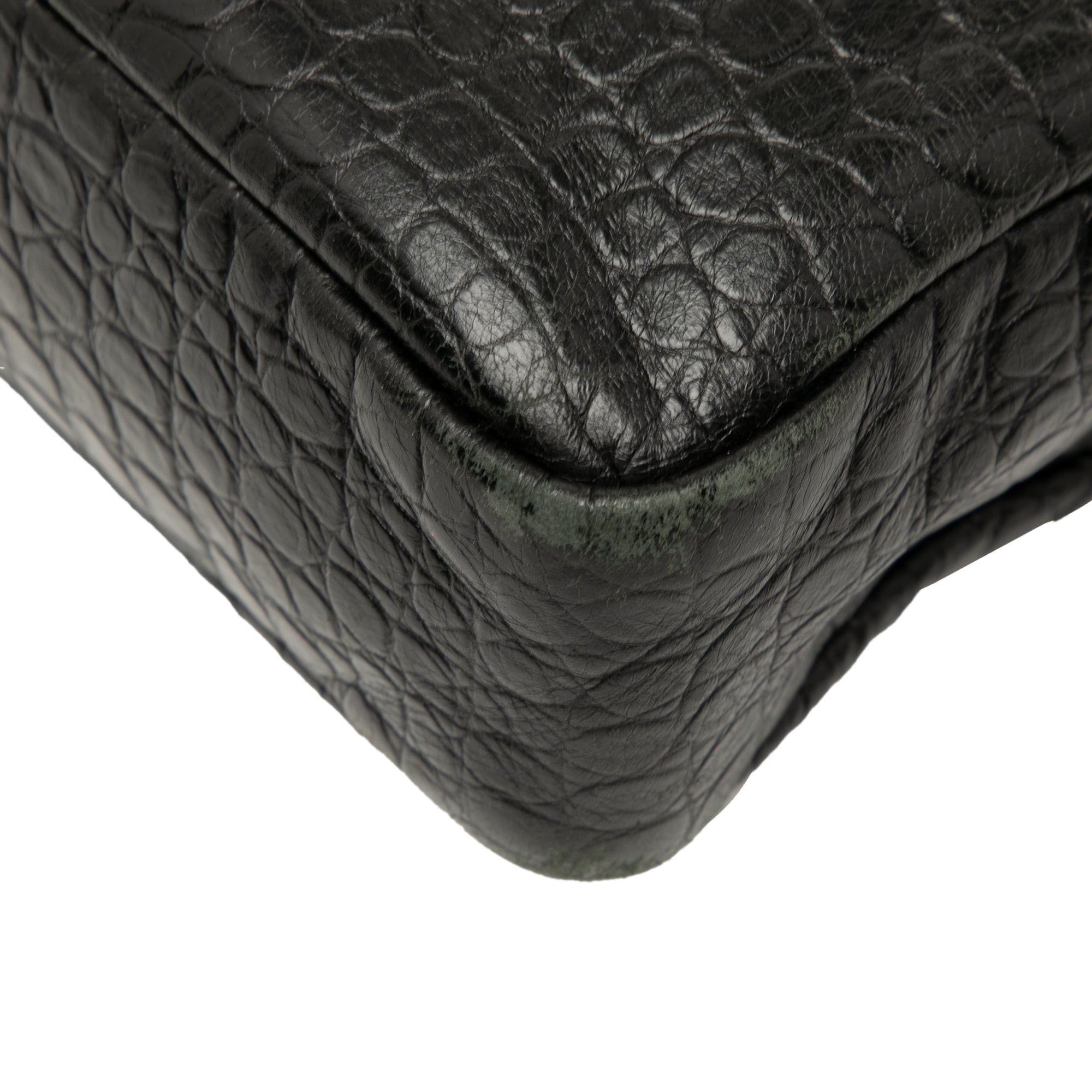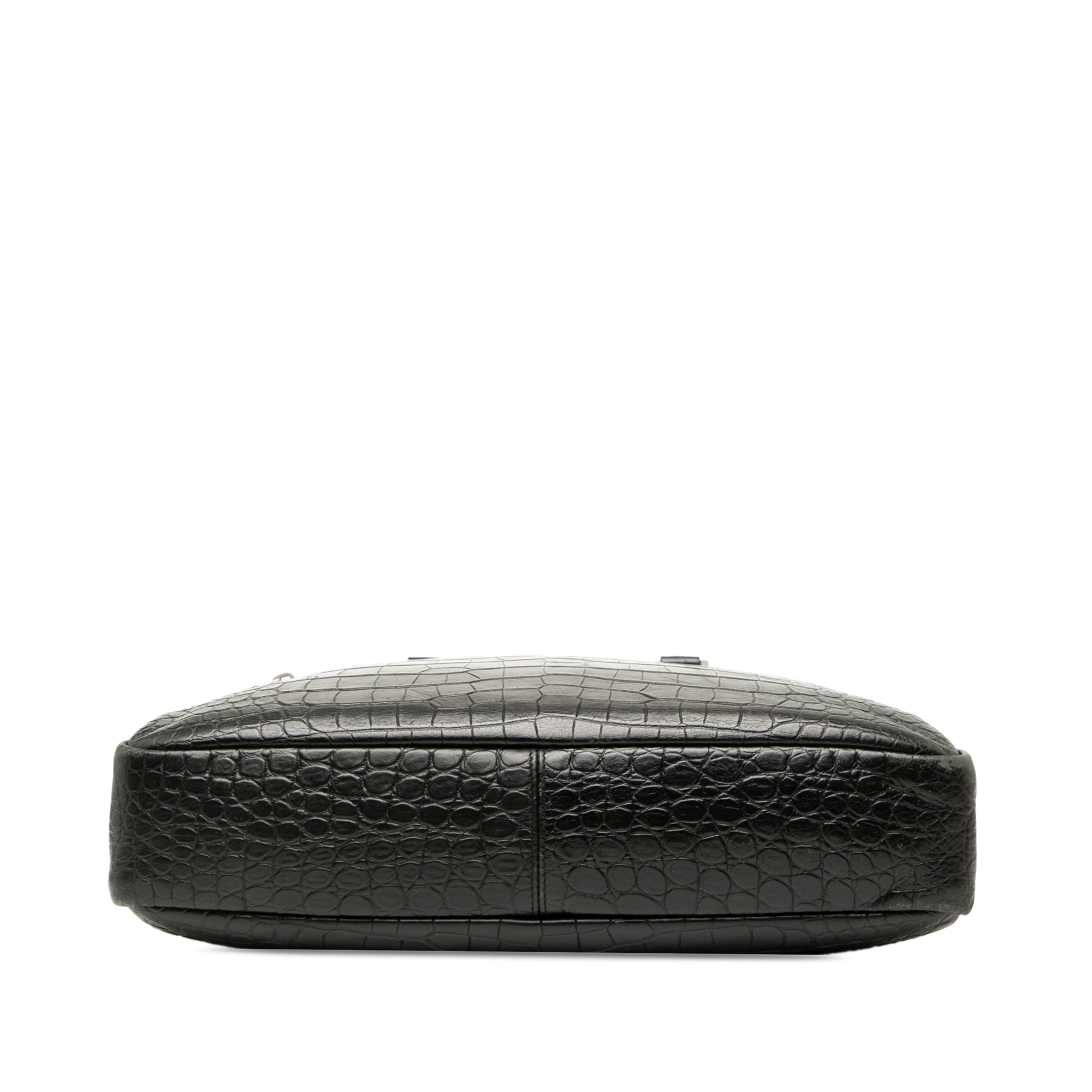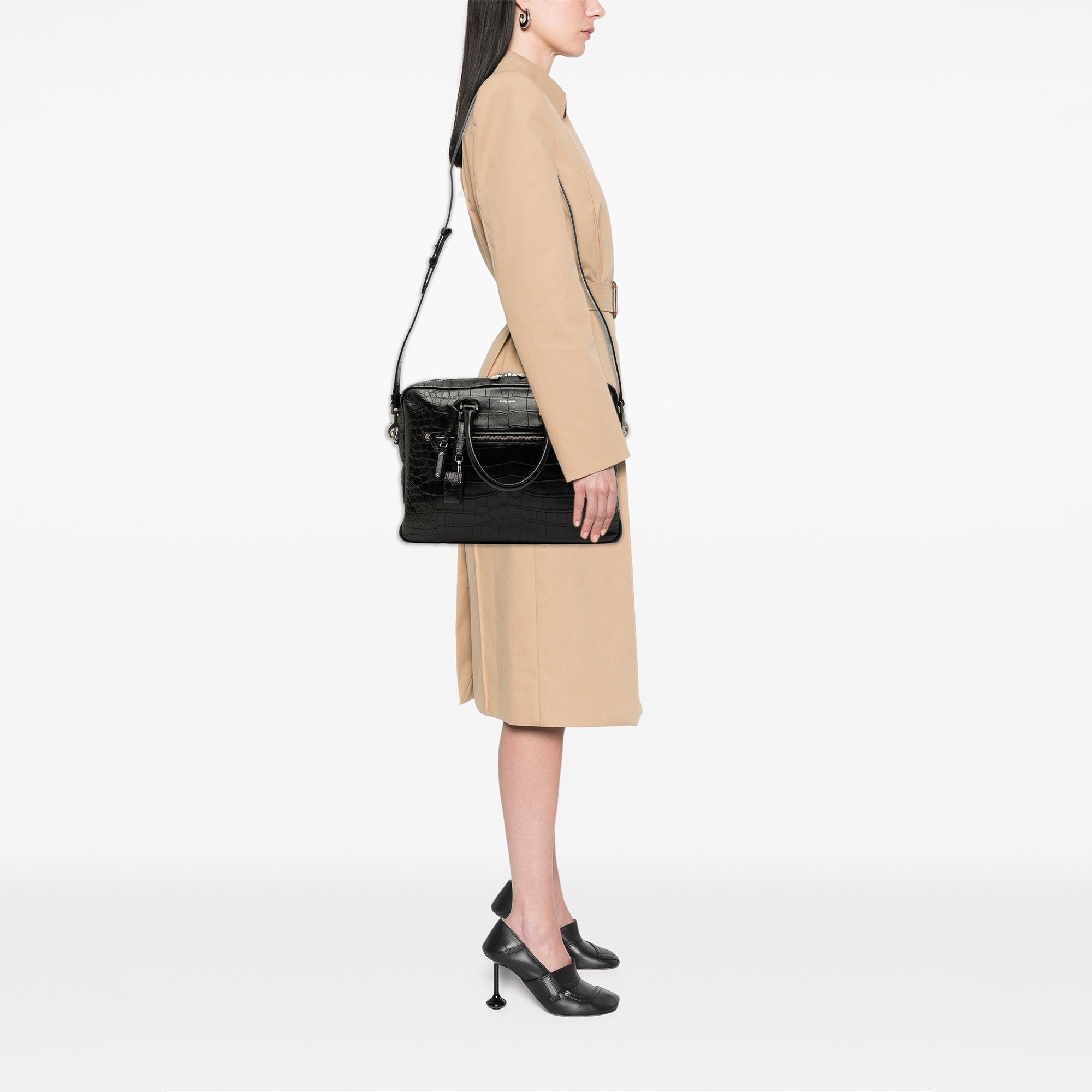 This business bag features a crocodile embossed leather body, rolled leather handles, a detachable flat leather strap, a top zip closure, an exterior zip pocket, and interior zip and slip pockets. Inclusion: Dust bag. Retail Price: 1950.00
