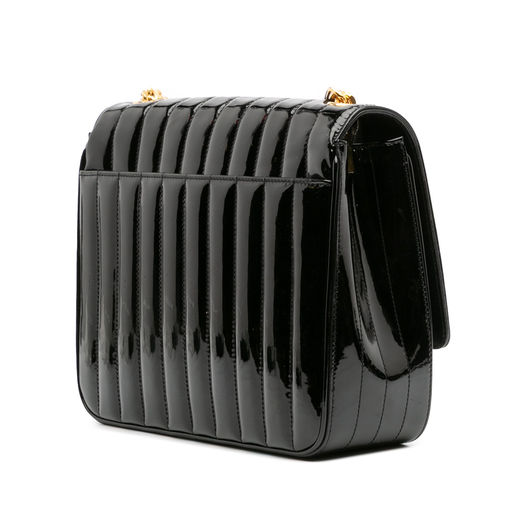 The Vicky crossbody features a quilted patent leather body, a chain link strap with leather guard, a front flap with snap button closure, and an interior slip pocket. Retail Price: 2590.00