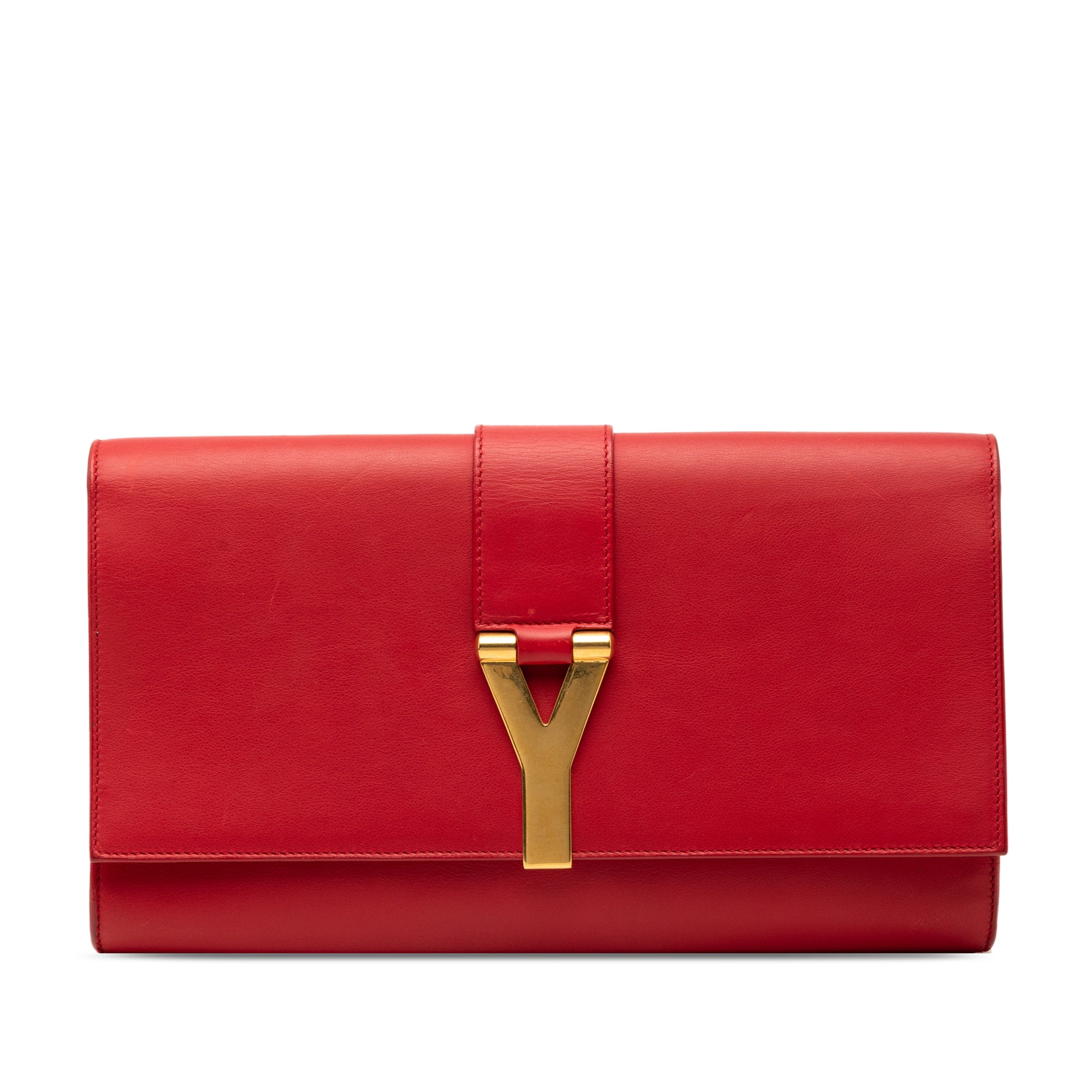 The Chyc Ligne Clutch features a leather body, a front flap with gold-tone Y hardware and snap closure, and an interior slip pocket. Retail Price: 995.00
