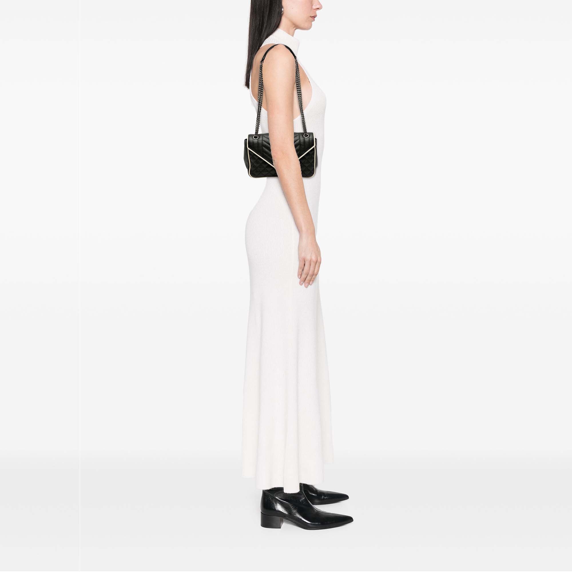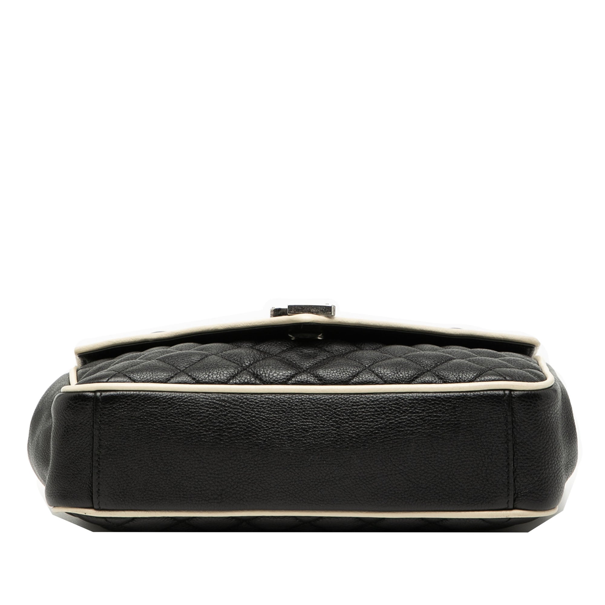 This shoulder bag features a quilted leather body with piping detail, chain link shoulder straps with leather guard, a front flap with magnetic snap closure, and an interior slip pocket. Retail Price: 2910.00