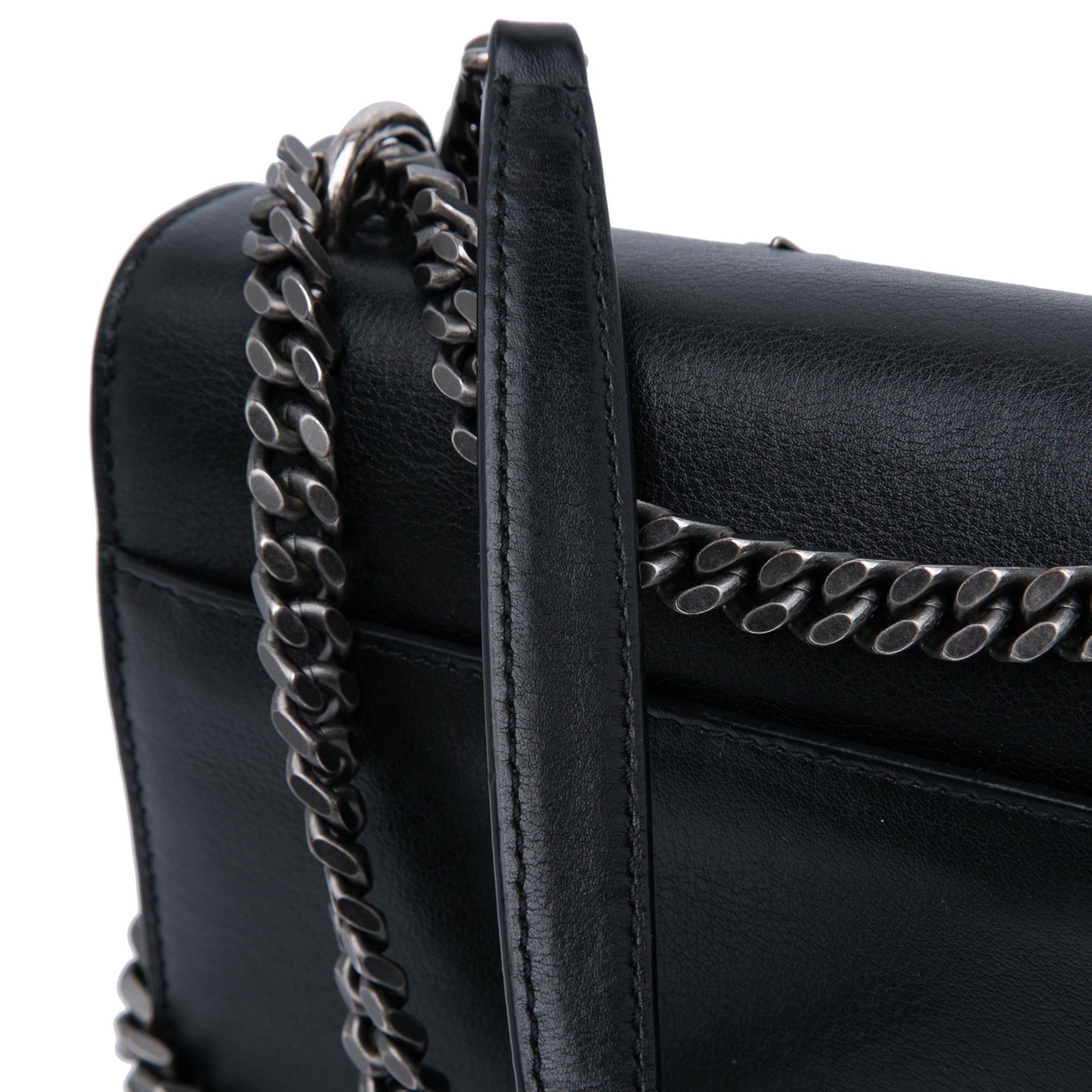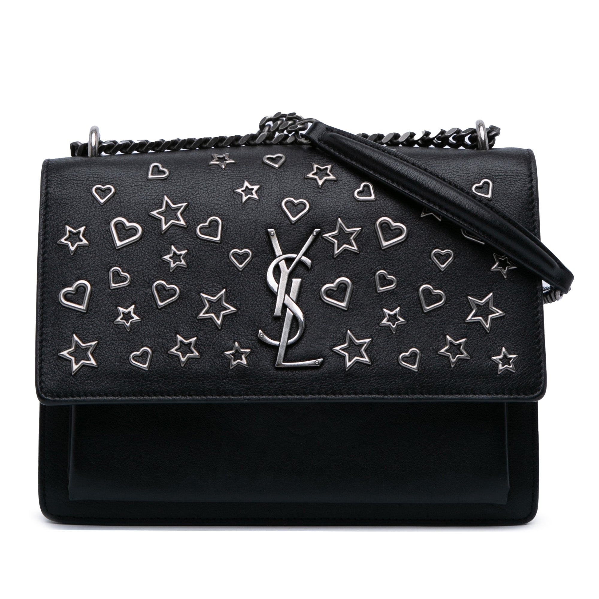 The Sunset features a leather body with silver-tone stars and hearts embellishments, a chain link shoulder strap with leather guard, a top flap with magnetic snap button closure, an exterior front open pocket, two interior compartments, and an interior slip pocket. Retail Price: 2650.00