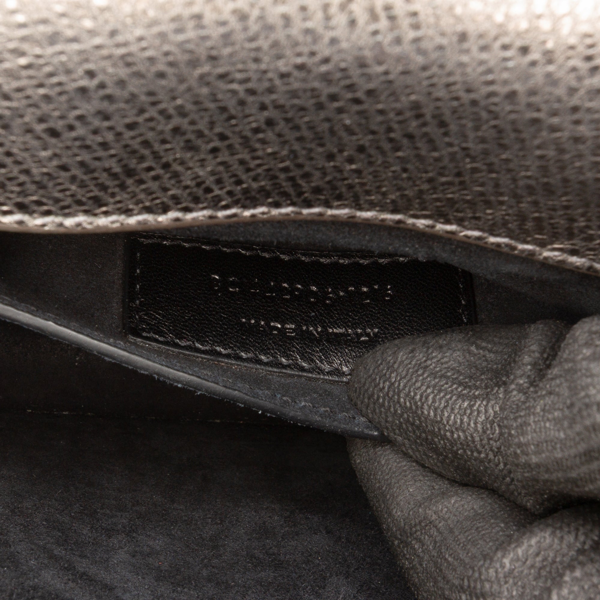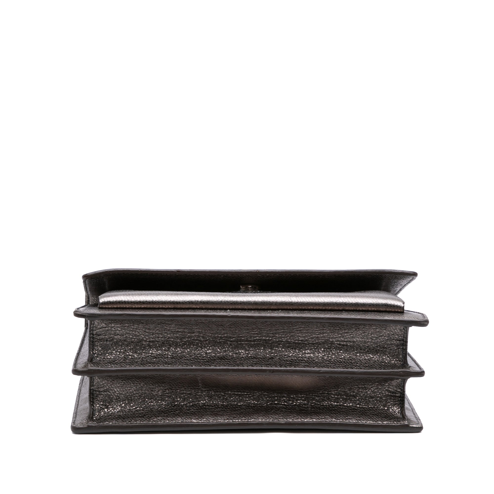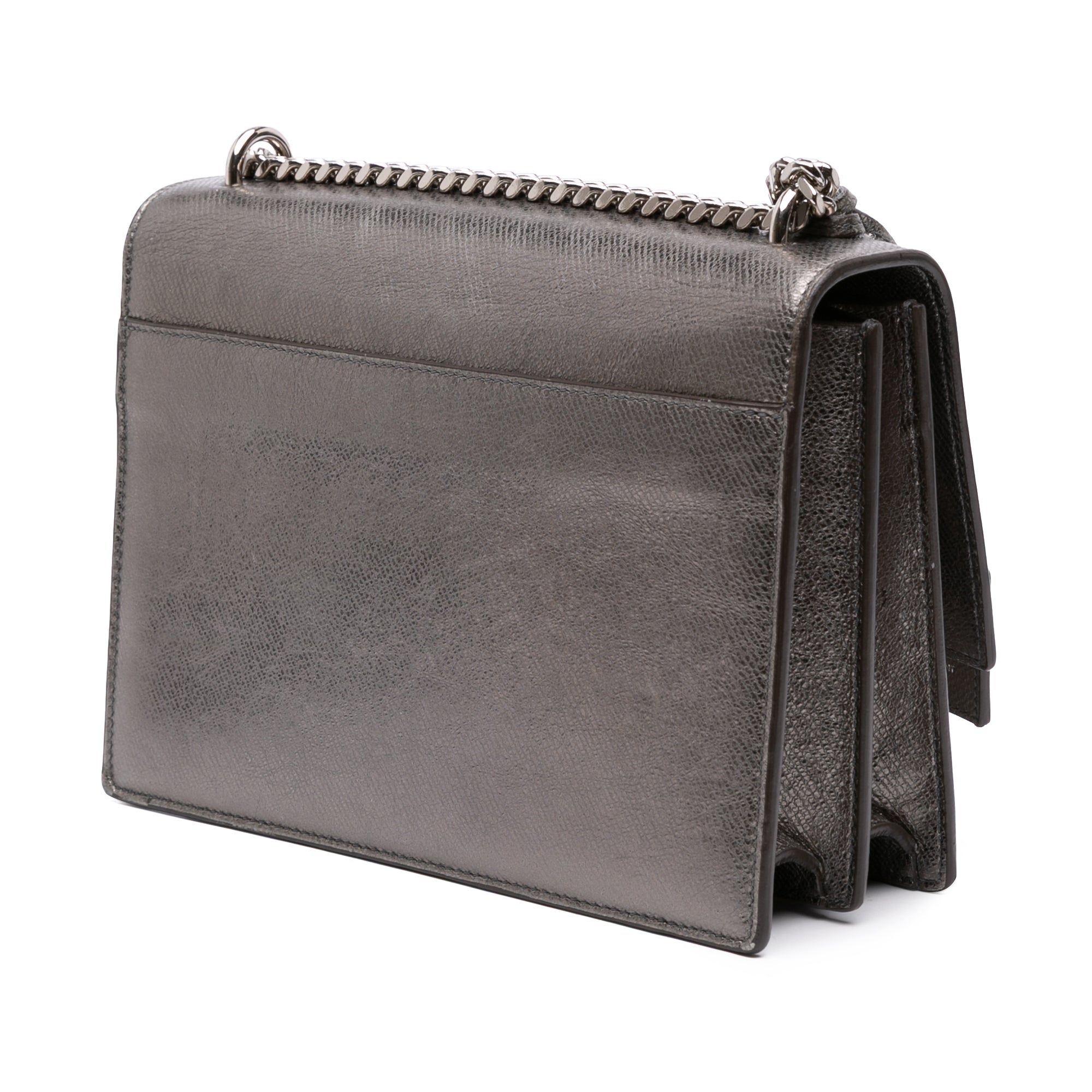 The Sunset features a metallic leather body, a chain link shoulder strap with leather guard, a top flap with magnetic snap button closure, an exterior front open pocket, two interior compartments, and an interior slip pocket. Retail Price: 2950.00