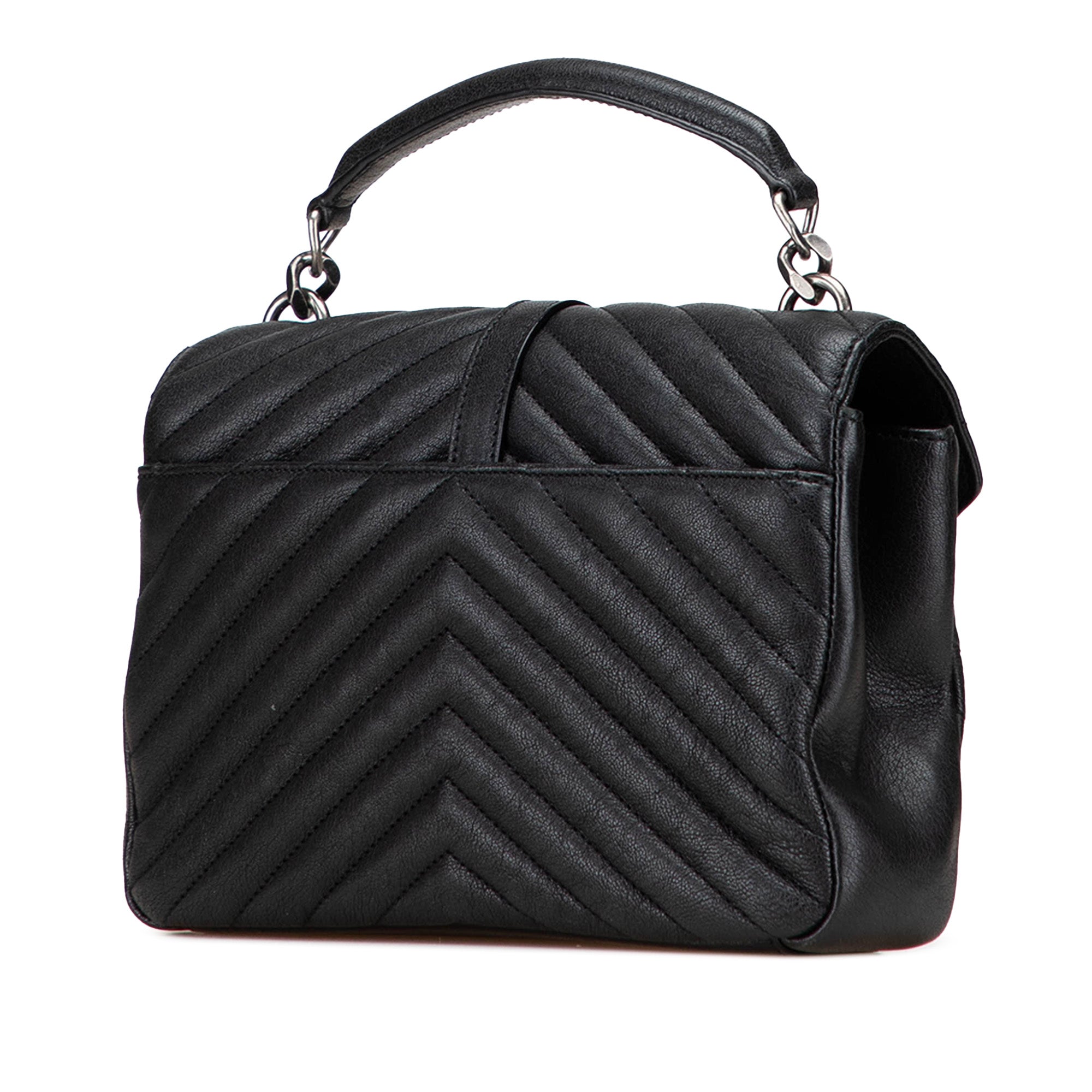 The College Satchel features a chevron quilted sheepskin leather body, a rolled leather top handle, a curb chain strap, a front flap with magnetic closure, an exterior slip pocket, and an interior zip pocket. Retail Price: 2550.00