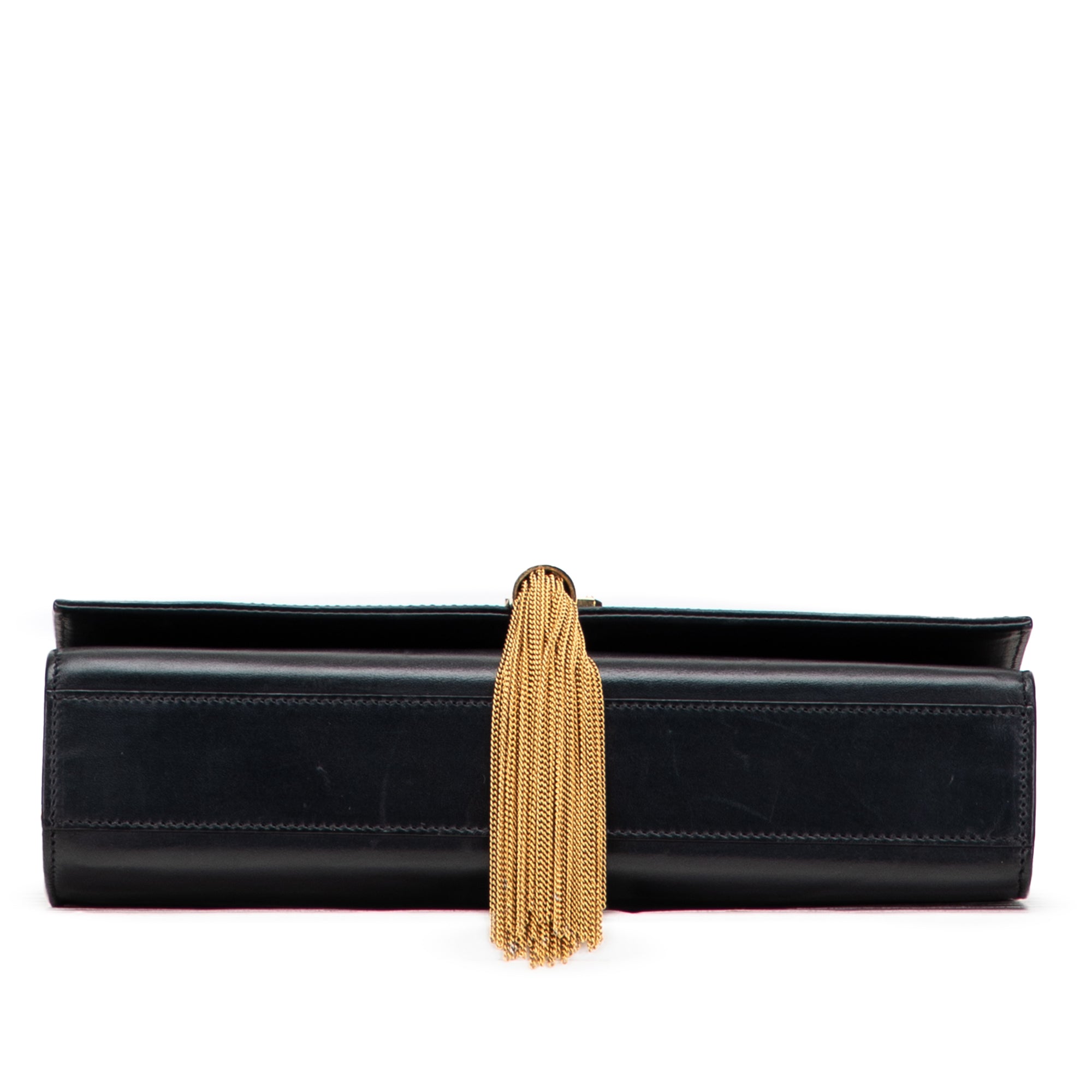 The Kate features a leather body with a tassel detail, a chain-link shoulder strap, a front flap with magnetic snap closure, and an interior slip pocket. Inclusion: Dust bag, box. Retail Price: 2400.00