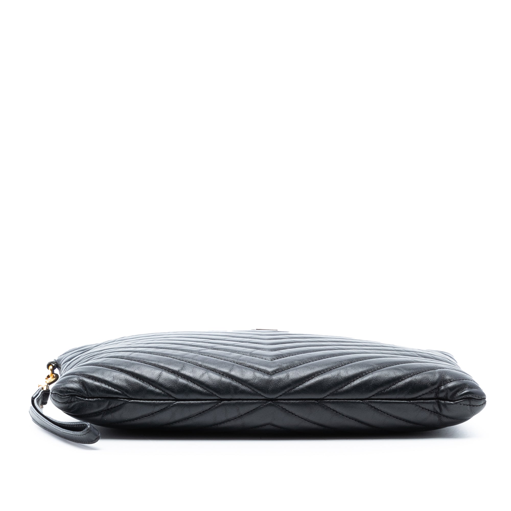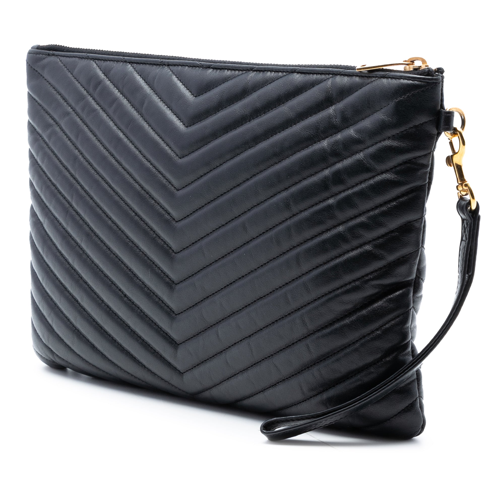 This clutch bag features a quilted leather body, flat wrist strap, a top zip closure and interior slip pockets. Inclusion: Dust bag. Retail Price: 880.00