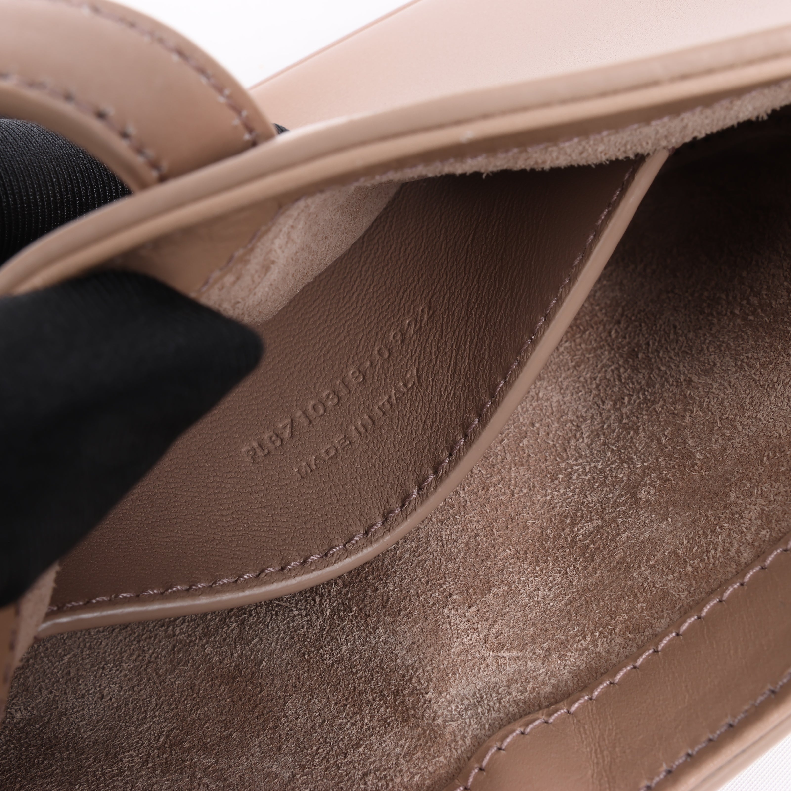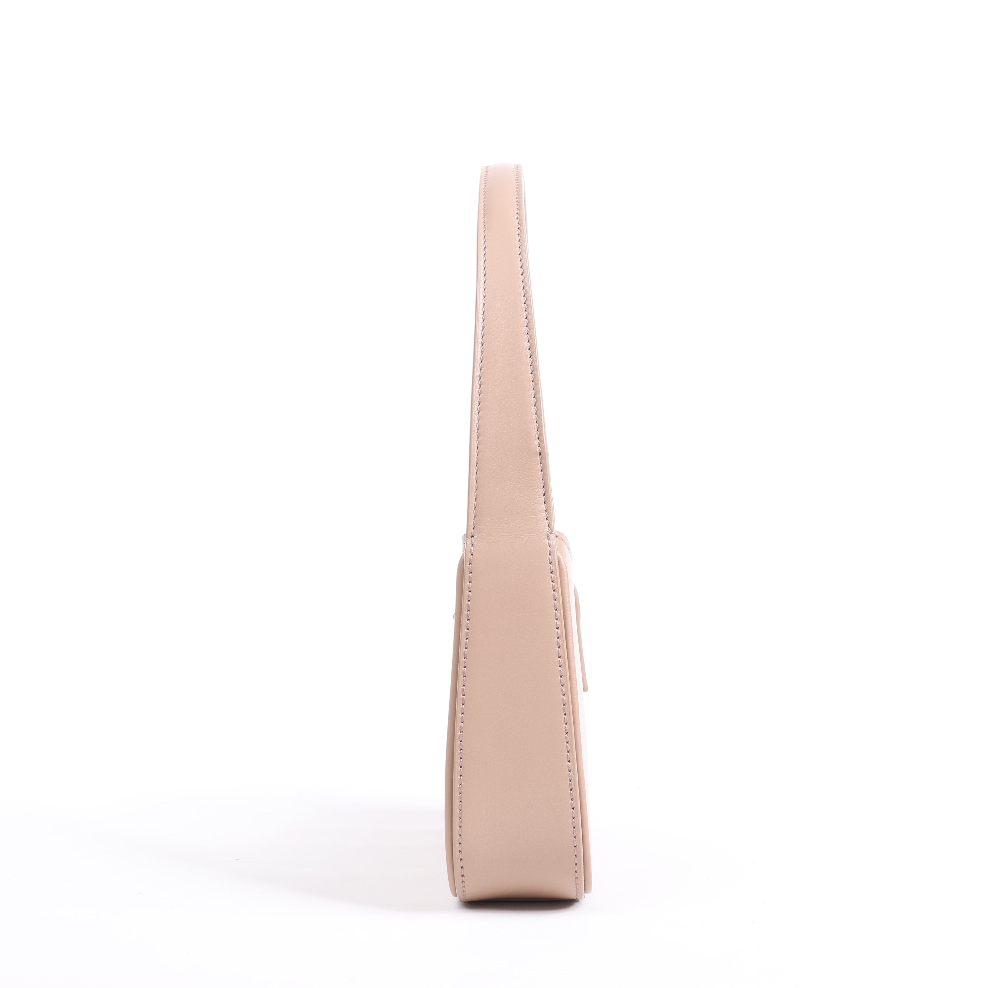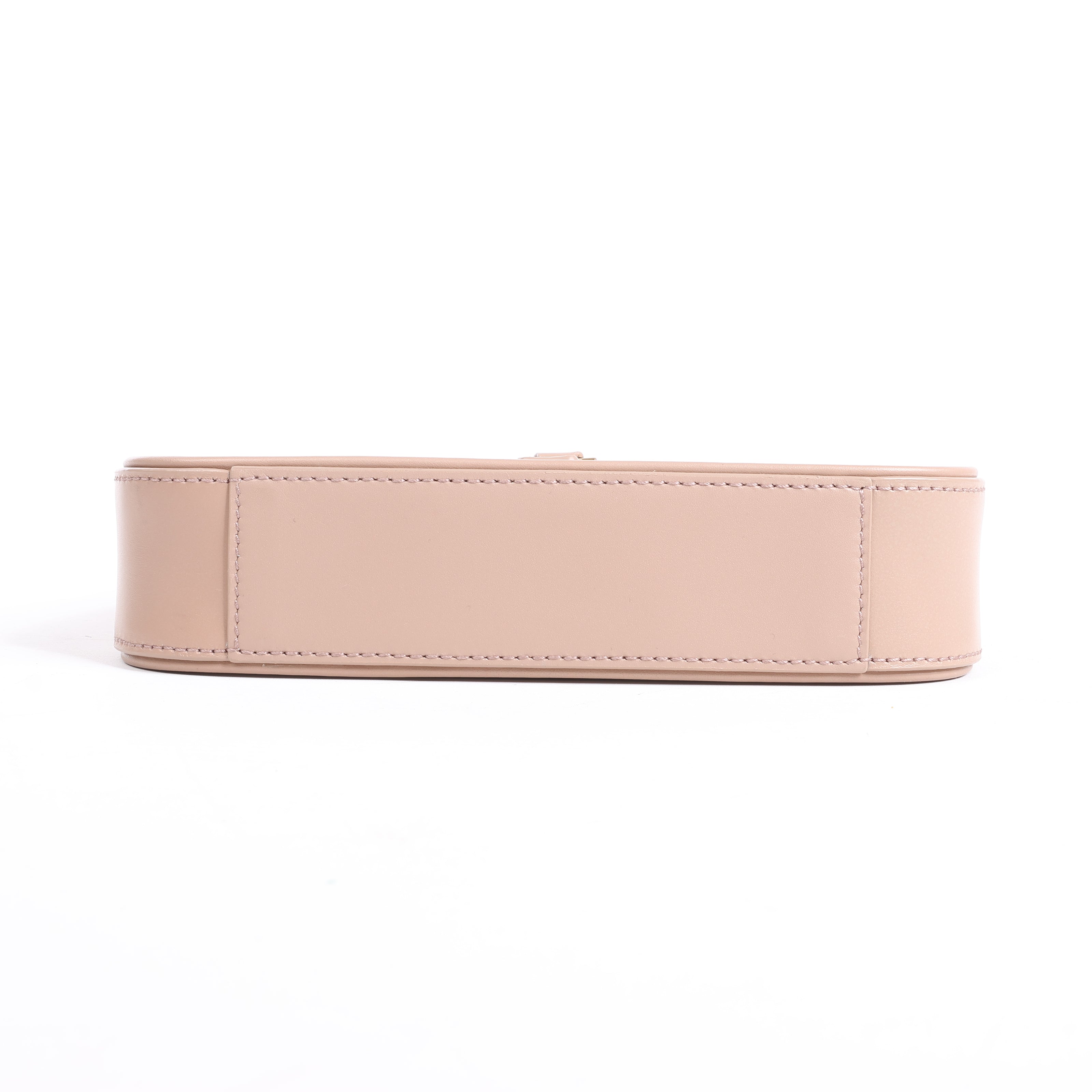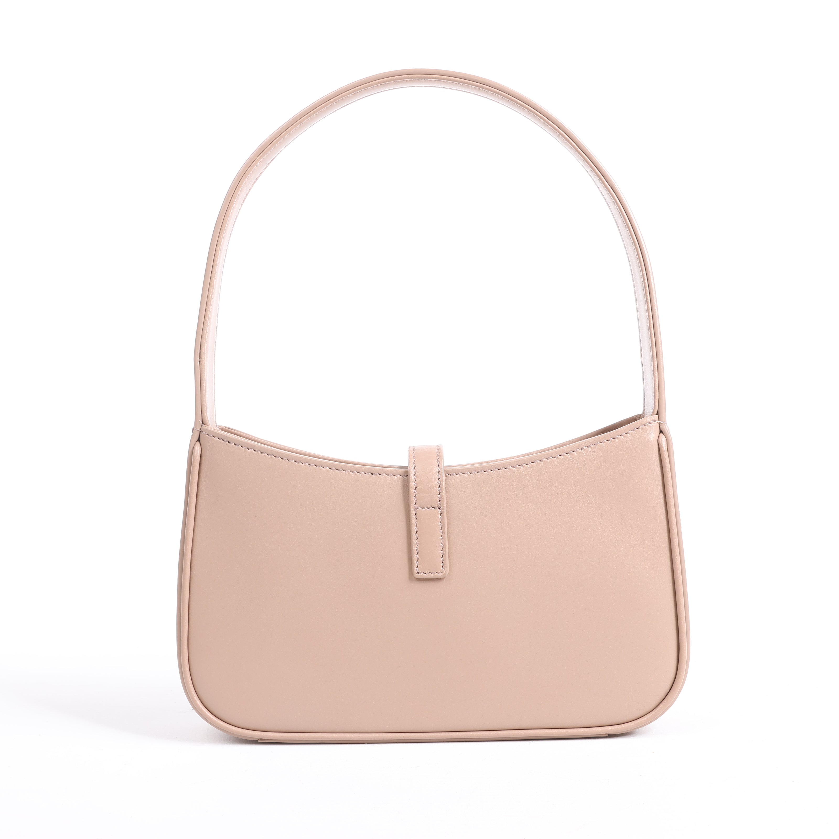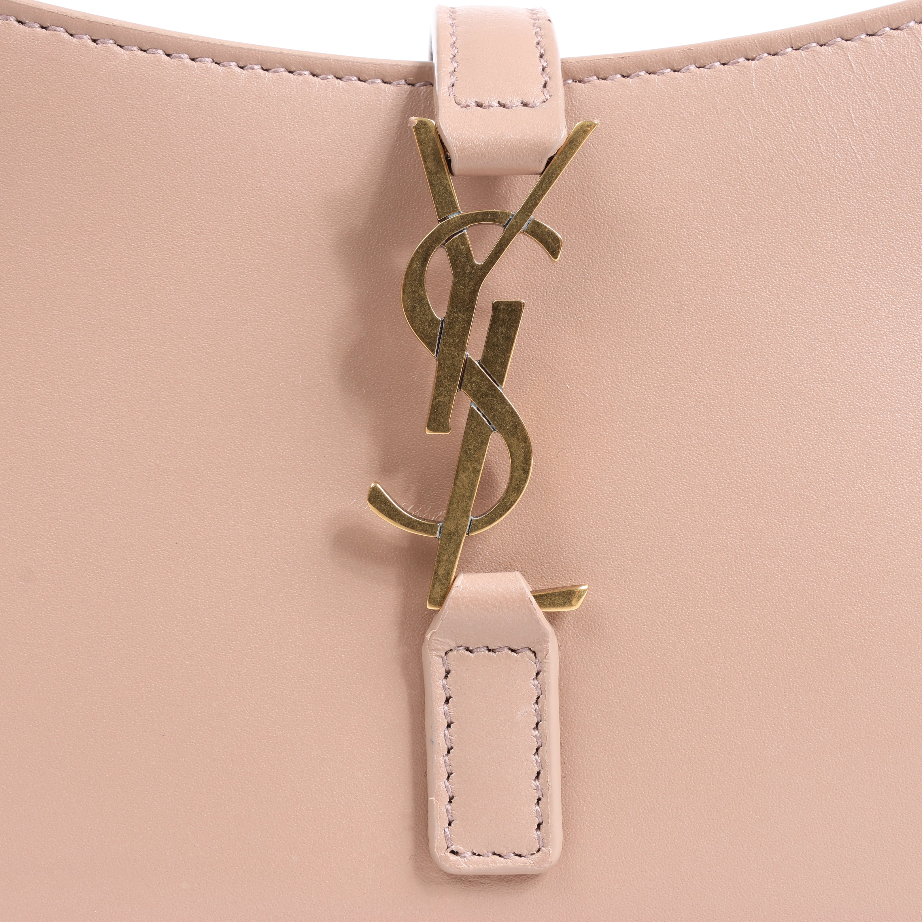 Saint Laurent Le 5 à 7 Mini Hobo bag in soft pink leather, adorned with the signature gold YSL monogram for an elegant touch. Compact yet chic, it’s perfect for both day and evening styling.