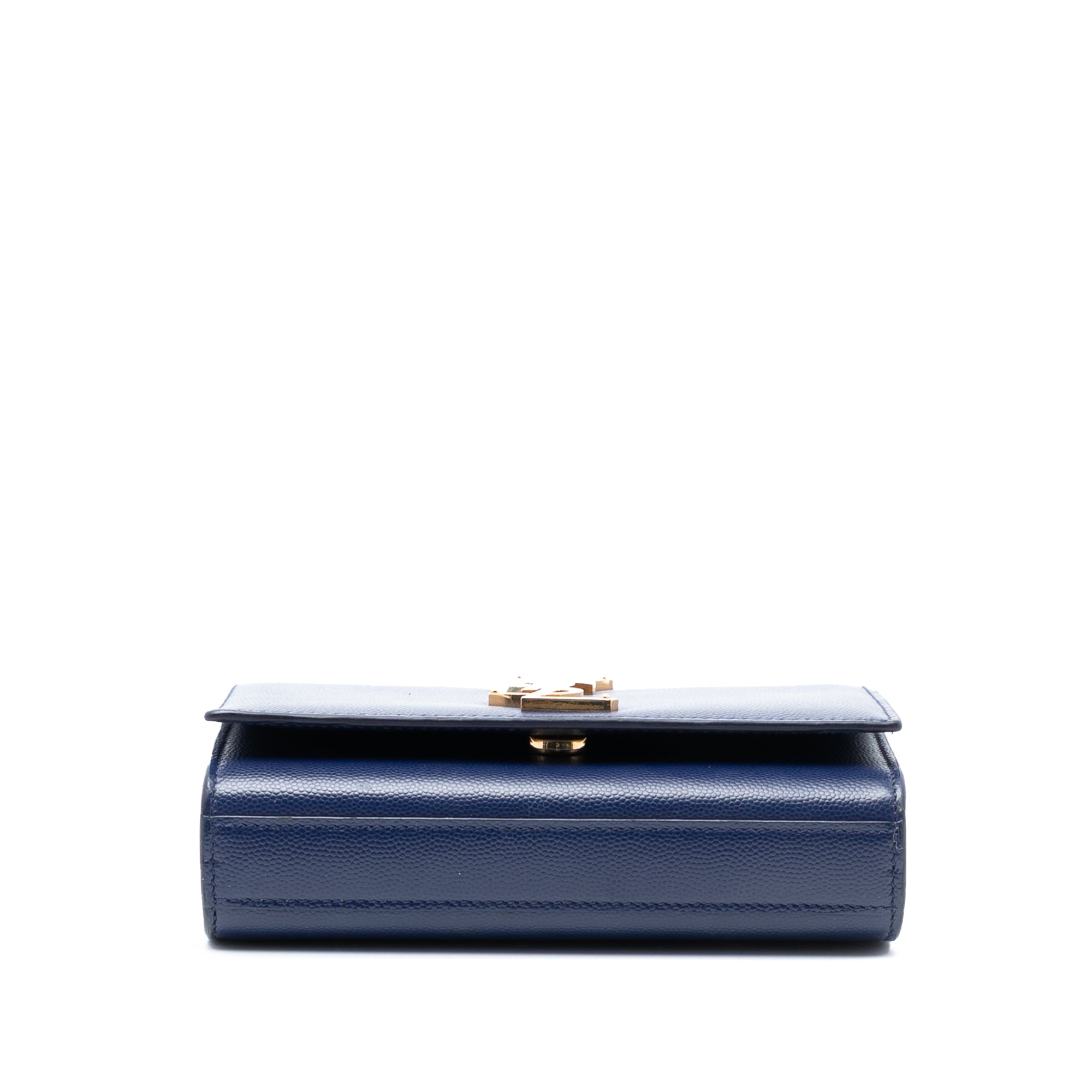 The Kate crossbody bag features a leather body, a gold-tone chain link shoulder strap, a front flap with a metal YSL logo and magnetic closure, and an interior slip pocket. Retail Price: 2100.00