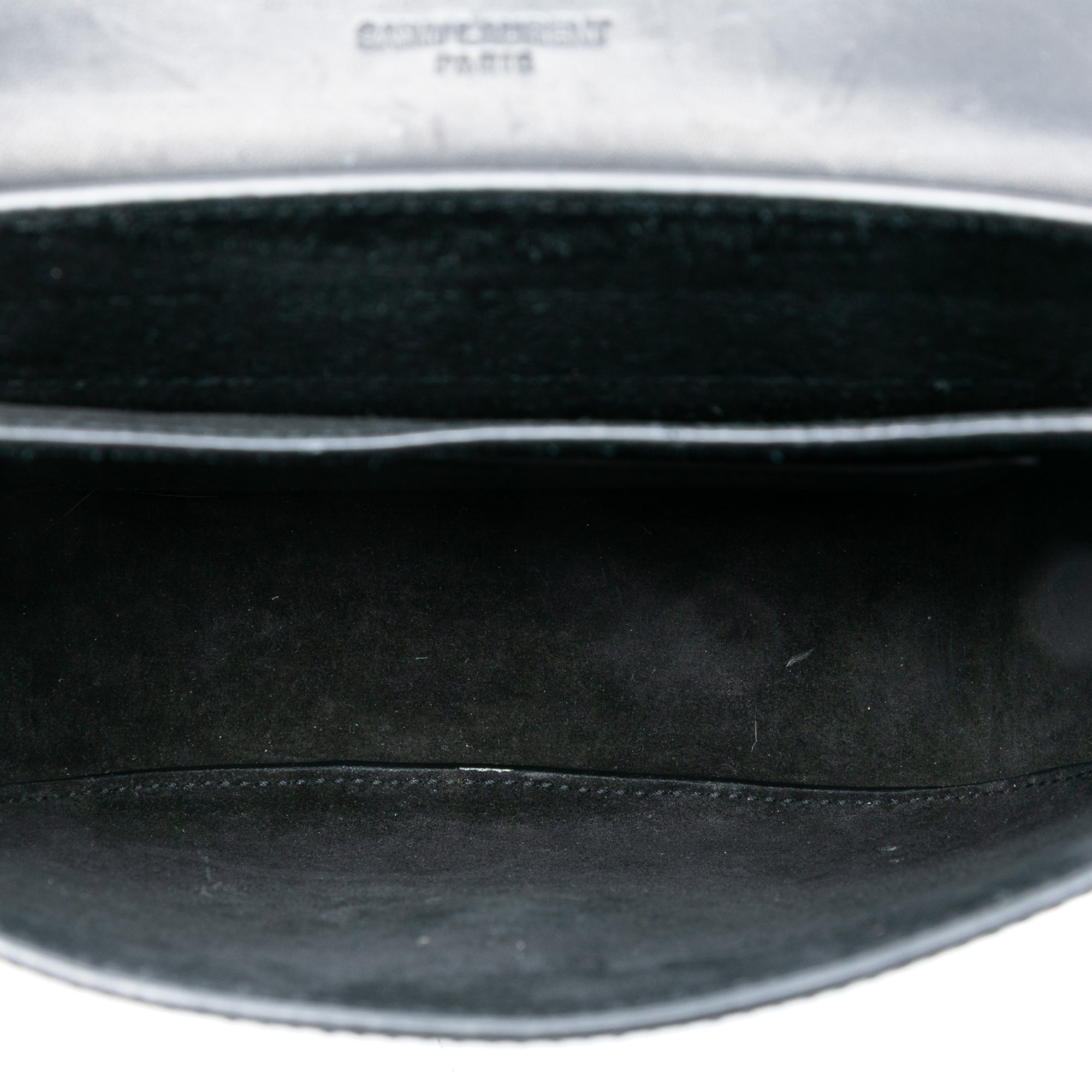 The Kaia features a leather body, an adjustable flat leather strap, a front flap with metal YSL logo and magnetic snap button closure, and an interior slip pocket. Retail Price: 2290.00