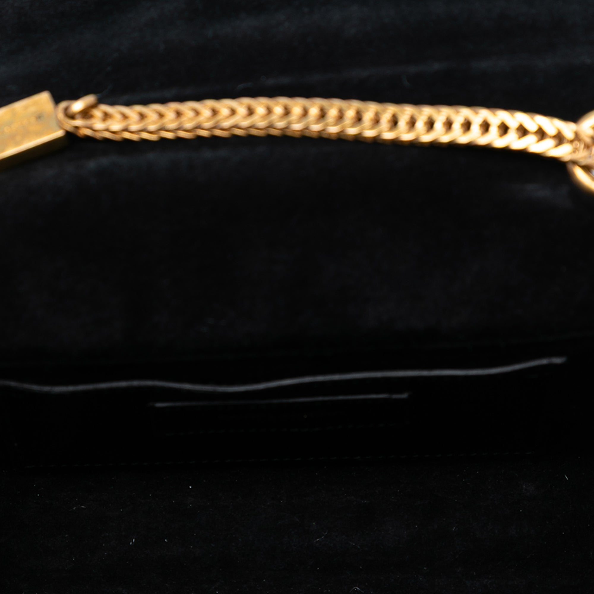 The Kate features a leather body with a metal tassel detail, a gold-tone chain-link shoulder strap, a front flap with magnetic snap closure, and an interior slip pocket. Inclusion: Dust bag. Retail Price: 2190.00