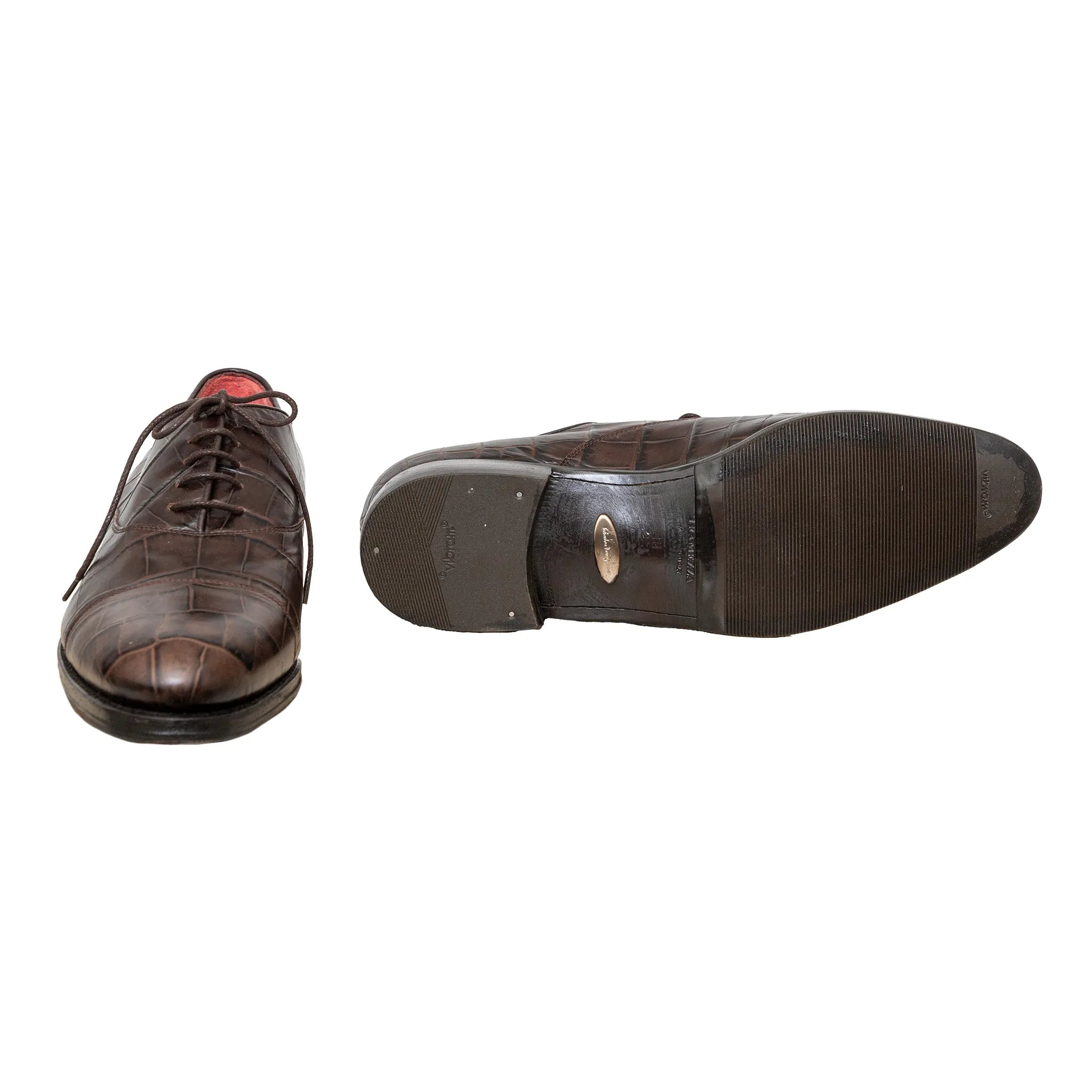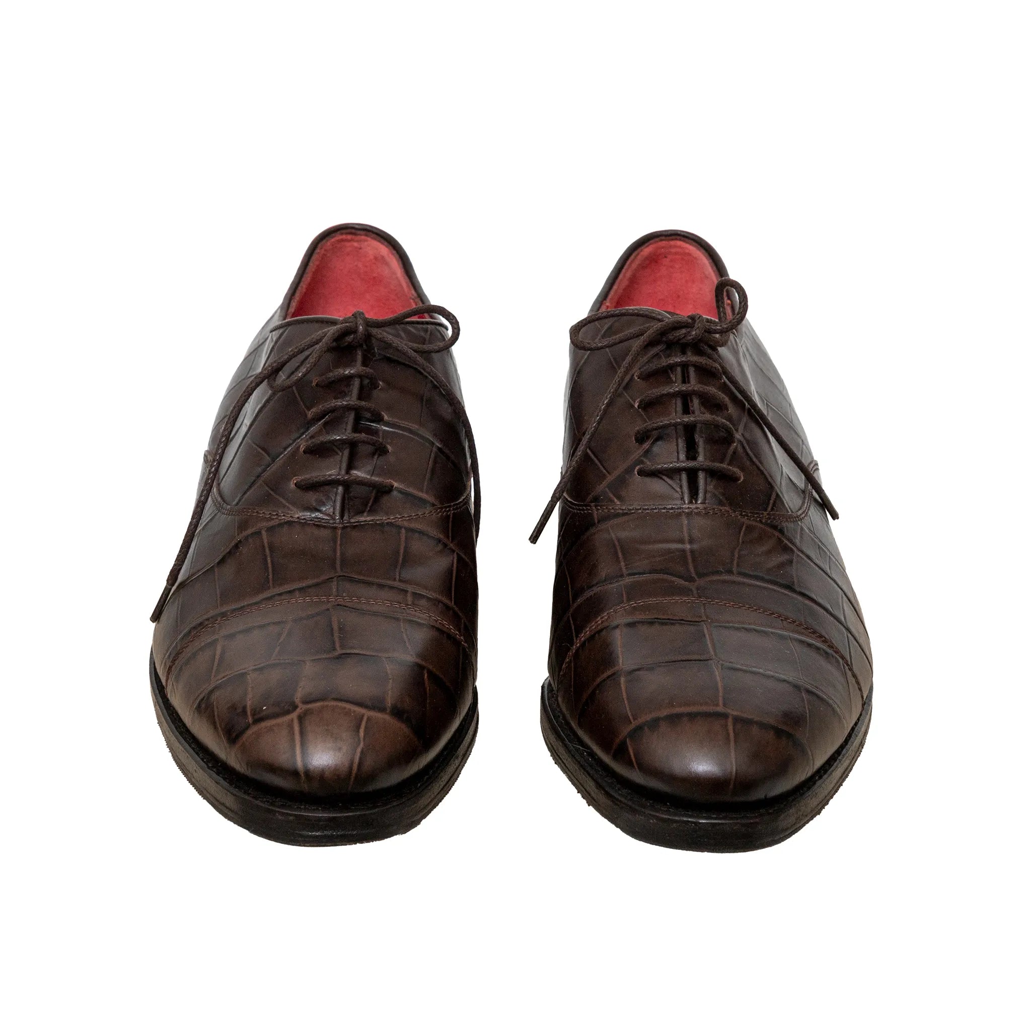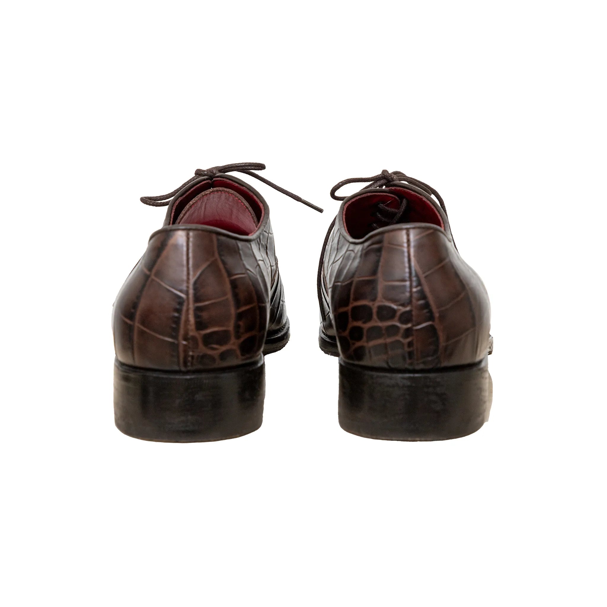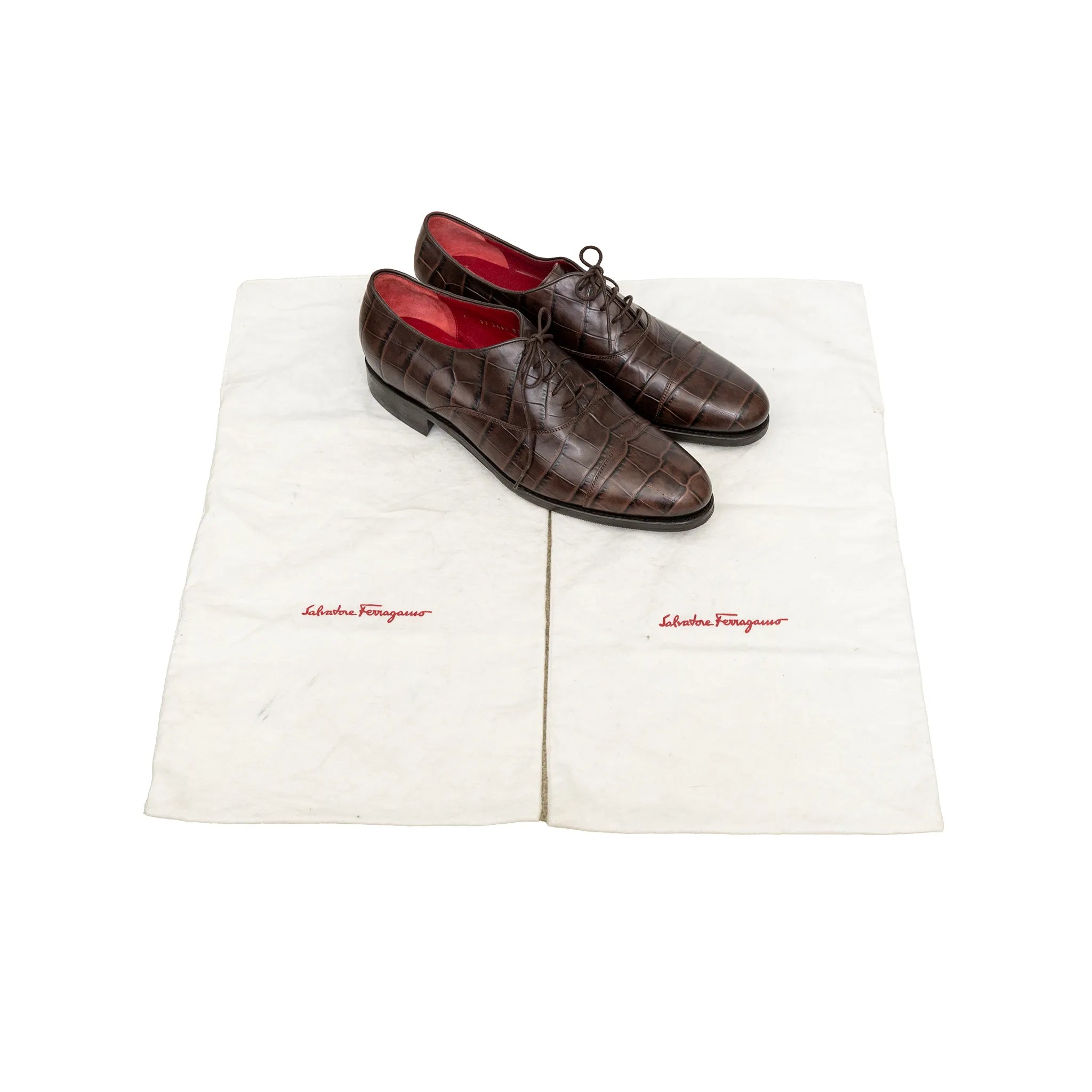 Salvatore Ferragamo Oxford shoes in brown embossed leather. Slim fit with a straight, narrow tip. Classic design with a modern, polished edge.