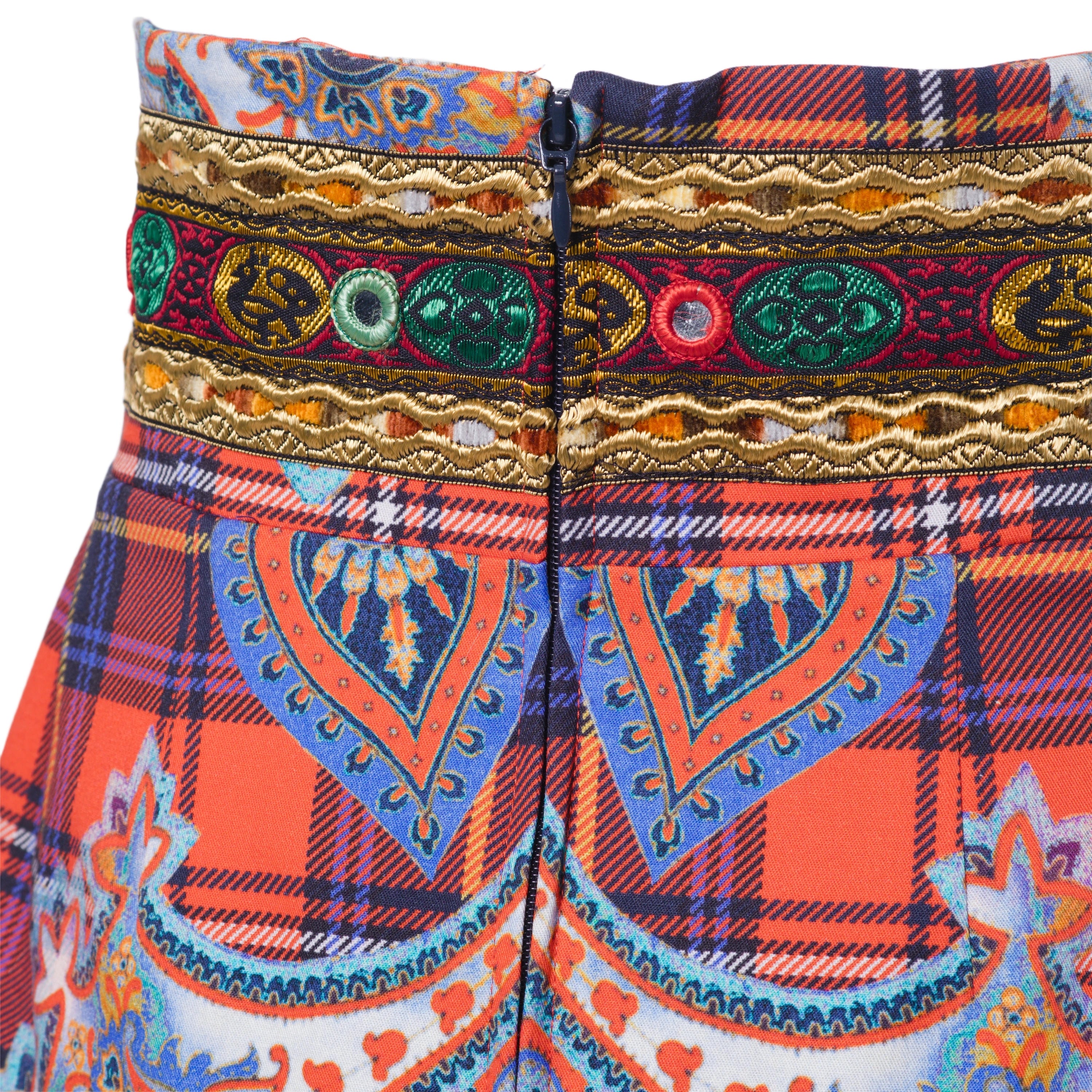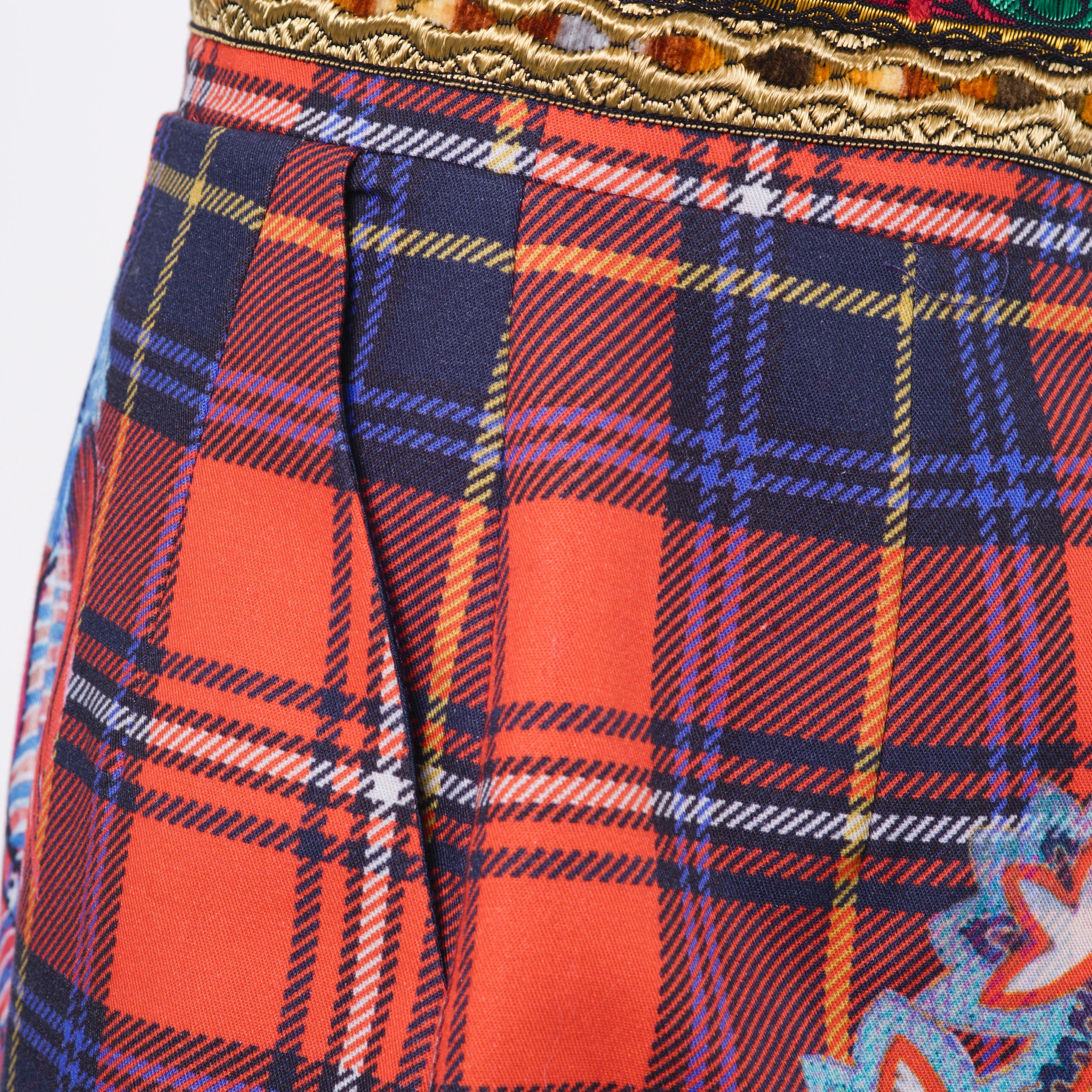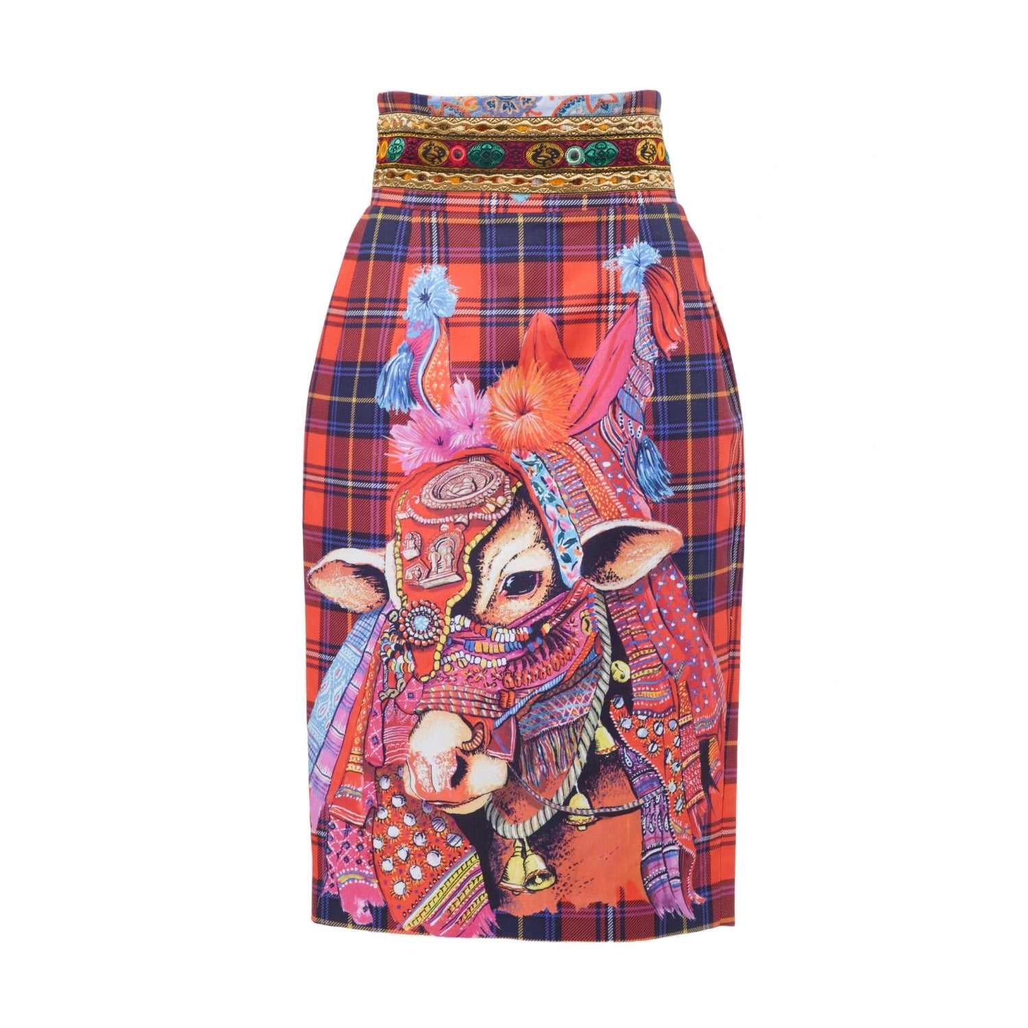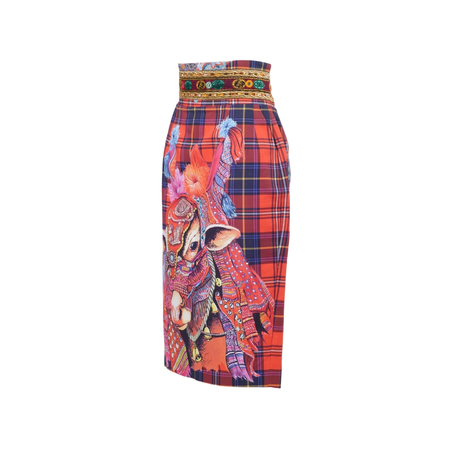 High-waisted pencil skirt from Stella Jean Fall 2015 Ready-to-Wear, crafted in cotton with a vibrant tartan base and richly detailed figurative and ornamental prints. The design features a statement animal motif at the front, a symmetrical decorative composition at the back and a multicolored folkloric waistband, reflecting the brand’s signature fusion of cultural heritage and contemporary tailoring.