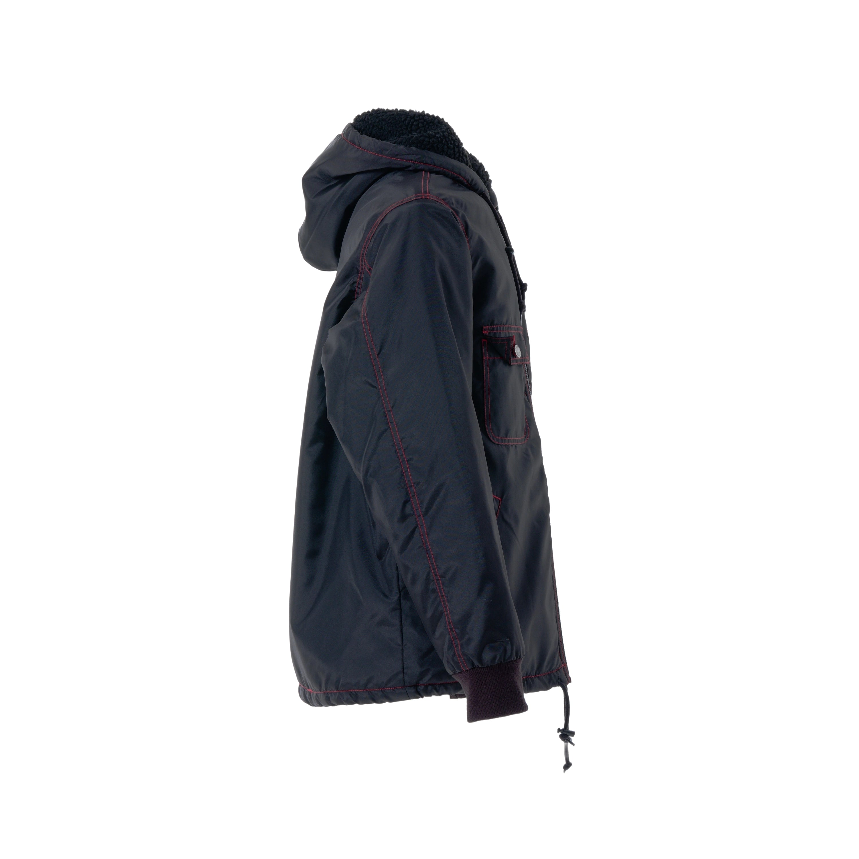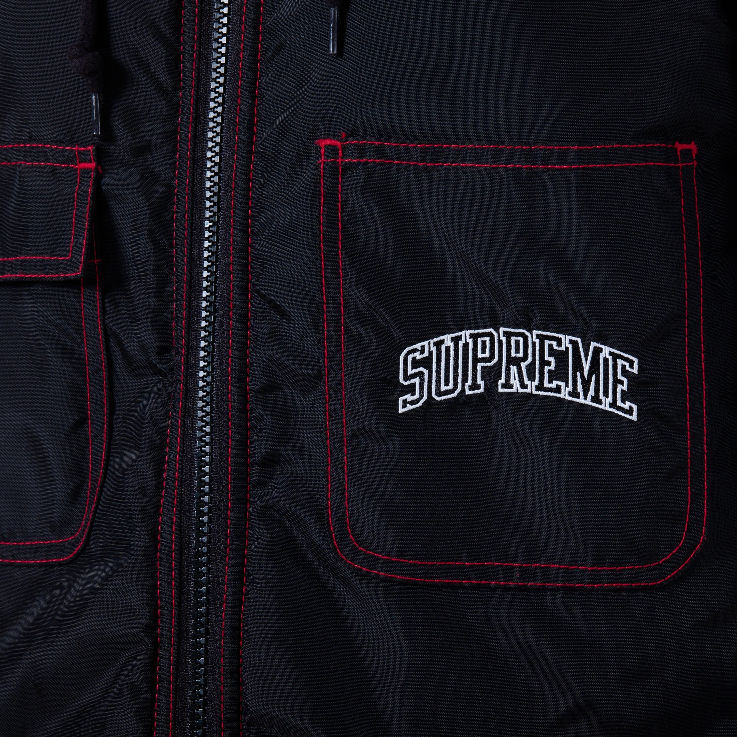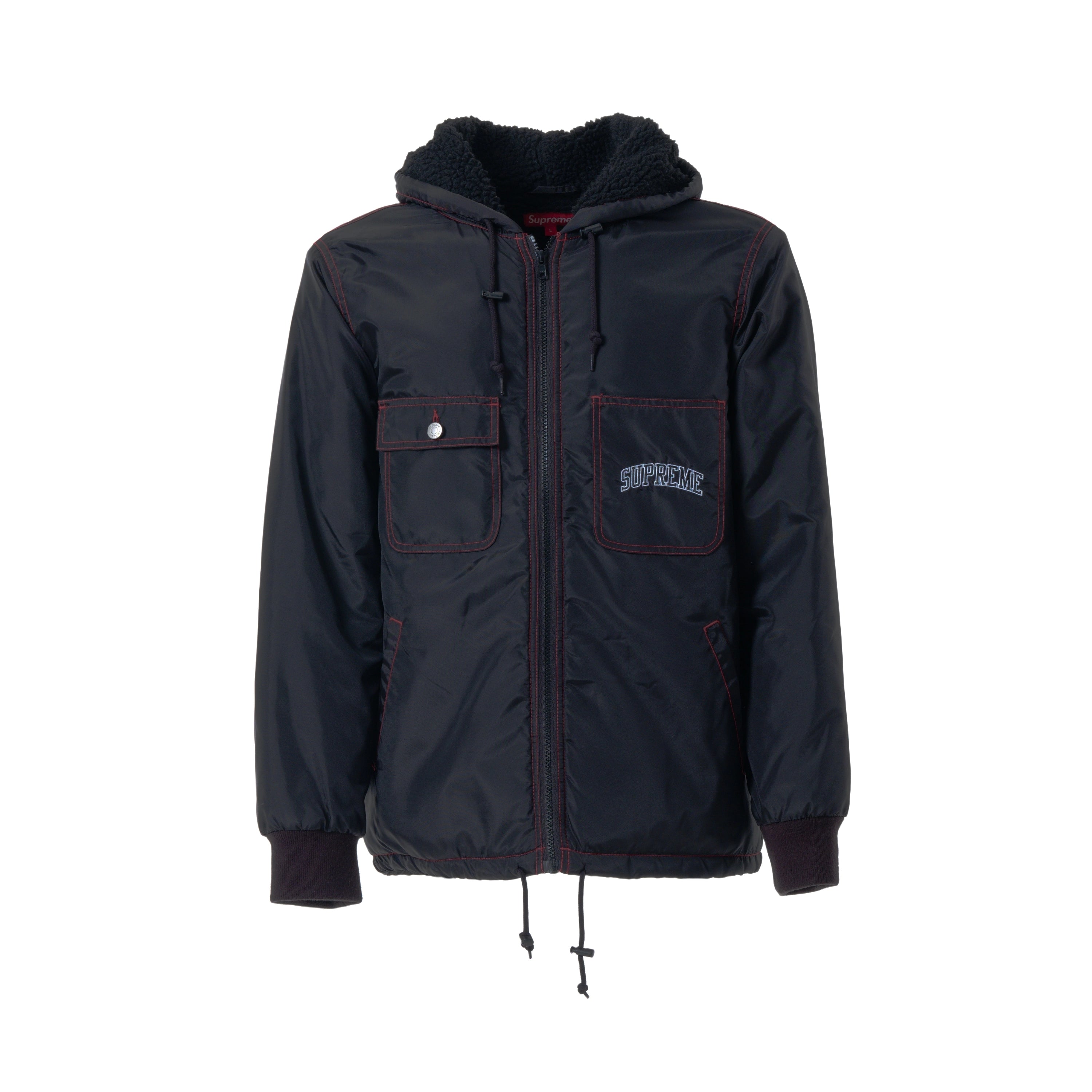 Supreme hooded jacket crafted from black nylon with contrast red stitching and a soft faux-shearling lining. Designed with a full zip closure, drawstring hood, ribbed cuffs and signature front pockets, including an embroidered Supreme logo chest pocket. Warm, functional and a classic streetwear piece.