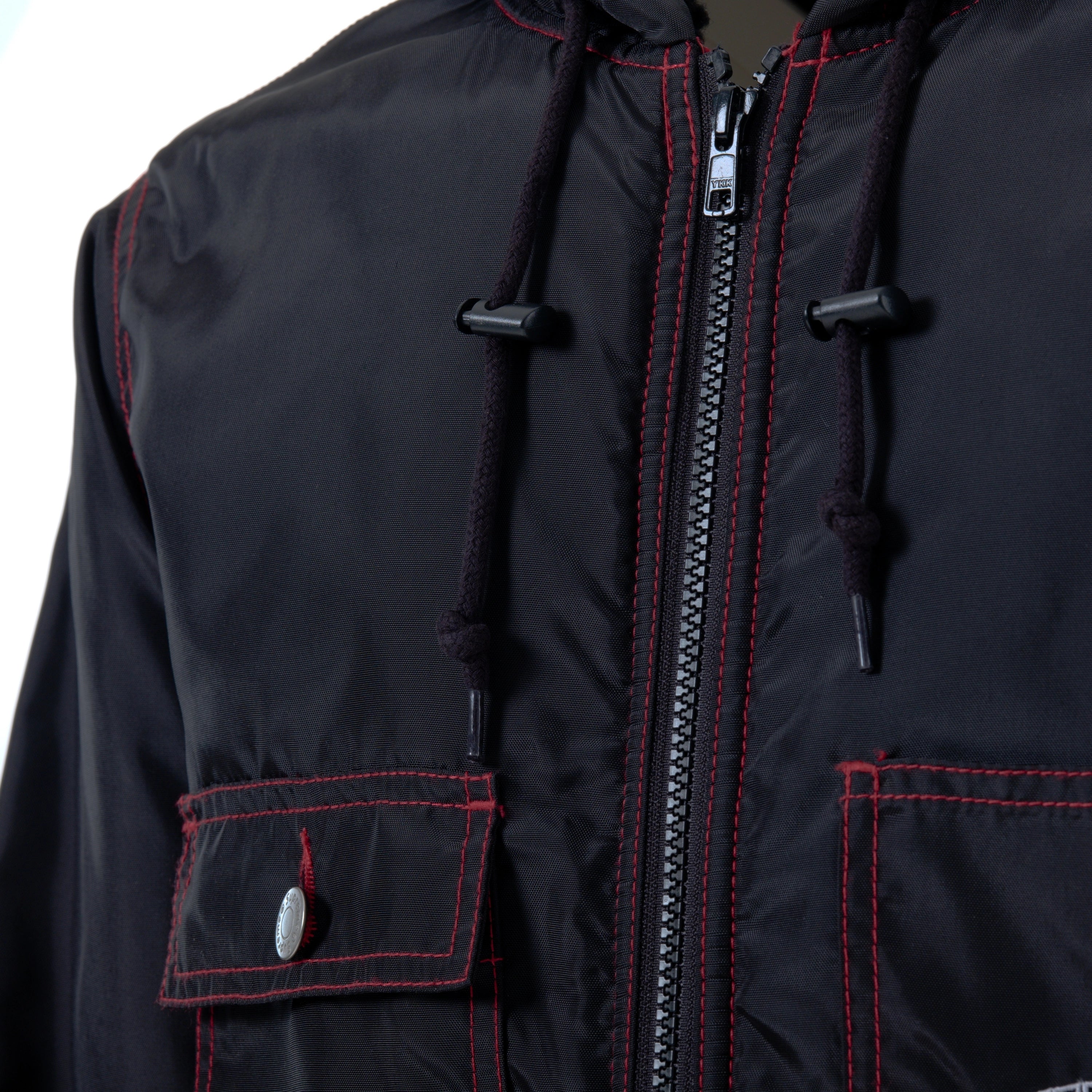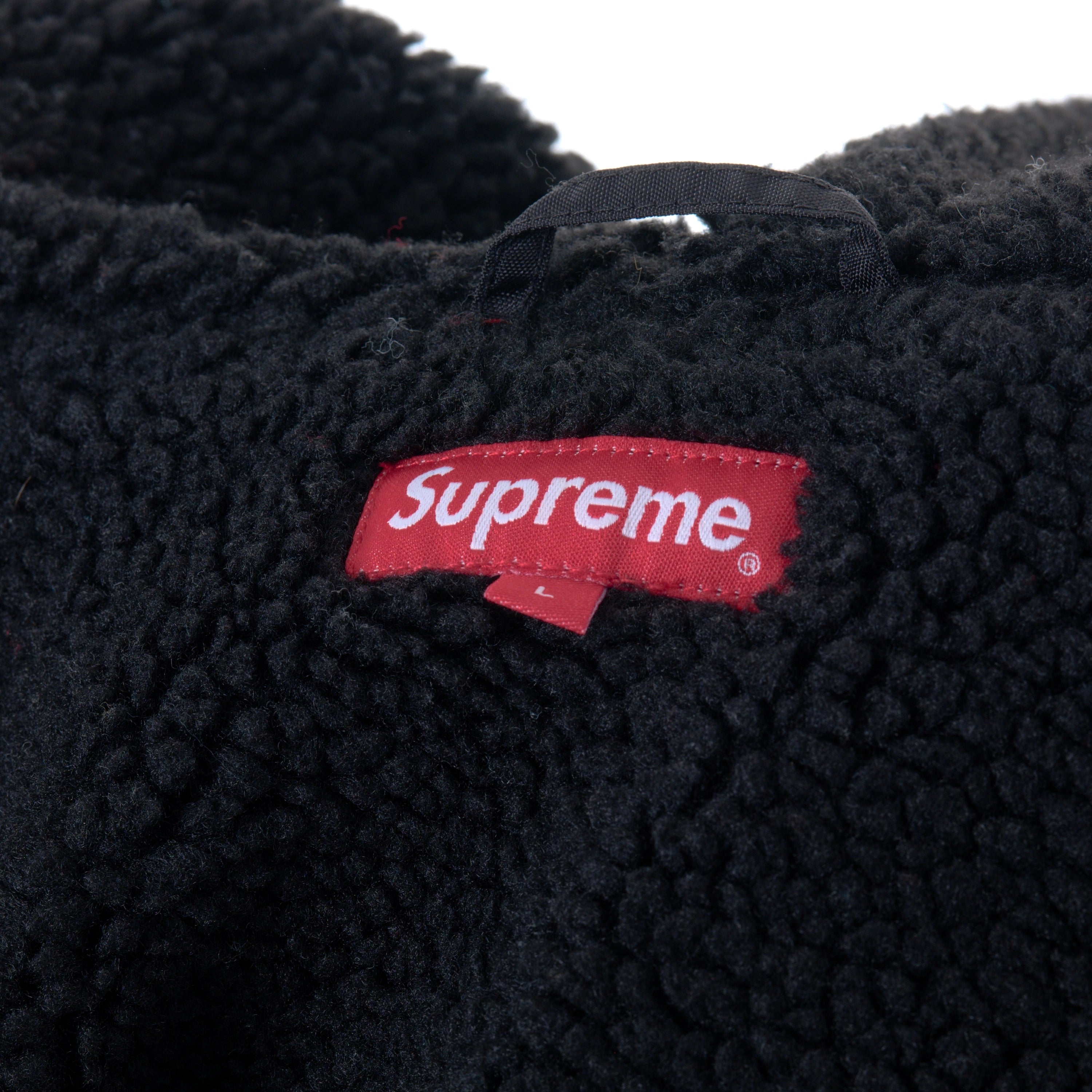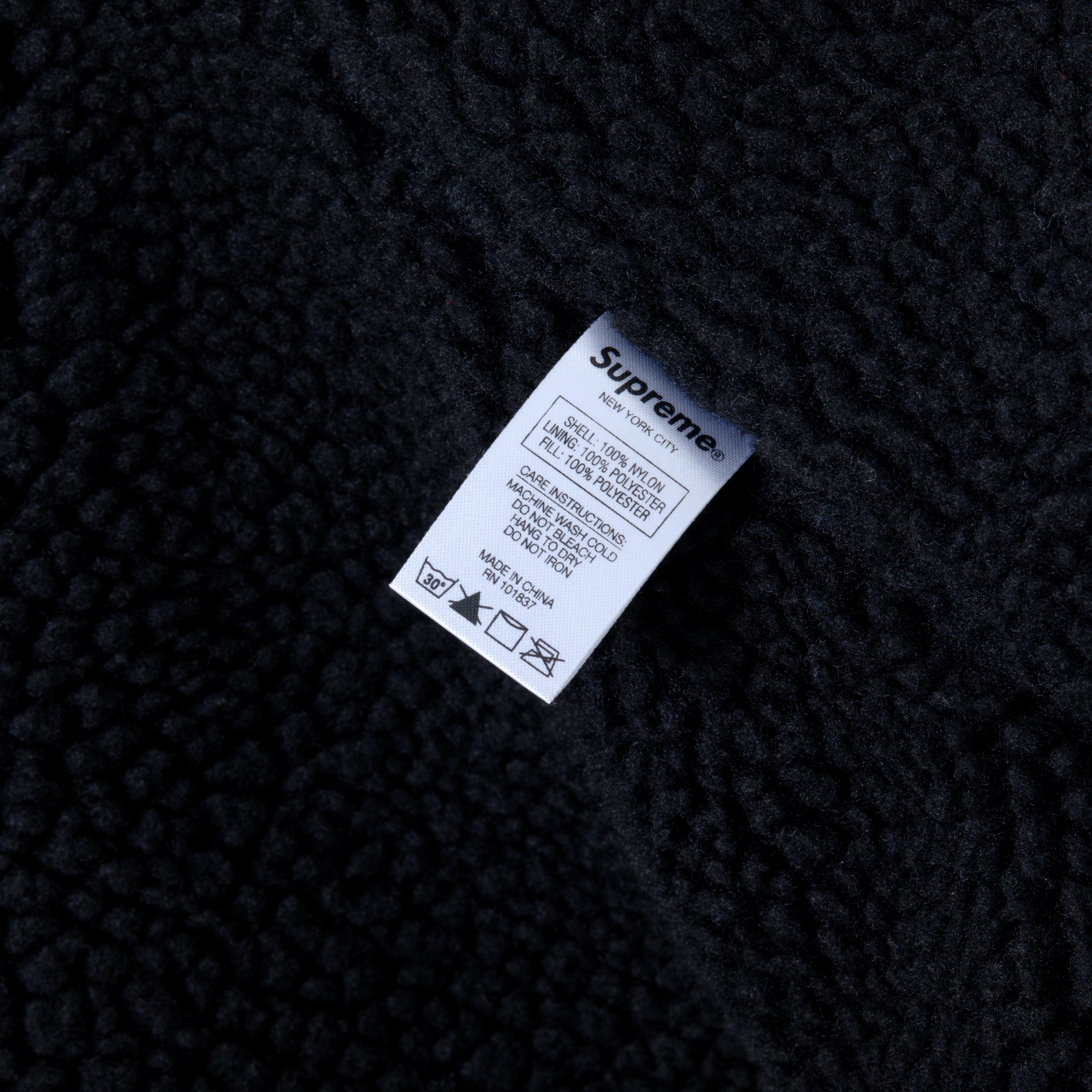 Supreme hooded jacket crafted from black nylon with contrast red stitching and a soft faux-shearling lining. Designed with a full zip closure, drawstring hood, ribbed cuffs and signature front pockets, including an embroidered Supreme logo chest pocket. Warm, functional and a classic streetwear piece.