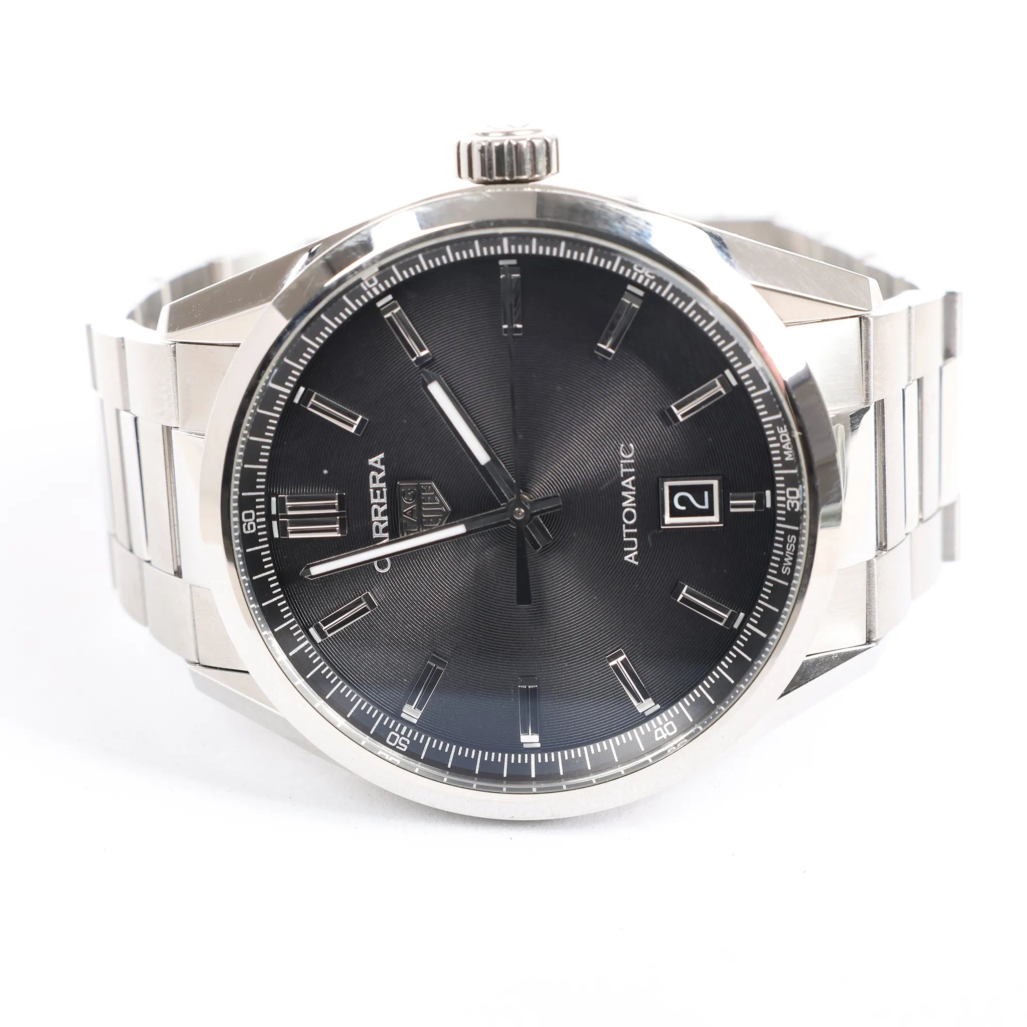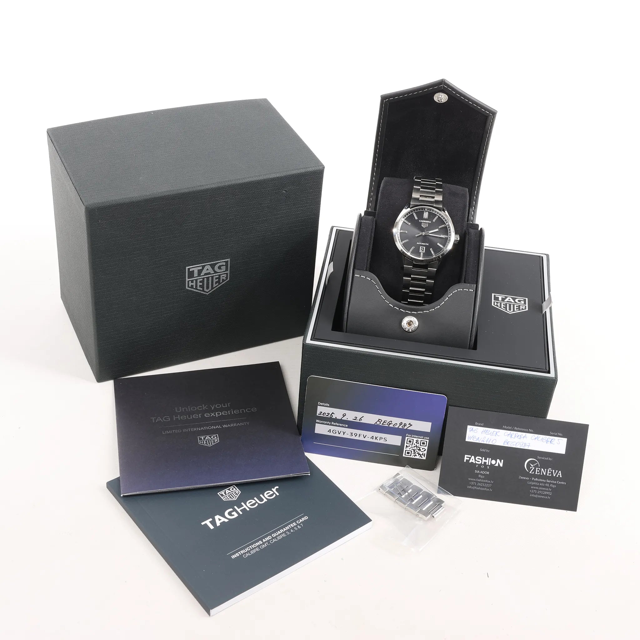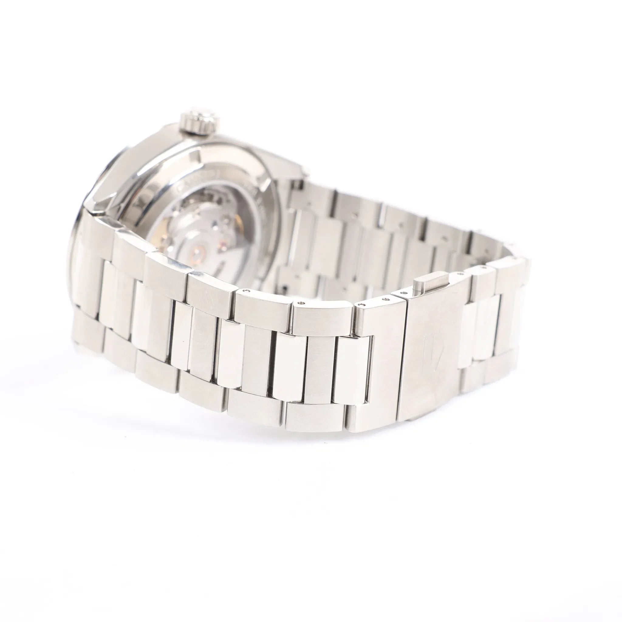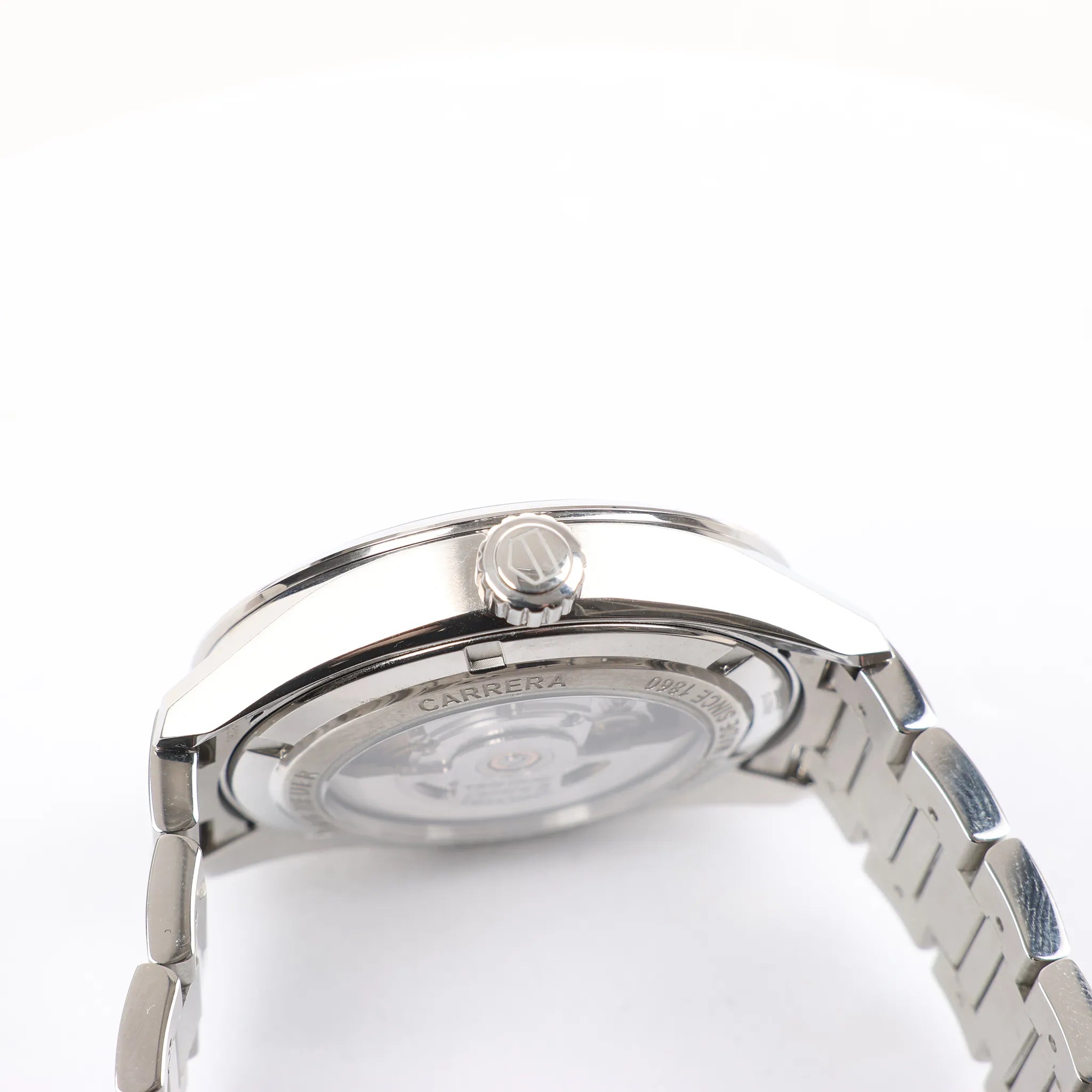 Brand: TAG Heuer Model: Carrera Calibre Reference: WBN2110Serial No.: BEG0987Condition: Never wornCondition Details: -Dial Colour: BlackDial Material: Stainless steel Starp Colour: SilverStrap material: Steel Movement: AutomaticFace Diameter: 39 mmApprox. circumference: 19 cmComes With: Box, Case, Papers, Certificate, Extra links, Service card