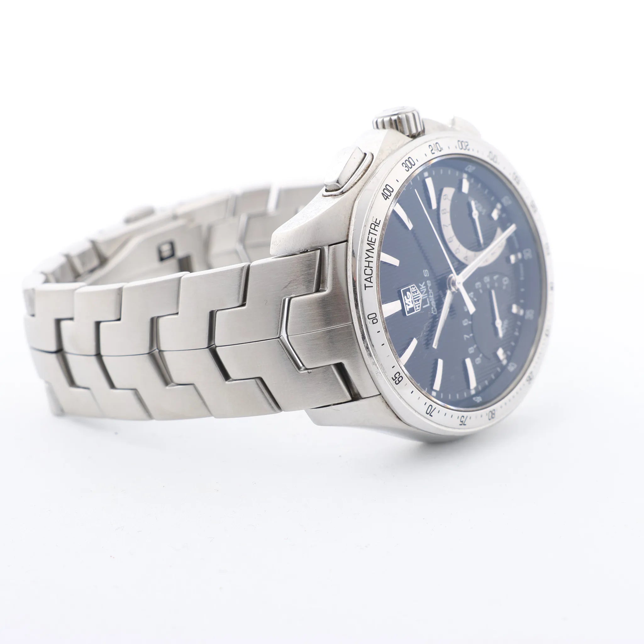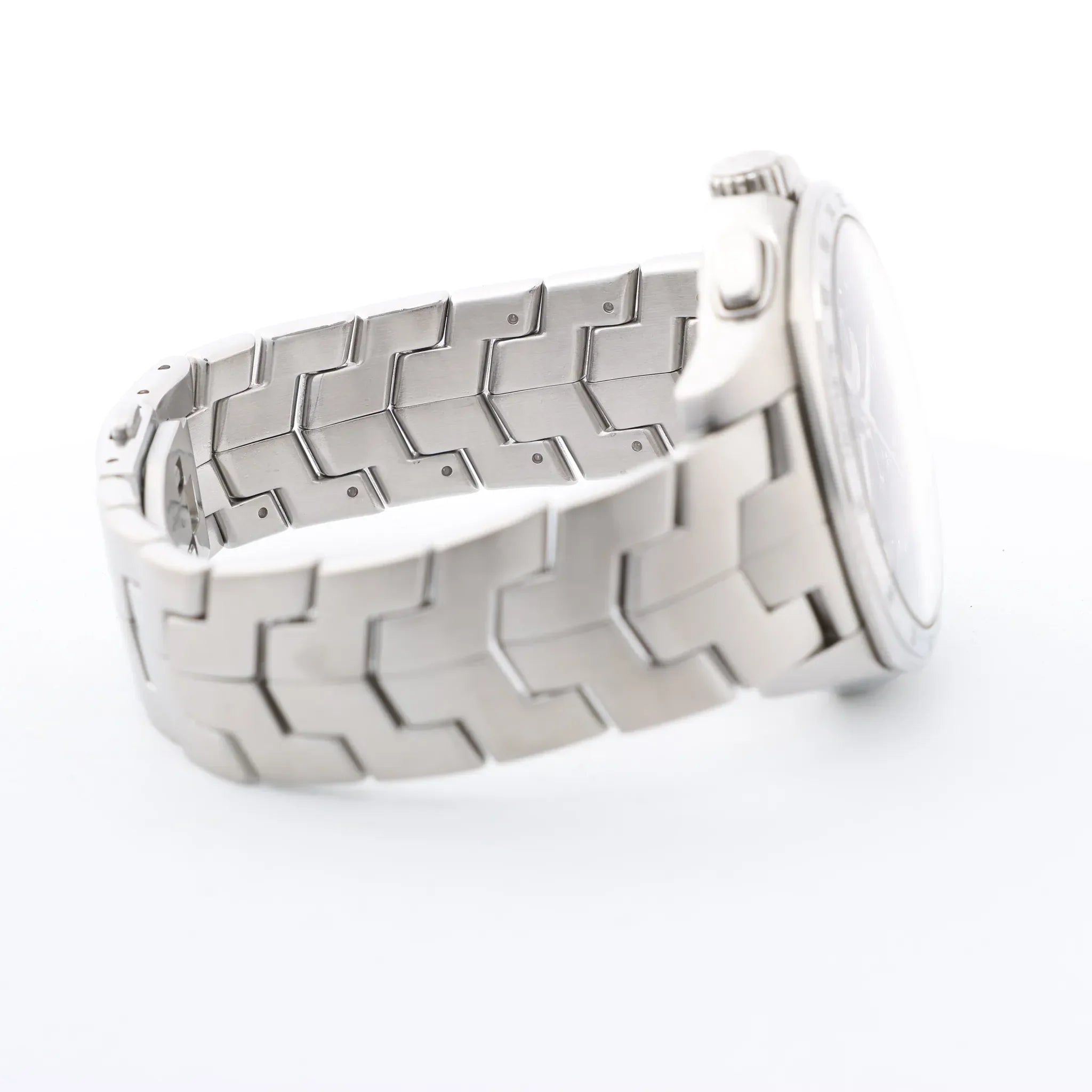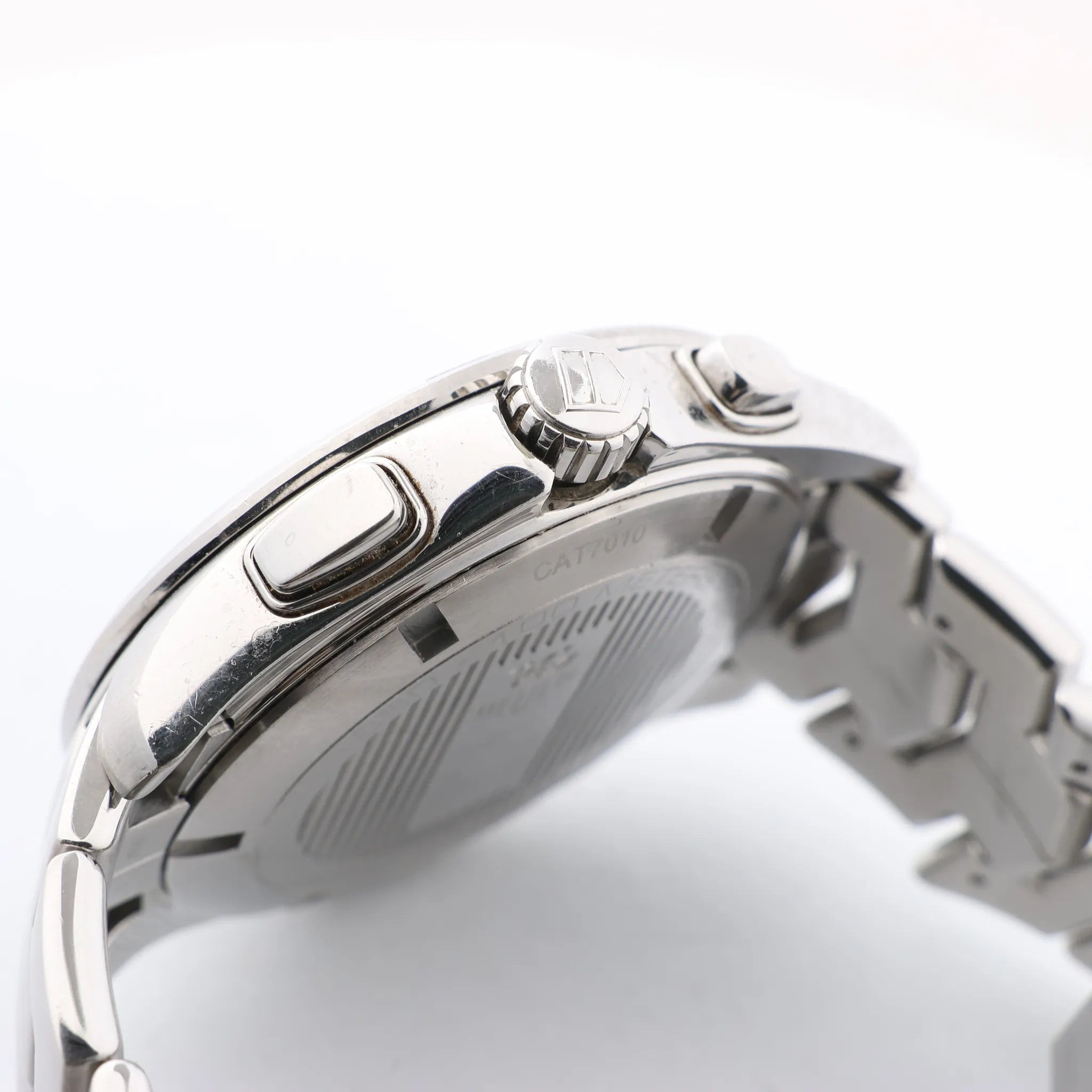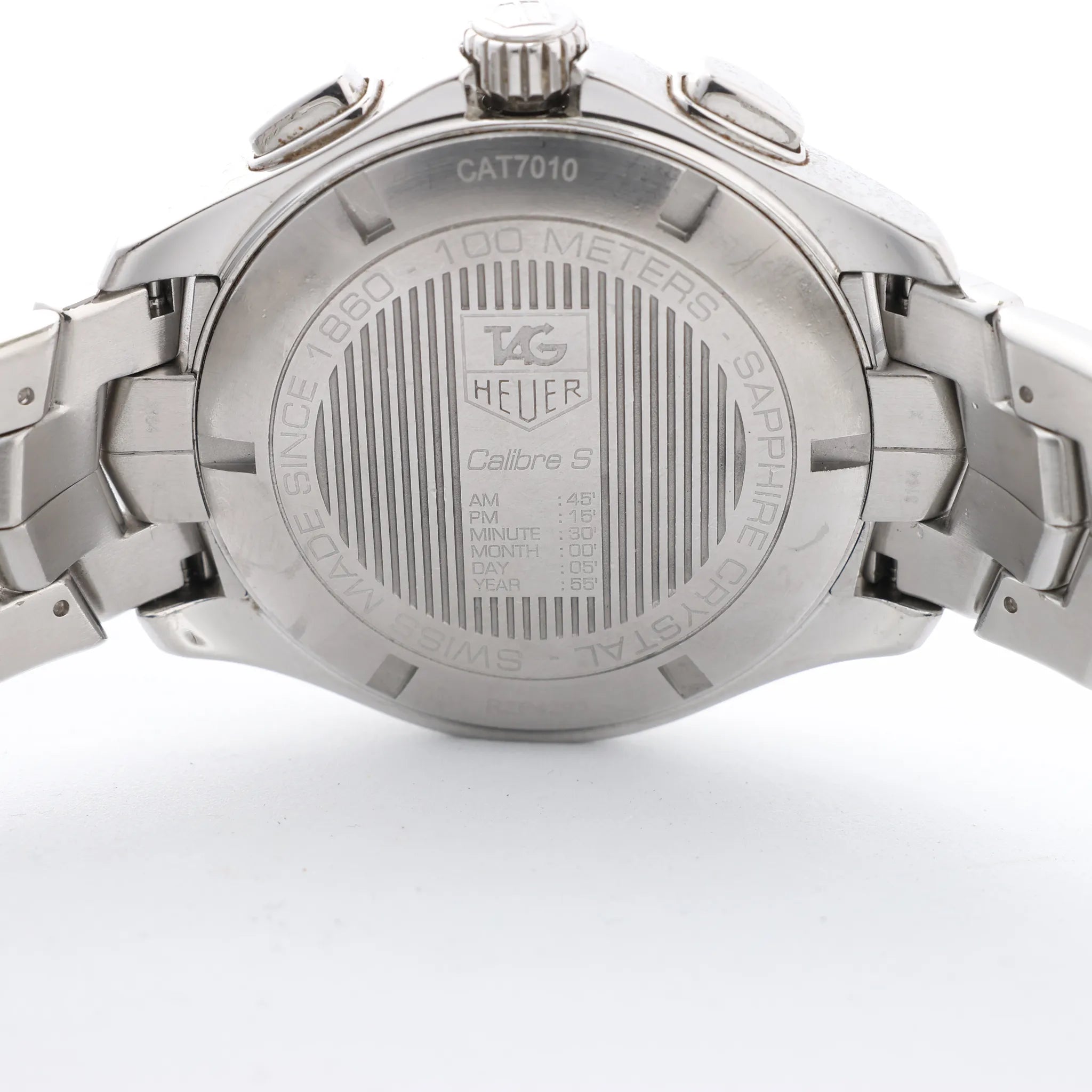 The TAG Heuer Link Calibre S CAT7010 blends precision with sport-luxury appeal. Crafted in stainless steel, this Swiss-made quartz chronograph features a bold black dial with tachymeter scale and dual sub-dials for ultimate performance tracking.