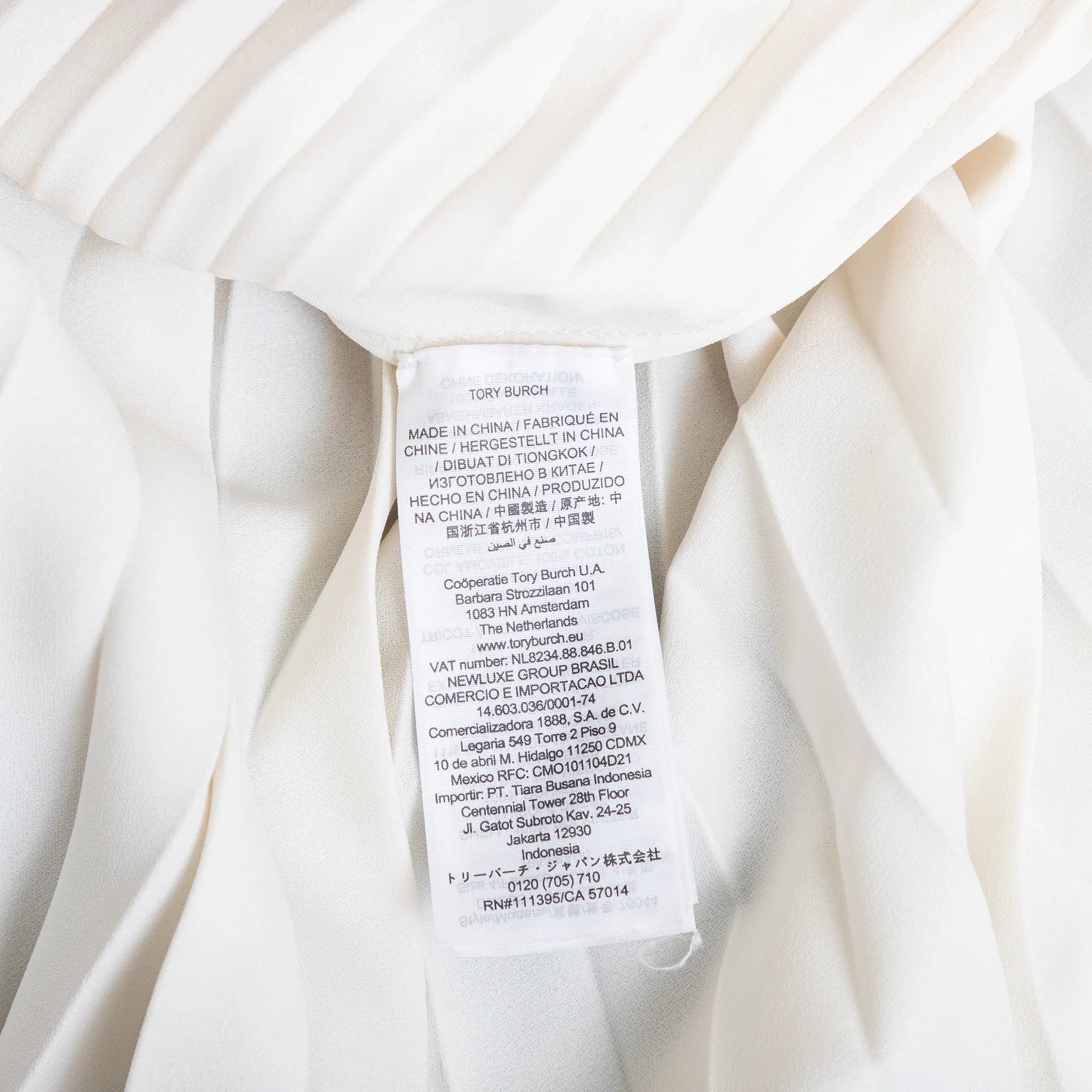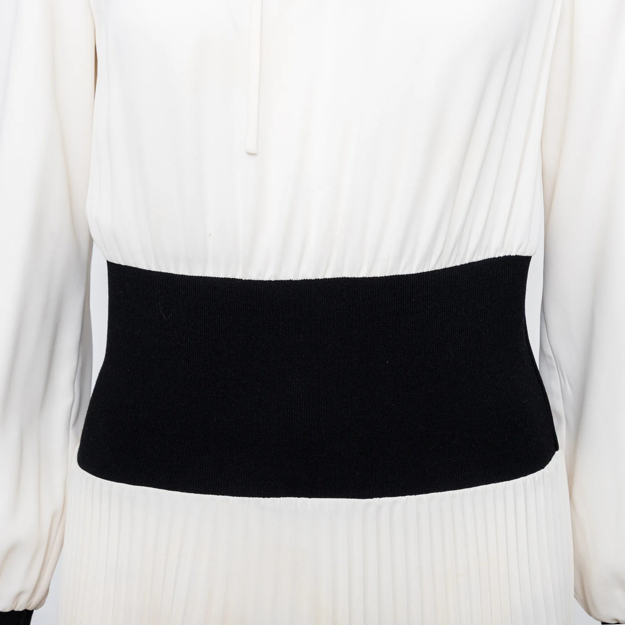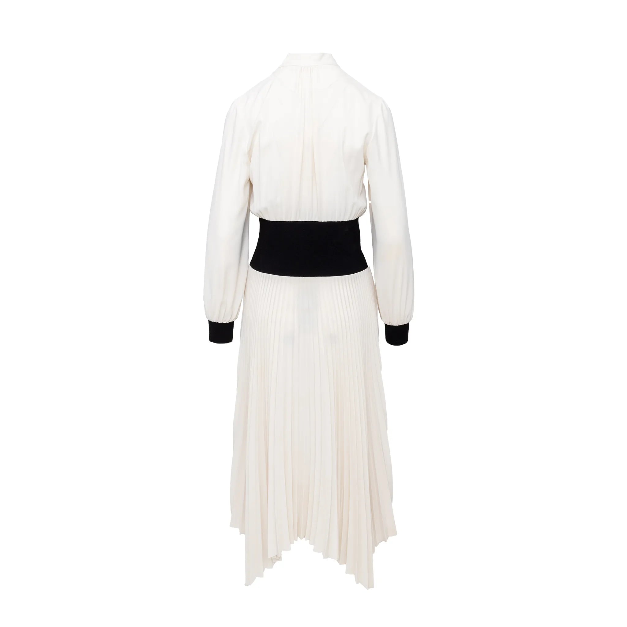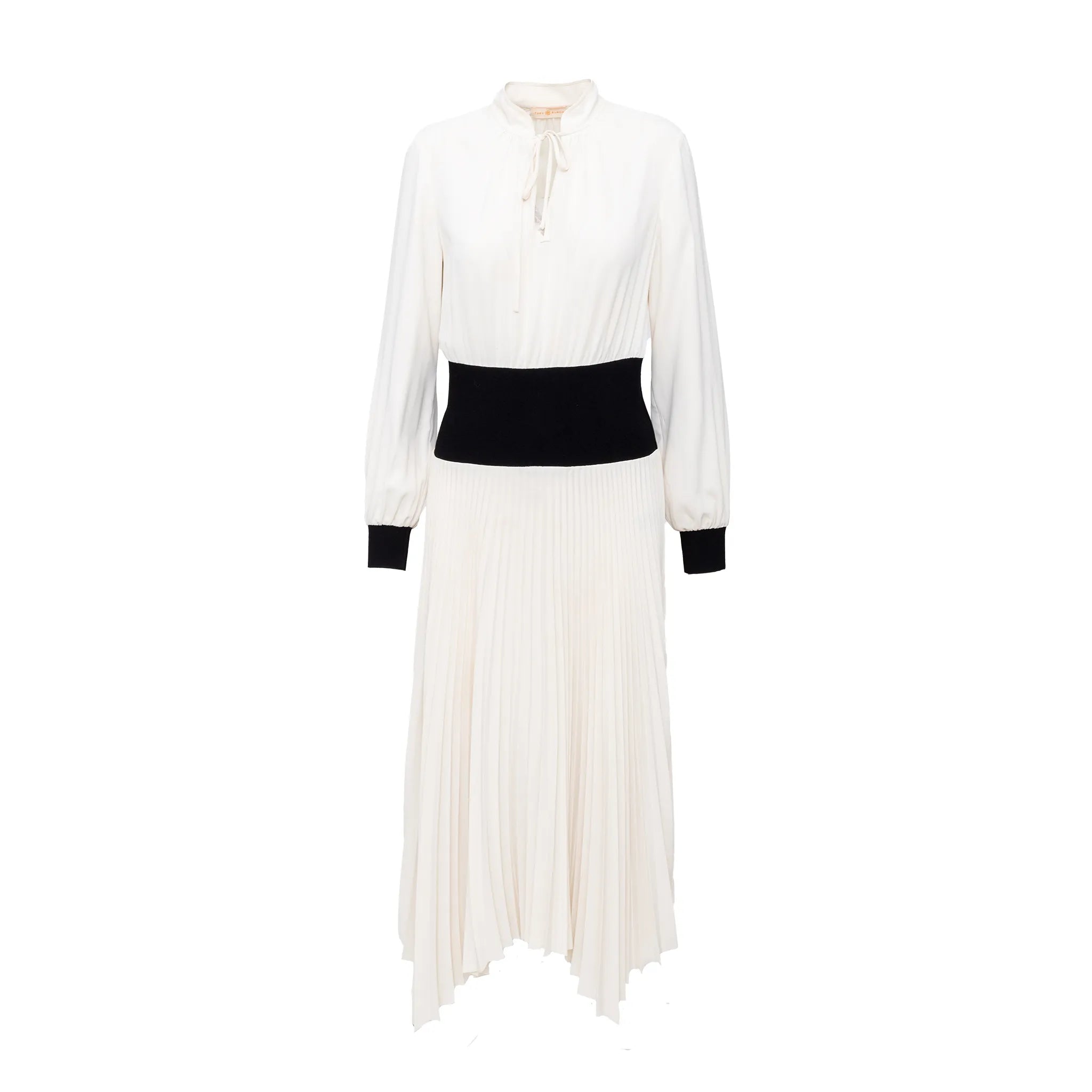 Evoke old‑Hollywood glamour in this Tory Burch pleated midi dress: ivory bodice with contrast waistband, flowy pleated skirt, long sleeves & delicate tie neck.
