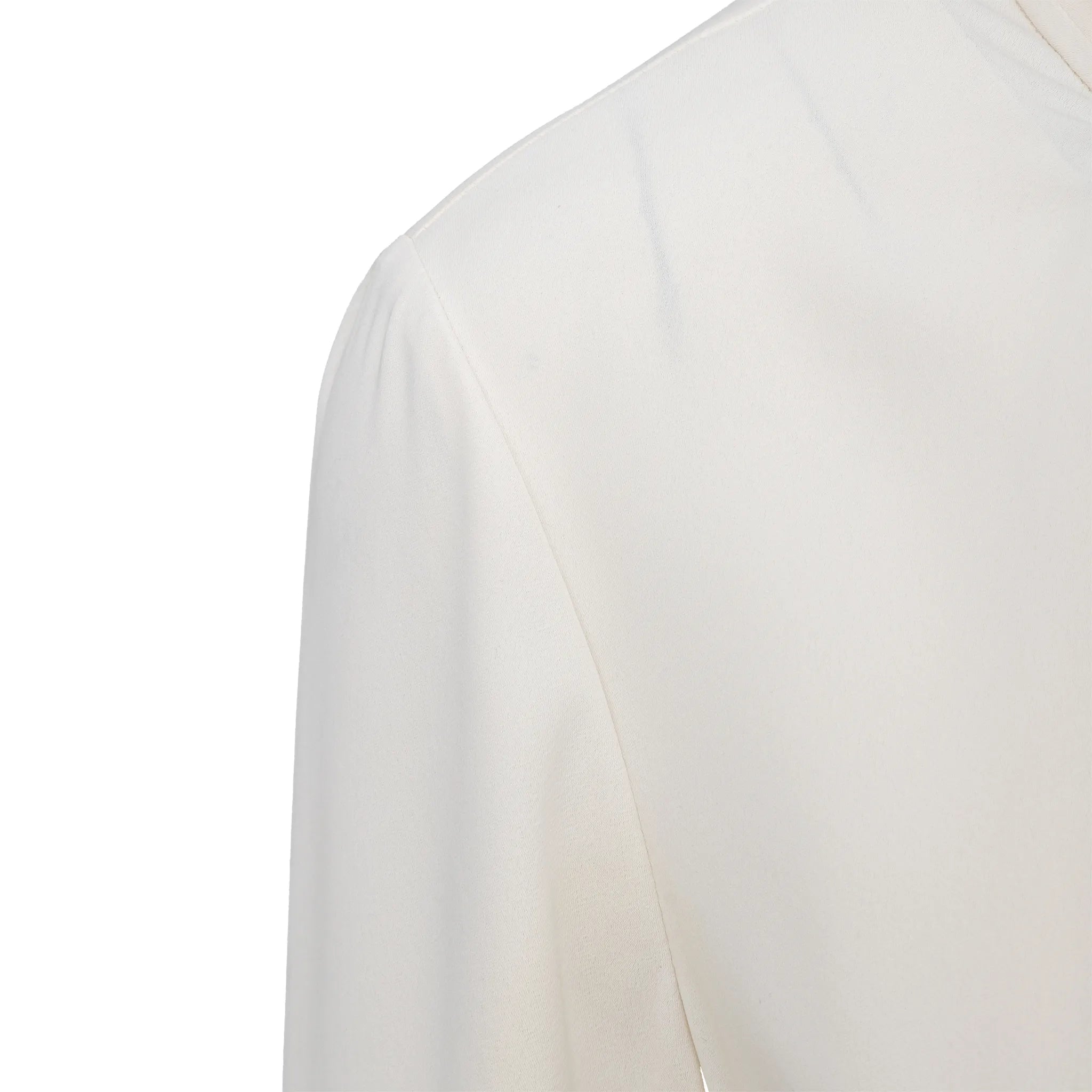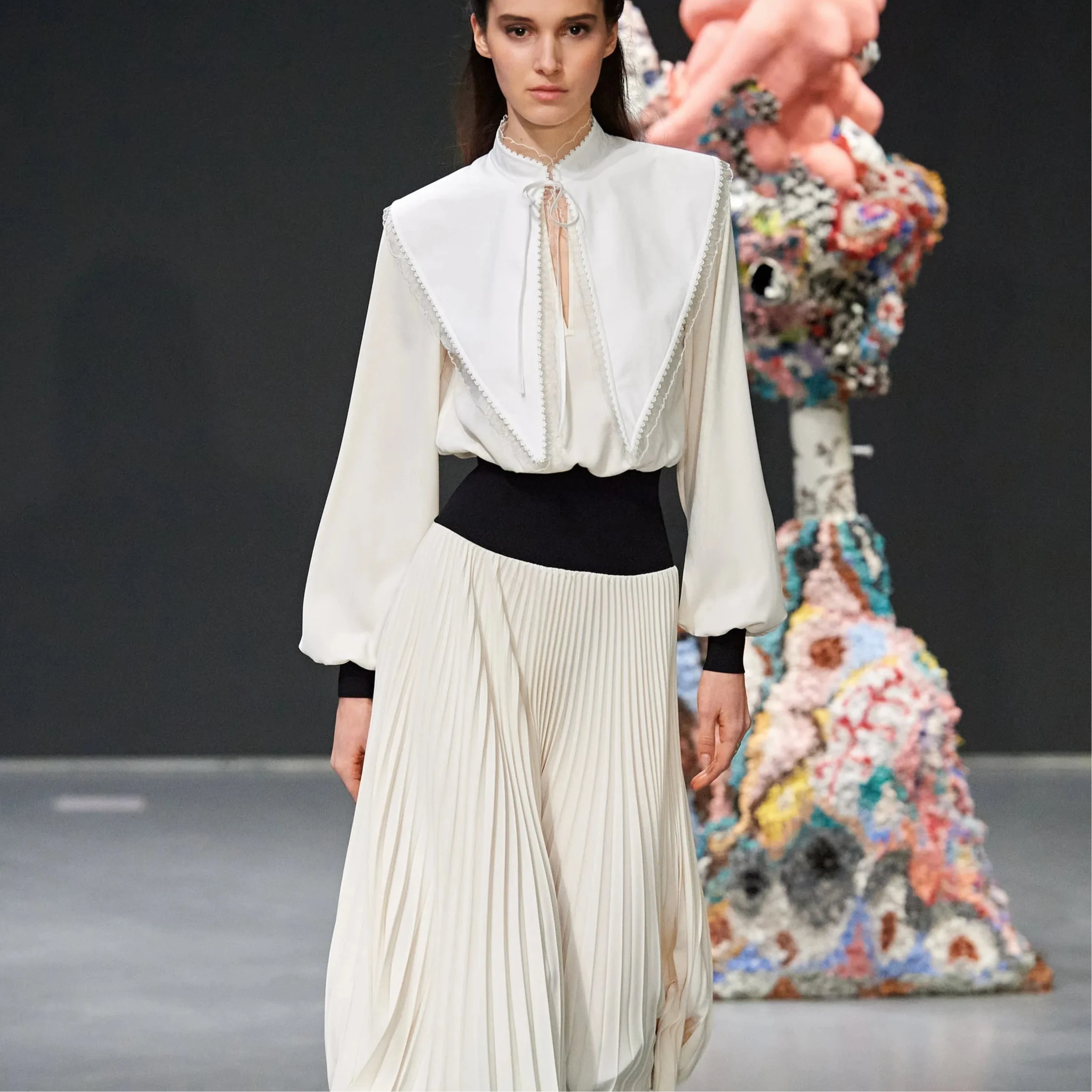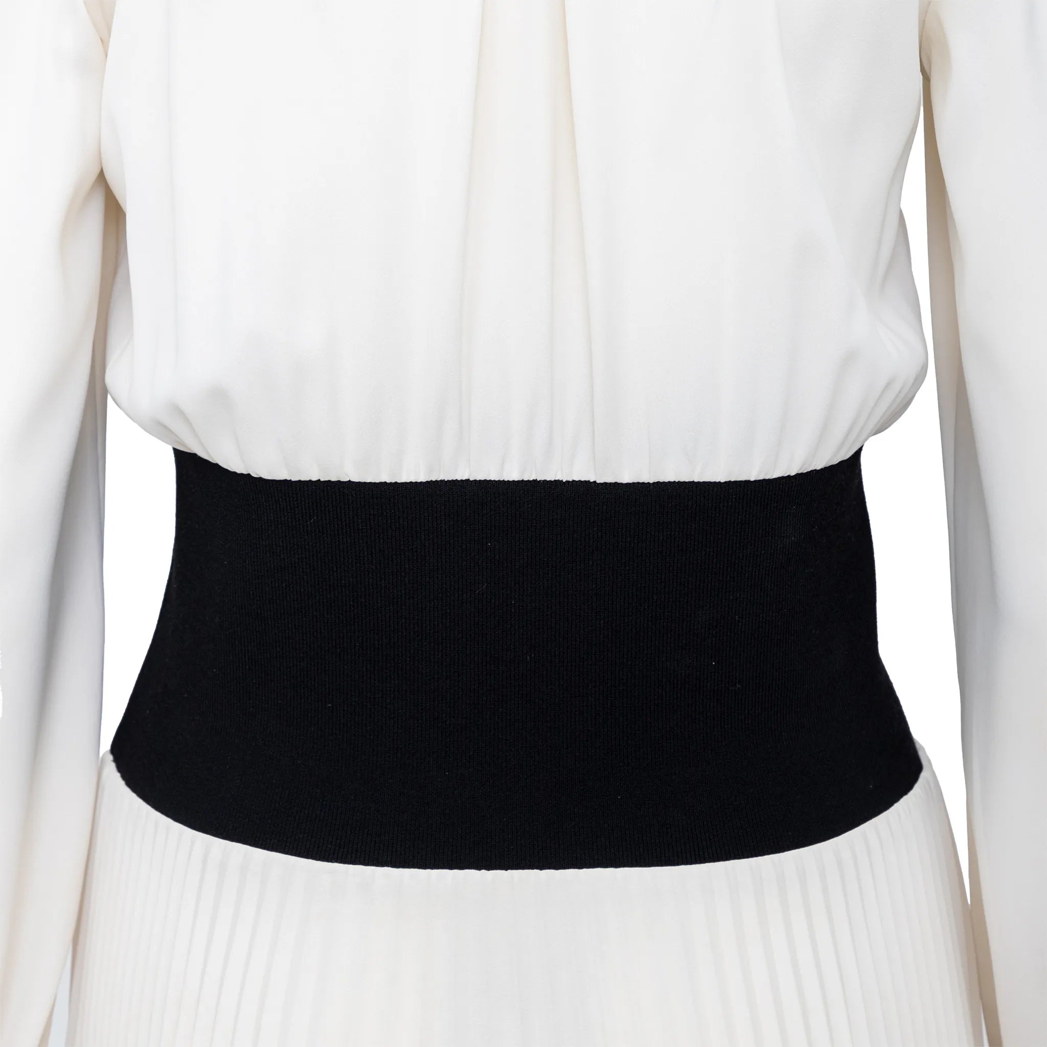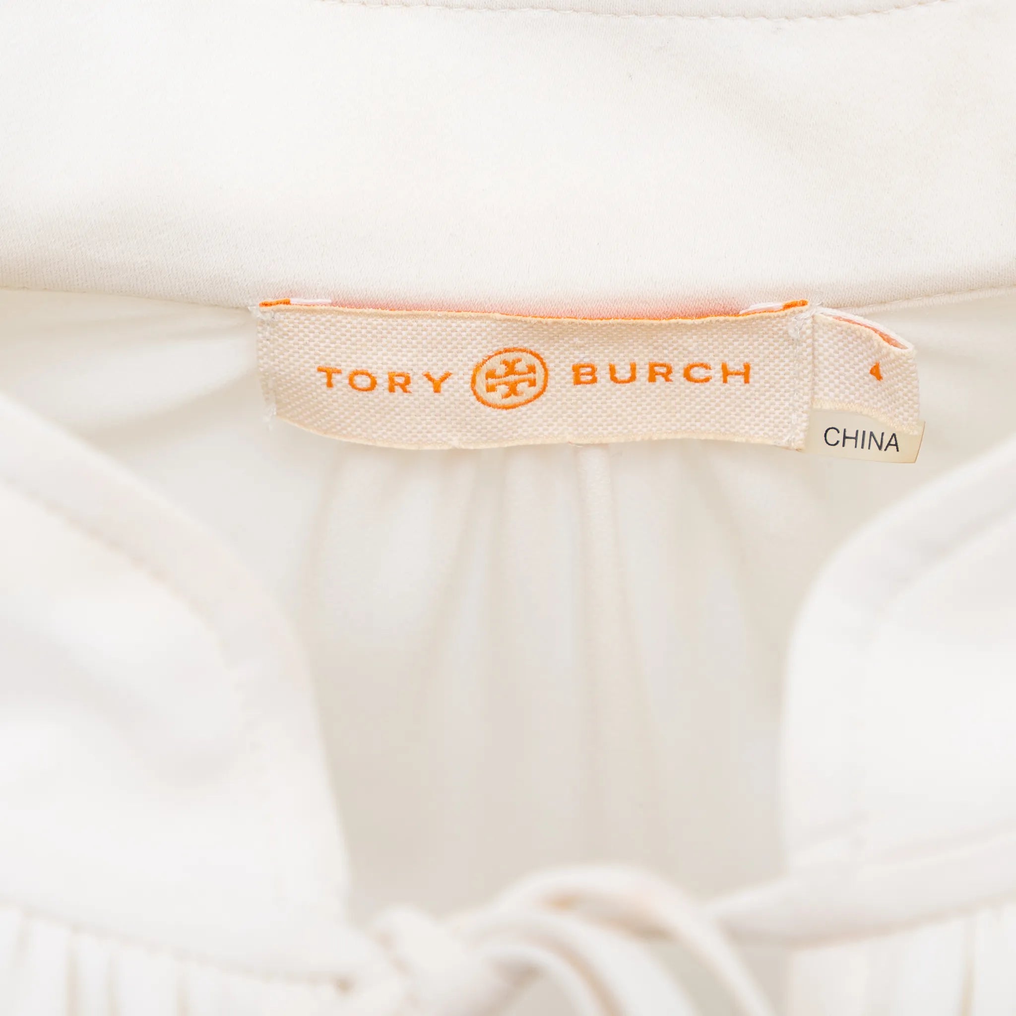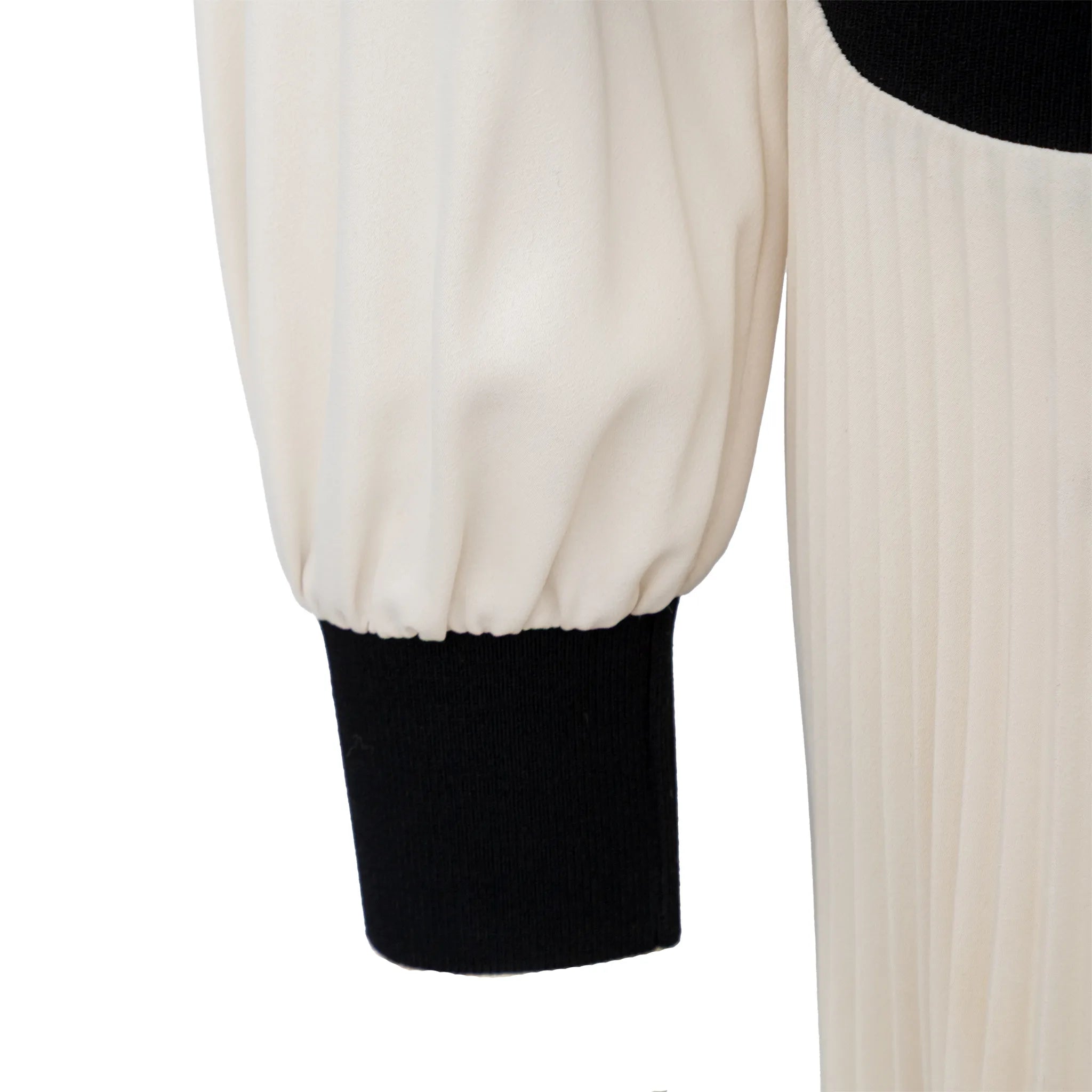 Evoke old‑Hollywood glamour in this Tory Burch pleated midi dress: ivory bodice with contrast waistband, flowy pleated skirt, long sleeves & delicate tie neck.