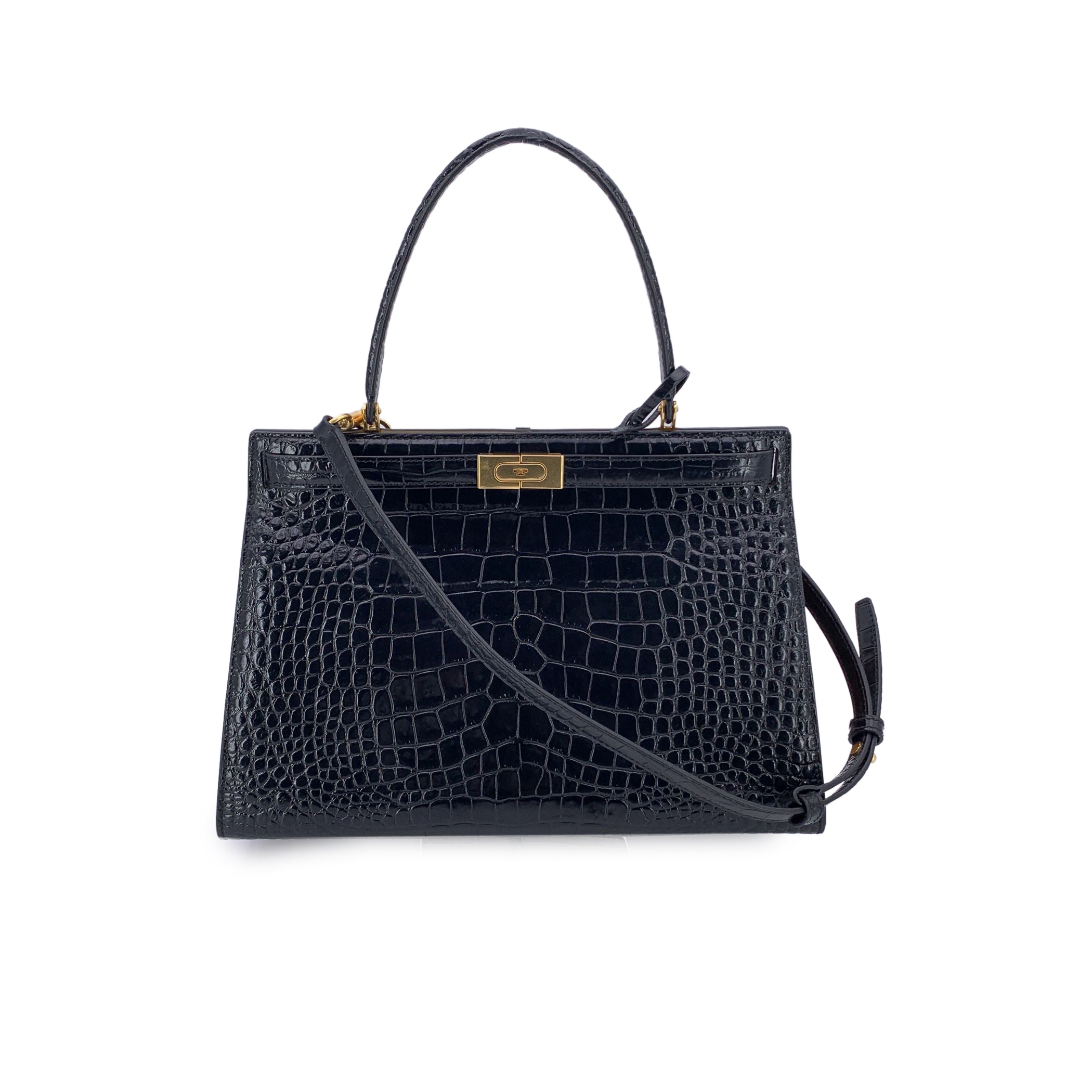 The Tory Burch Lee Radziwill Bag Is a Refined And Elegant Piece, Impeccably Crafted In Luxurious Black Croc-embossed Leather. Inspired By The Timeless Style Of Lee Radziwill-a Woman Celebrated For Her Individuality And Grace-the Bag Exudes Sophistication With Its Structured Frame Silhouette. It Is Detailed With Tory Burch's Signature Lock-and-key Hardware And Includes An Optional Shoulder Strap For Versatile Carrying. The Interior Is Lined With Smooth Leather And Features a Single Side Zip Pocket For Essentials. Both Classic And Contemporary, This Bag Is a Tribute To Bold, Effortless Style.