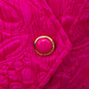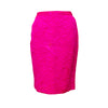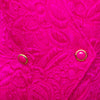 Introducing the Ungaro set from the 90s, featuring a luxurious wool and silk blend fabric in a vibrant fuchsia pink. The set includes a stylish v neck jacket with a two button closure and a flattering midi skirt, both adorned with a beautiful floral jacquard pattern.