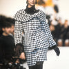 Valentino Boutique Checkered Set from the Fall 1991 collection, featuring white checkered design on brown wool. Includes a long jacket with high neck and buttoned midi skirt.
