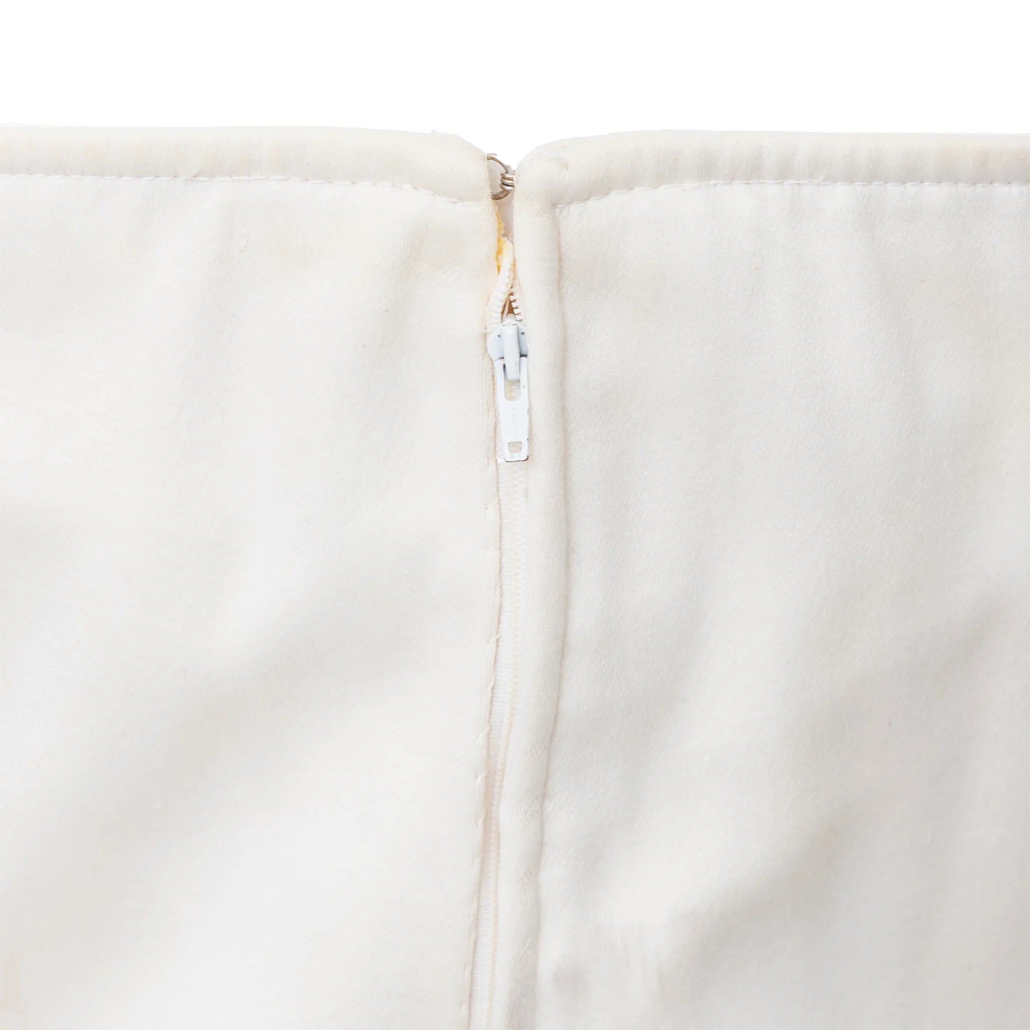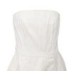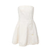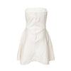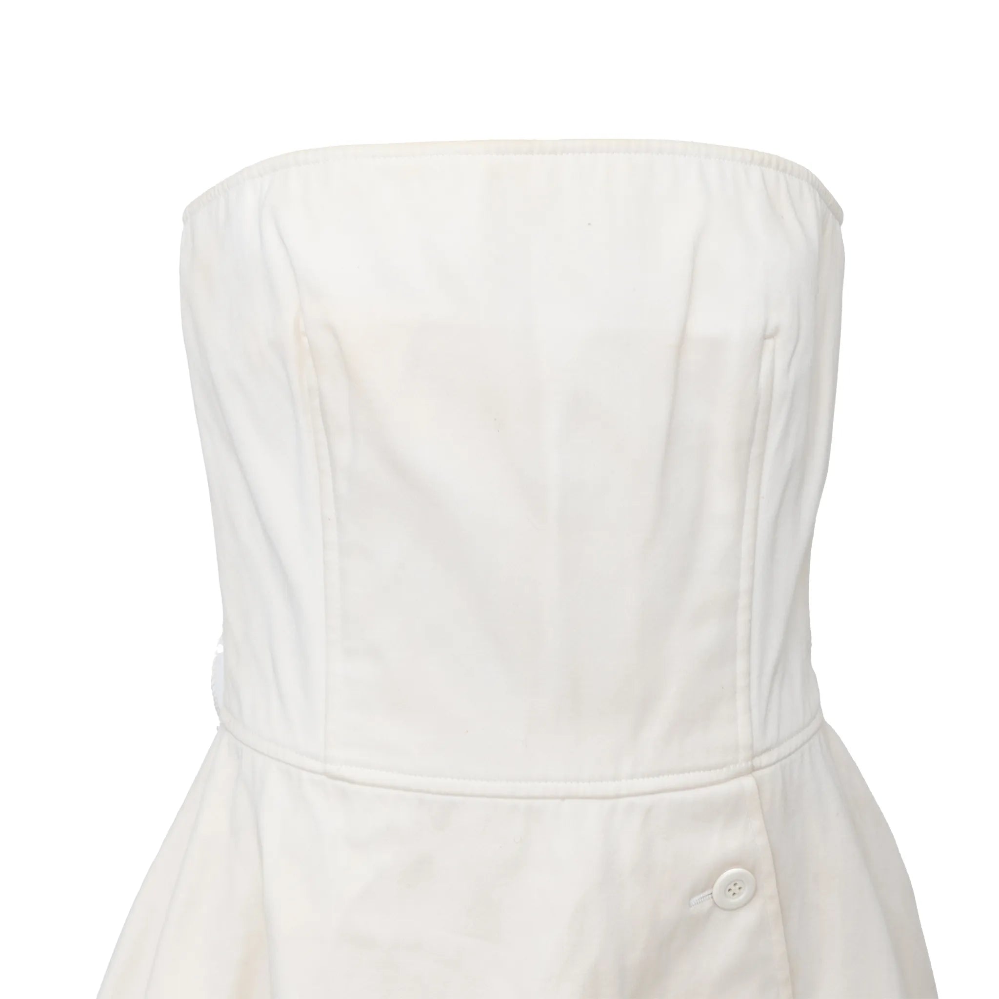Valentino Boutique mini dress with internal boning corset, strapless tube bodice, A-line silhouette with button details, side pockets & hidden back zip.