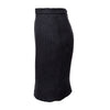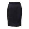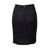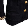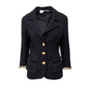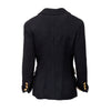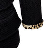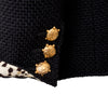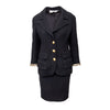 Elevate your wardrobe with this Valentino Boutique set from the Fall 1991-1992 collection. Made from textured wool in classic black, the long jacket features a notched lapel collar and 3 striking golden turtle buttons, while the sleeve hem adds a touch of leopard print. The midi skirt has a sleek zipped back with button closure.