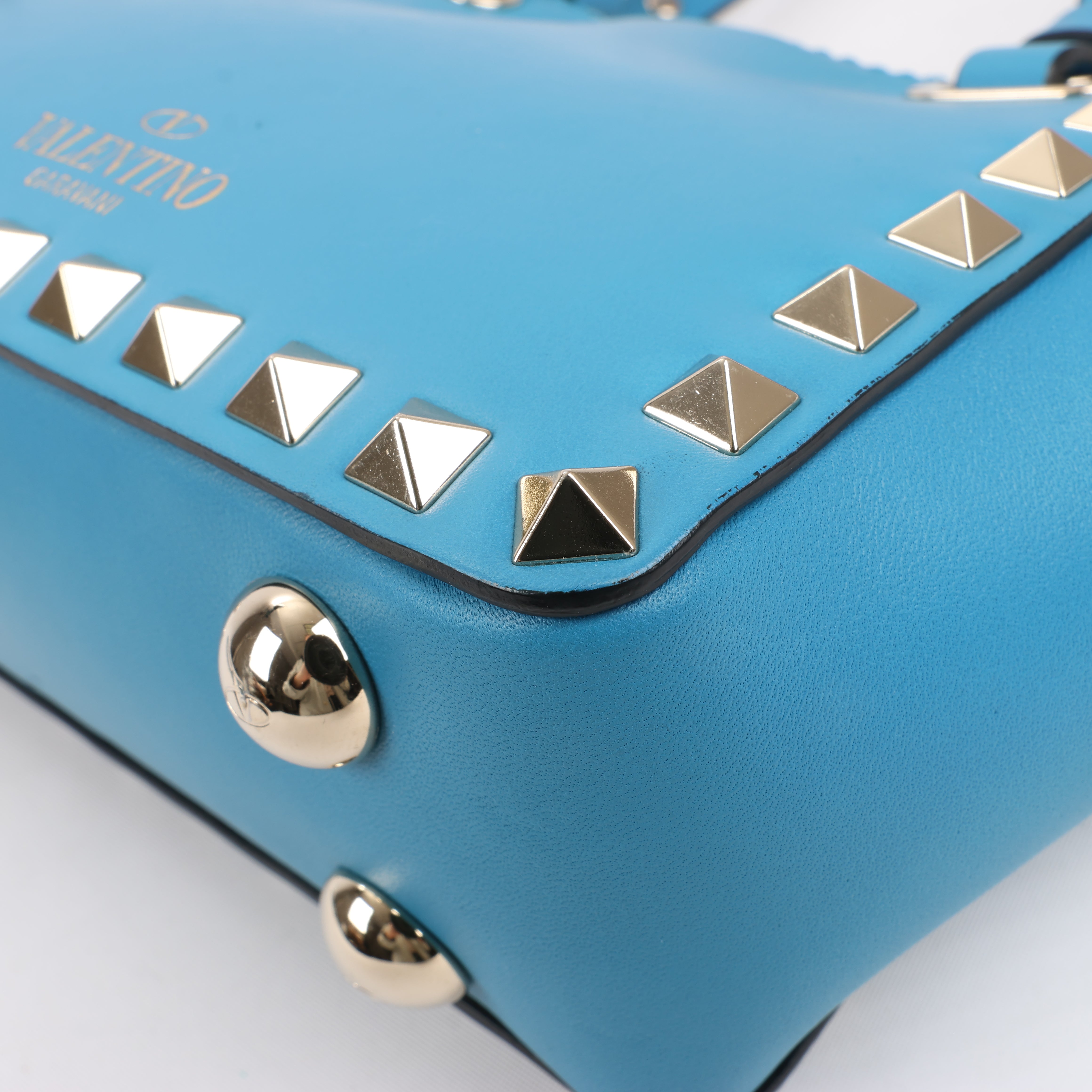 Brand: Valentino GaravaniModel: RockstudSize: MiniWidth: 15 cmHeight: 11 cm Exterior Condition: ExcellentInterior Condition: ExcellentCondition Details: The exterior leather remains clean and beautiful. The handle and shoulder strap is in great condition. The hardware is bright and shiny with some hairline scratches. The interior lining is in good condition with some light orange spots. Top width is 21 cm.Colour: BlueInterior Colour: BeigeHardware Colour: GoldMaterial: LeatherComes With: Shoulder strap