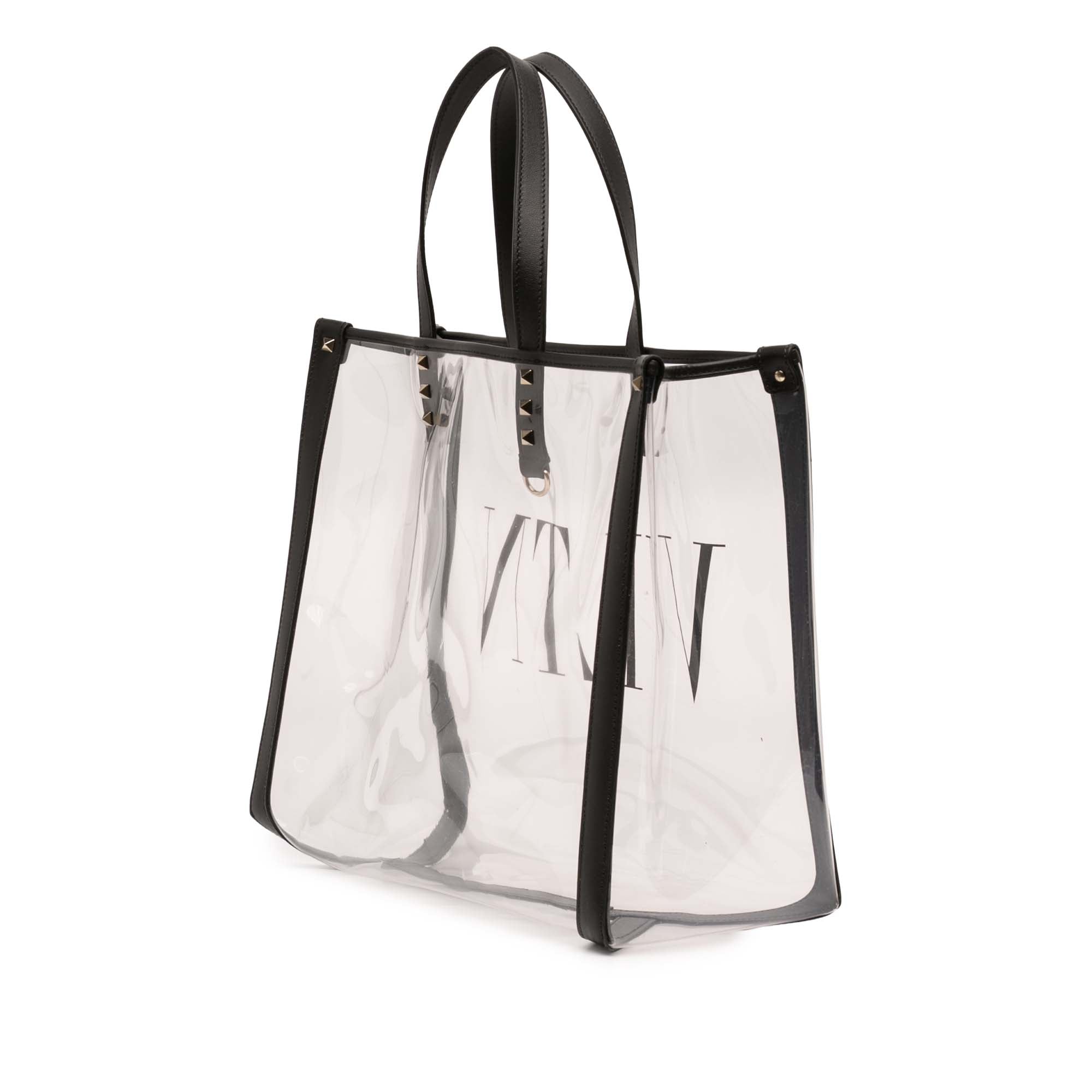 The VLTN tote bag features a plastic body with leather trim, flat leather handles, an open top, and a detachable zip pouch. Retail Price: 600.00