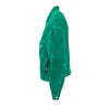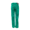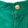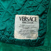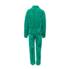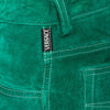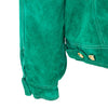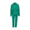 Green suede leather set by Versace Jeans Couture label, featuring a relaxed-fit jacket with gold logo-embossed buttons and straight-leg pants finished with raw edge hems for a bold statement look.