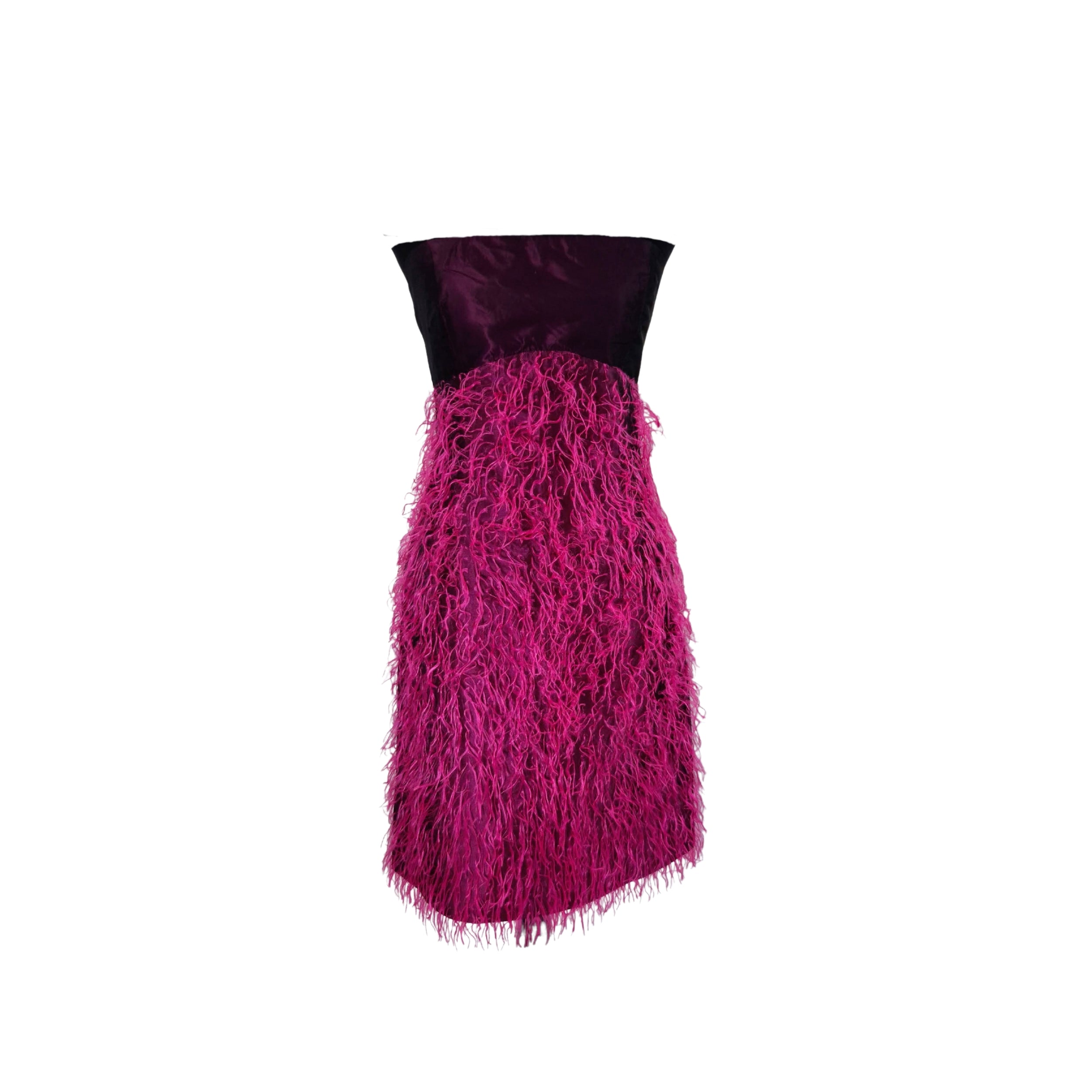 Versace 2000s strapless minidress. Purple and pink with a special texture that resembles feathers and gives movement to the skirt. Viscose lining. Made in Italy.