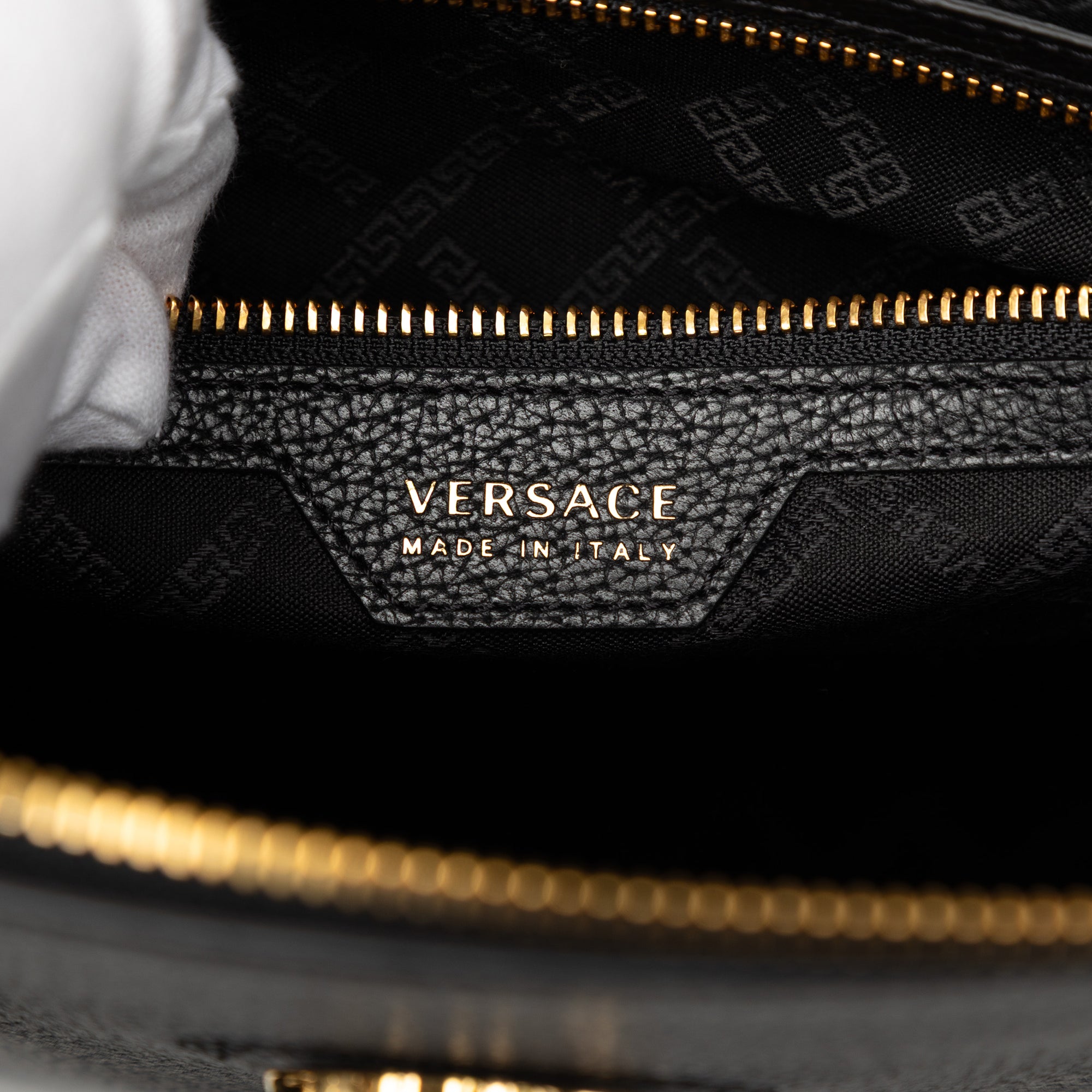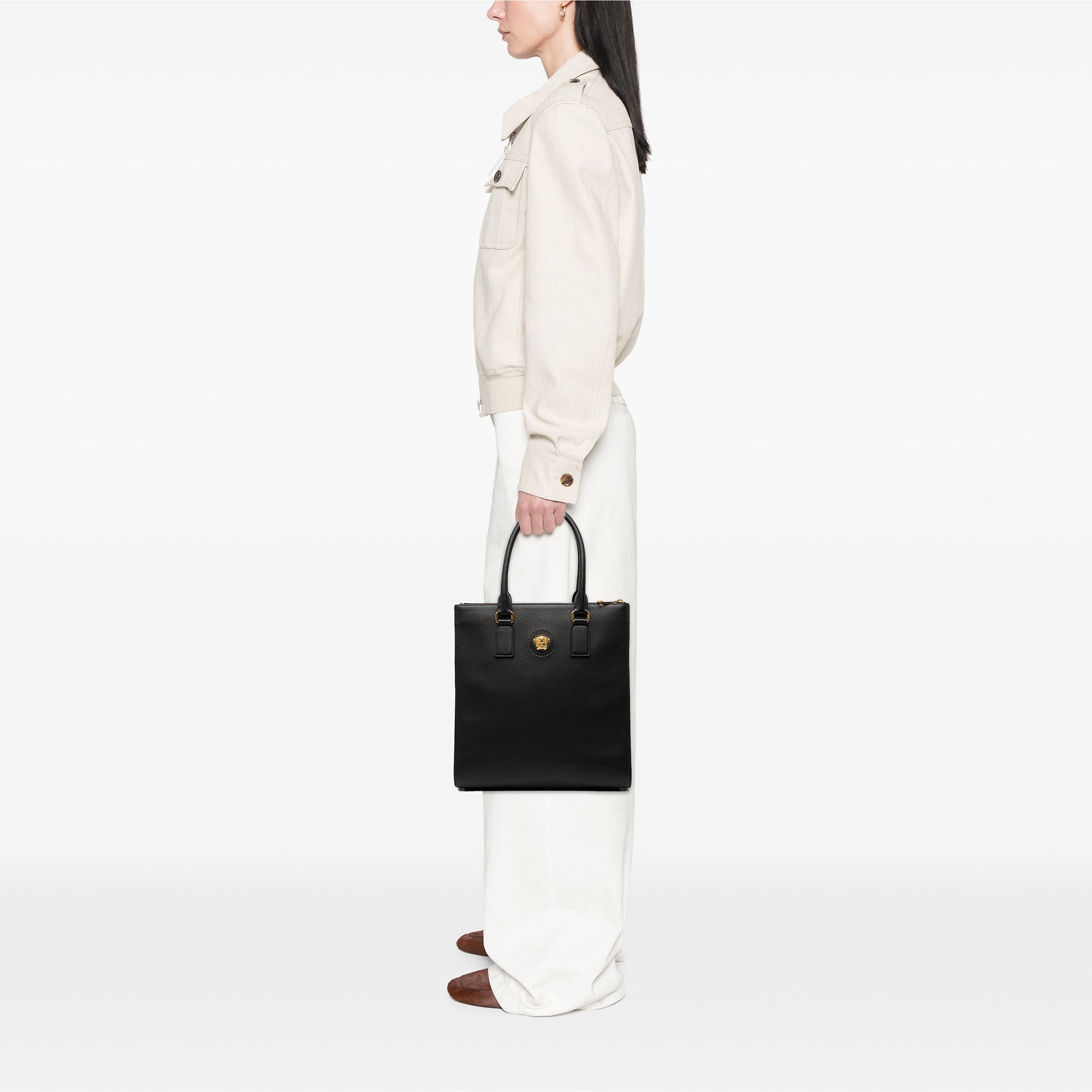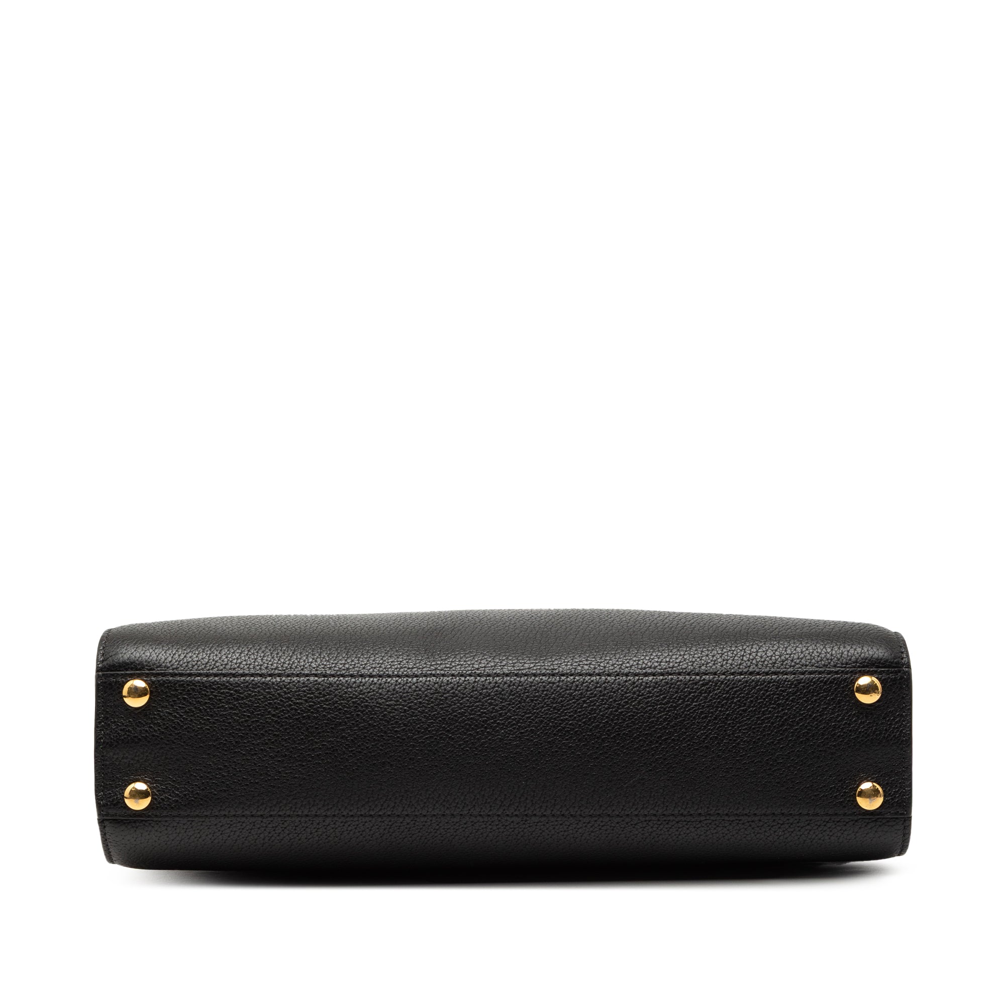 This tote bag features a leather body with gold-tone hardware, rolled leather handles, a top zip closure, an exterior slip pocket, and interior zip and slip pockets. Retail Price: 1700.00